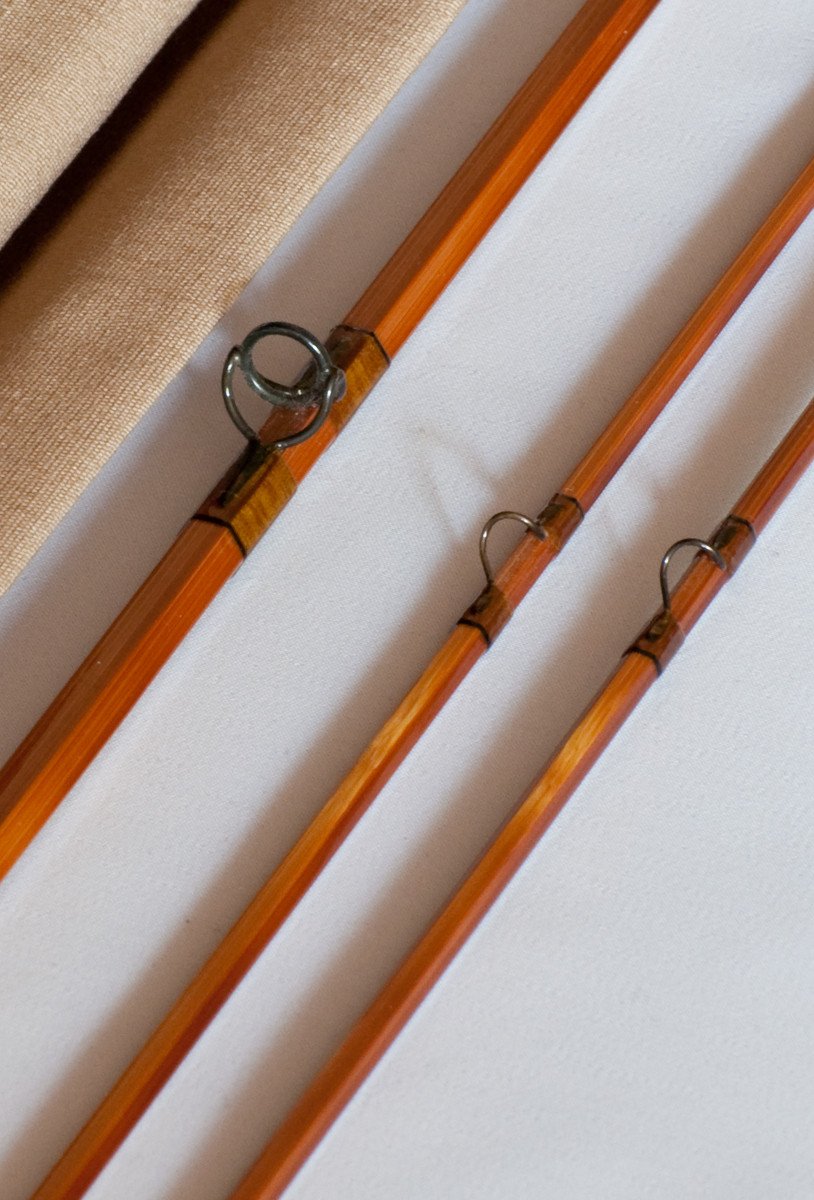 For sale here is a Jon Parker bamboo rod - 8' 2/2 for a 6 weight line. Excellent+ condition. 5 3/8 oz. Nice up-locking nickel silver reel seat over a maple spacer; very powerful medium fast action. A very nice rod from a very well respected builder. Some of the wraps have a "frosting" effect but this is only cosmetic as none of the silks are loose or cracking. Overall, this is a very fine example of Jon's work and a very nice casting 6 weight rod.