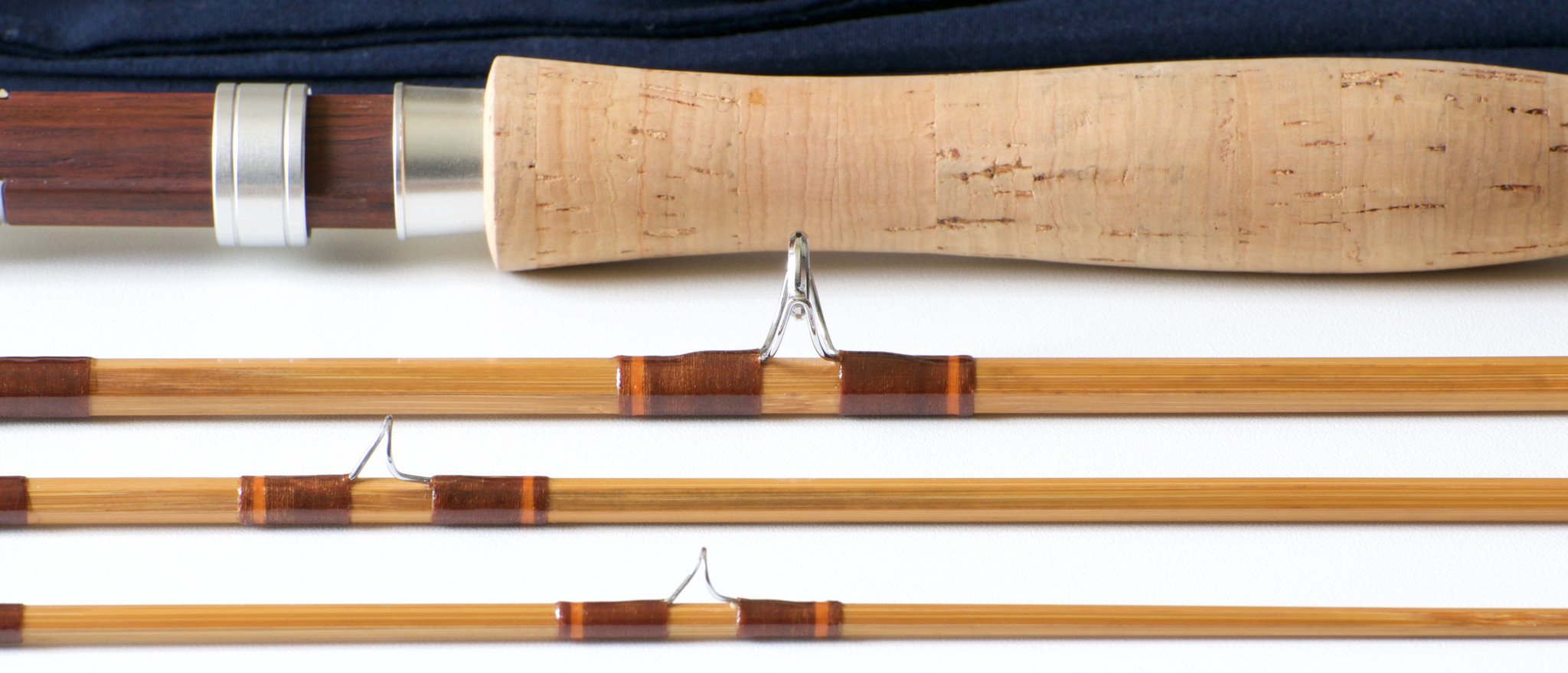 For sale here we have a Partridge of Redditch "Poacher" 7' 4wt 4/1 bamboo rod. Made in England. The rod is in mintcondition. Impregnated cane with chestnut brown silks and amber tipping. Four pieces with one tip make this rod incredibly easy to transport, hence the name "Poacher". Western style grip with a swelled nose. Uplocking aluminum reel seat with dark walnut spacer. Blued ferrules size 19/64, 15/64 and 13/64 fit together perfectly and come with bamboo topped ferrule plugs. Rod has a medium-fast dry fly action and weighs 4 5/8 oz. Comes with original bag and replacement Hardy tube.