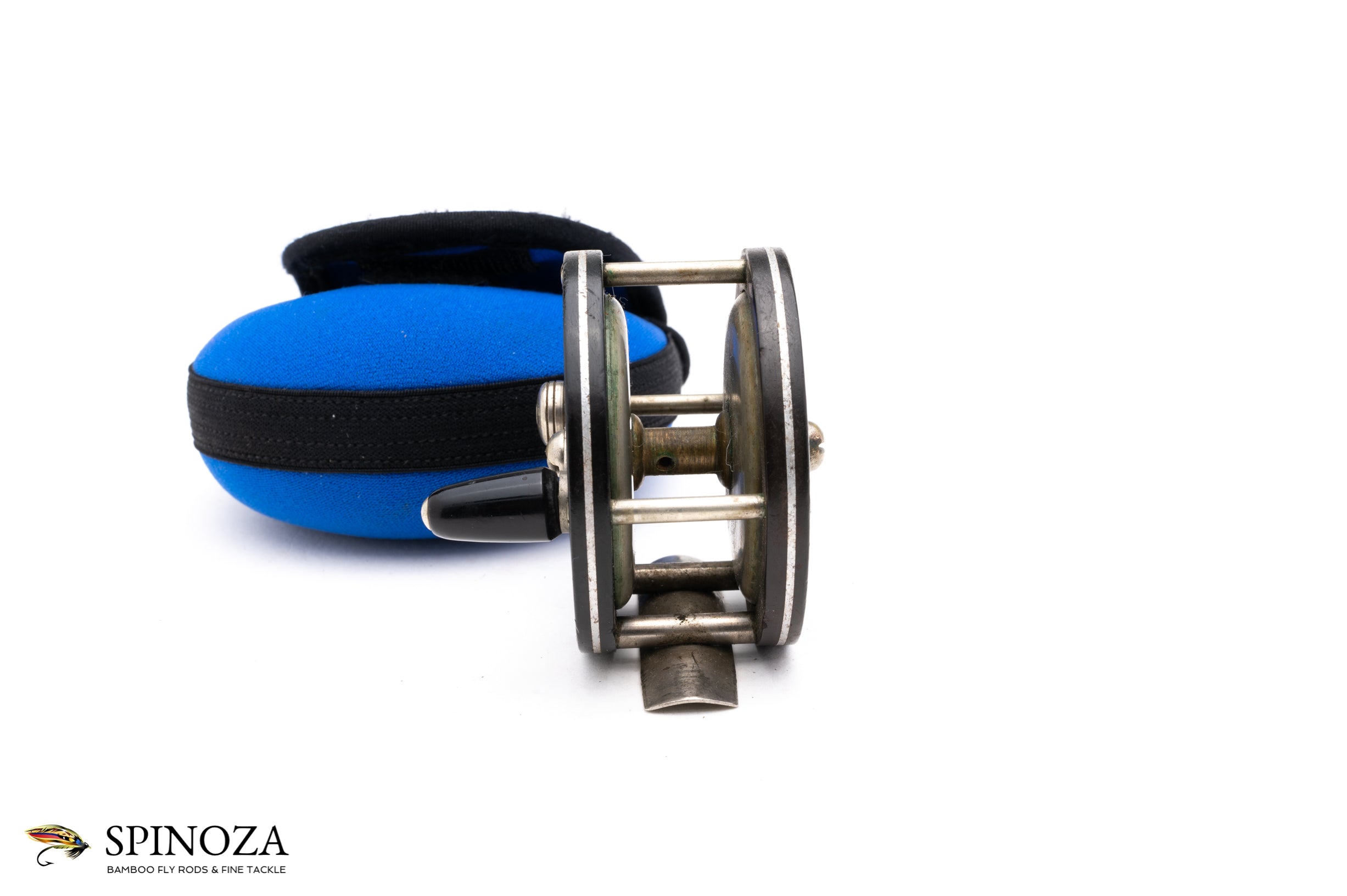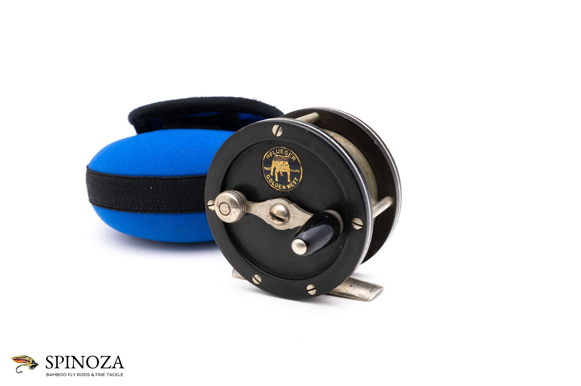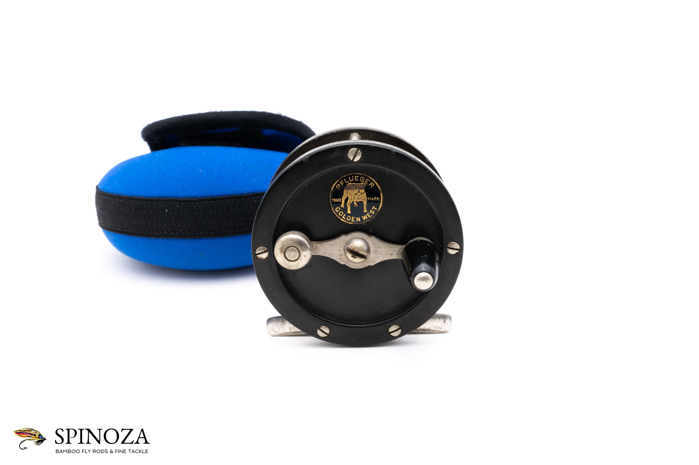A nice little Pflueger Golden West fly reel, 2 1/2" diameter with a fairly neutral bias that might lean LHW. Good used condition with some normal cosmetic wear, and the handle has some slight wobble to it but is certainly serviceable. The initials "AL" are faintly scratched into the frontplate. The spool width is 7/8". The creme de la creme of the Pflueger reel lineup was and remains the Bulldog-trademarked "Golden West". What makes this reel unique is the aluminum sandwiched between two layers of hard rubber to form the rims. Similar to the Hawkeye, the Golden Wests have nickel silver parts and a hard rubber handle as well. Most of the Golden West reels had a serial number stamped into the hard rubber on the backplate. This one reads "6811". Mechanically, this reel is in good condition with a nice strong fixed click. On/off button works as intended. The hard rubber is slightly faded with no cracks. The reel packs into a blue neoprene pouch.