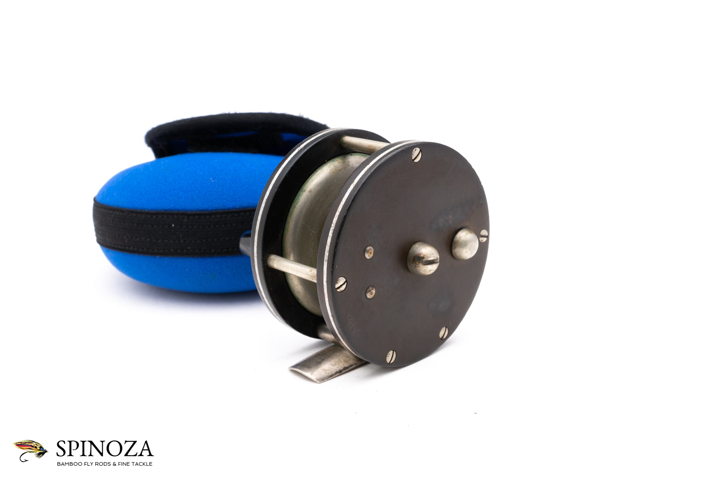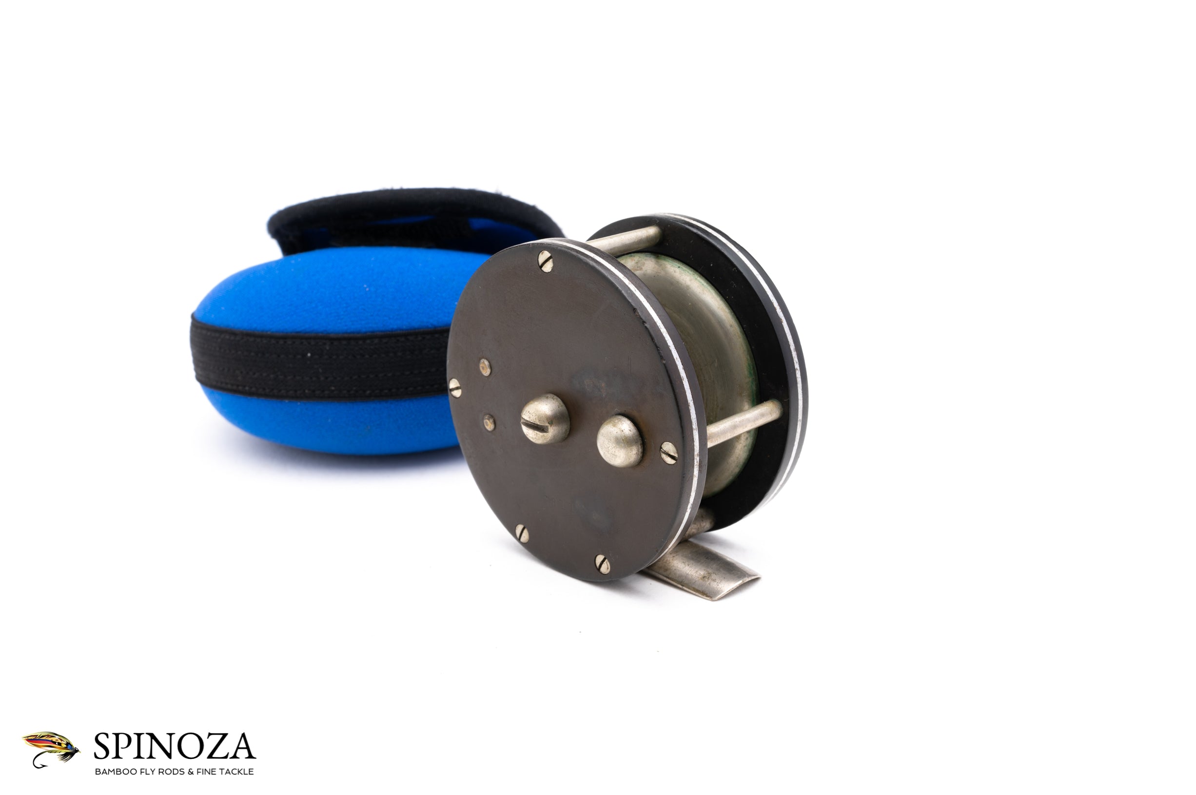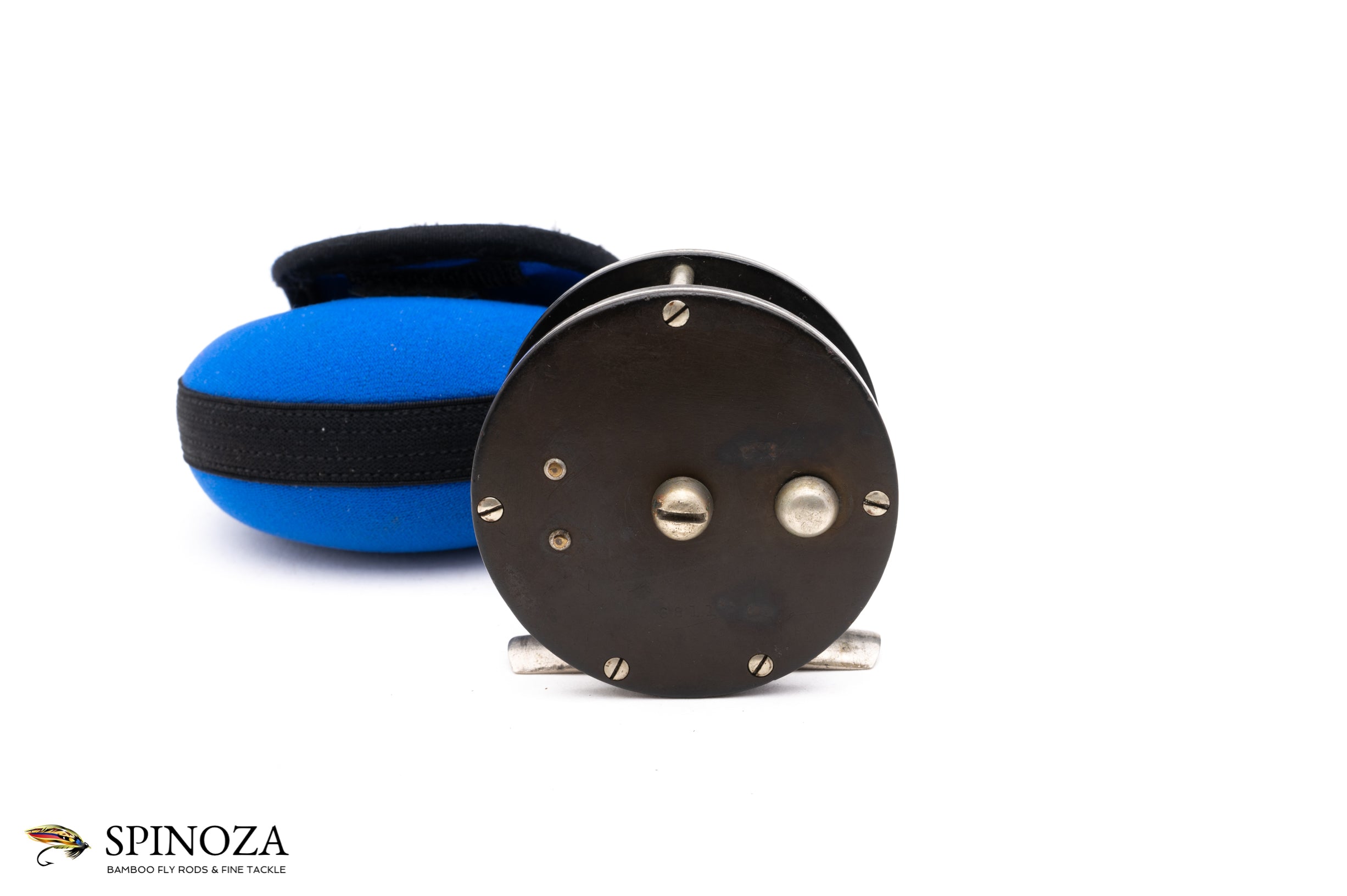 A nice little Pflueger Golden West fly reel, 2 1/2" diameter with a fairly neutral bias that might lean LHW. Good used condition with some normal cosmetic wear, and the handle has some slight wobble to it but is certainly serviceable. The initials "AL" are faintly scratched into the frontplate. The spool width is 7/8". The creme de la creme of the Pflueger reel lineup was and remains the Bulldog-trademarked "Golden West". What makes this reel unique is the aluminum sandwiched between two layers of hard rubber to form the rims. Similar to the Hawkeye, the Golden Wests have nickel silver parts and a hard rubber handle as well. Most of the Golden West reels had a serial number stamped into the hard rubber on the backplate. This one reads "6811". Mechanically, this reel is in good condition with a nice strong fixed click. On/off button works as intended. The hard rubber is slightly faded with no cracks. The reel packs into a blue neoprene pouch.