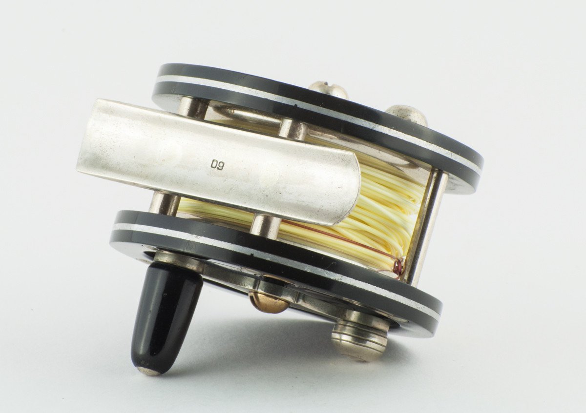 For sale here is a 60 yd Pflueger Golden West fly reel in excellent+ condition. The creme de la creme of the Pflueger reel lineup was and remains the Bulldog-trademarked "Golden West". What makes this reel very unique is the aluminum sandwiched between two layers of hard rubber to form the rims. Similar to the Hawkeye, the Golden Wests have nickel silver parts and a hard rubber handle as well. Most of the Golden West reels had a serial number stamped into the hard rubber on the backplate. This one reads "6812". Mechanically, this reel is in excellent++ condition, very tight and a very strong consistent click. On/off button works as intended.