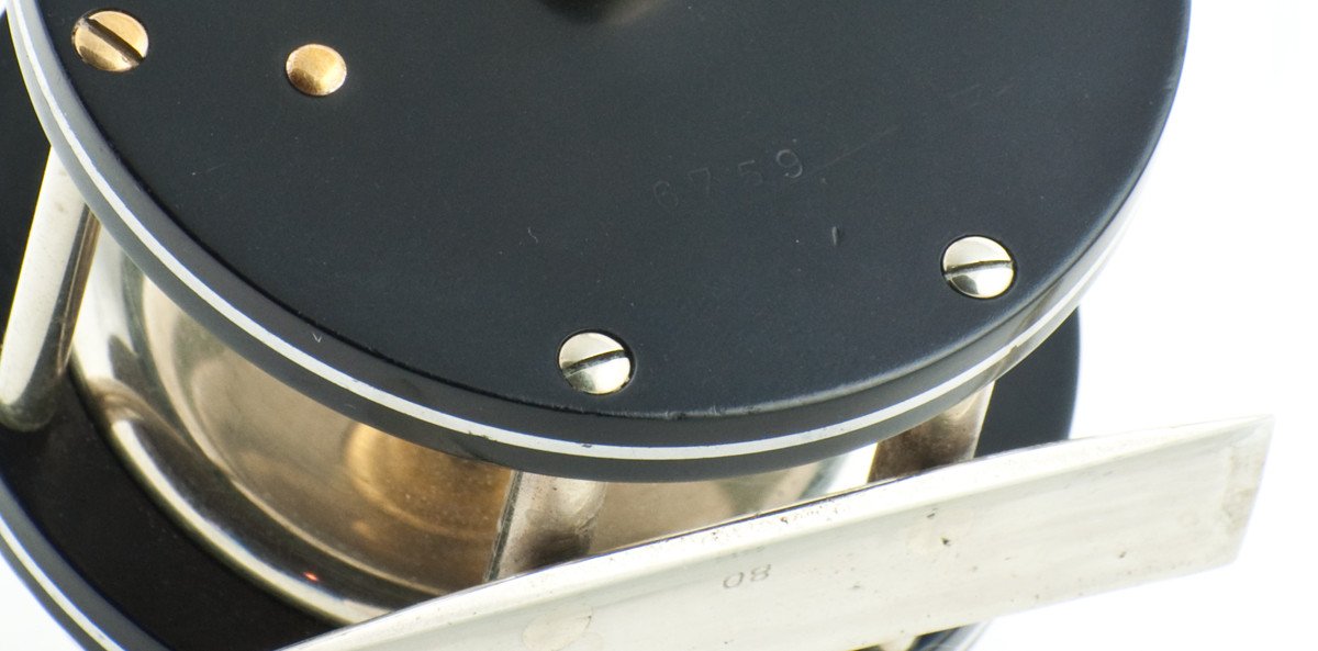 For sale here is a 80 yd Pflueger Golden West fly reel in excellent+++ condition. A superb reel for a 4 weight line. The creme de la creme of the Pflueger reel lineup was and remains the Bulldog trademarked "Golden West". What makes this reel very unique is the aluminum sandwiched between two layers of hard rubber to form the rims. Similar to the Hawkeye, the Golden Wests have nickel silver parts and a hard rubber handle as well. Most of the Golden West reels had a serial number stamped into the hard rubber on the backplate. This one is stamped "6759". Mechanically, this reel is in superb condition, very tight and a very strong consistent click. On/off button works as intended.