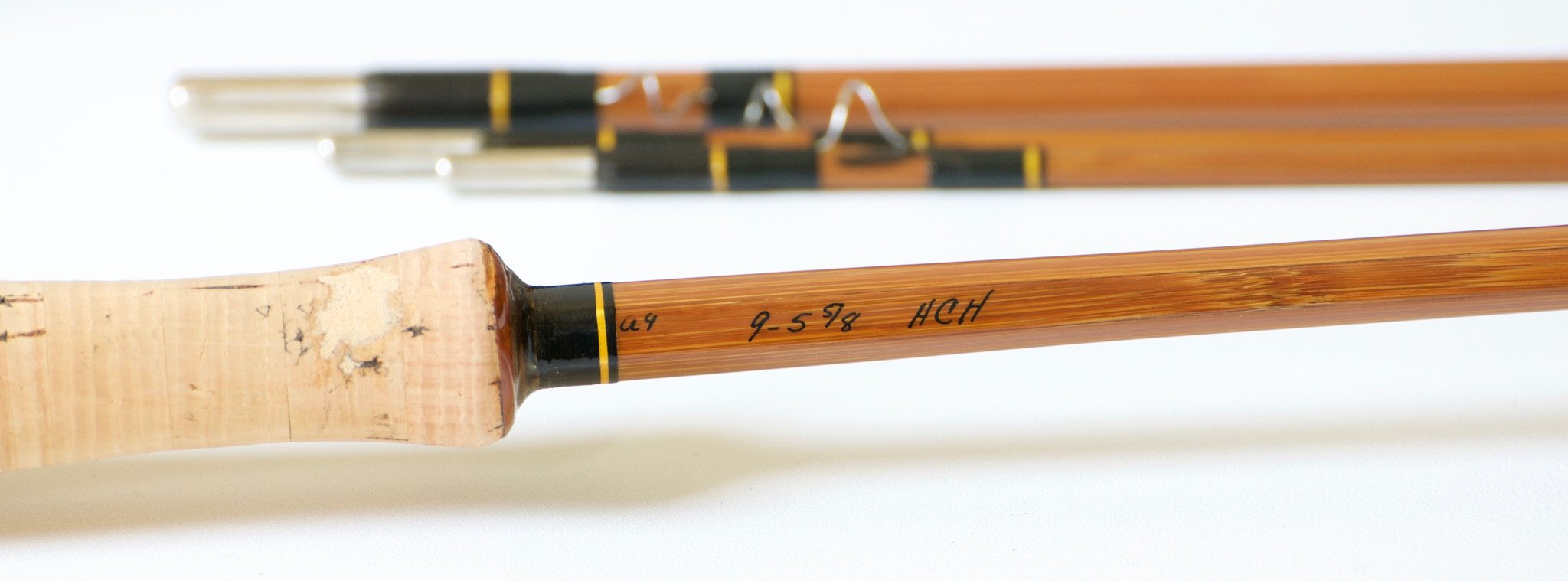 For sale here is a Phillipson Premium bamboo rod. 9' 3/2 for a DT7 line. Medium dark cane, black wraps with gold and black edges, scarce hammer handle grip with downlocking black aluminum reel seat. The nickel silver ferrules are size 18/64 and 12/64 and fit together nicely. The rod is in near mint restored condition. Medium action. The rod weighs 5 3/4 oz. Comes with original bag and the tube is longer than the rod by 2 1/2".