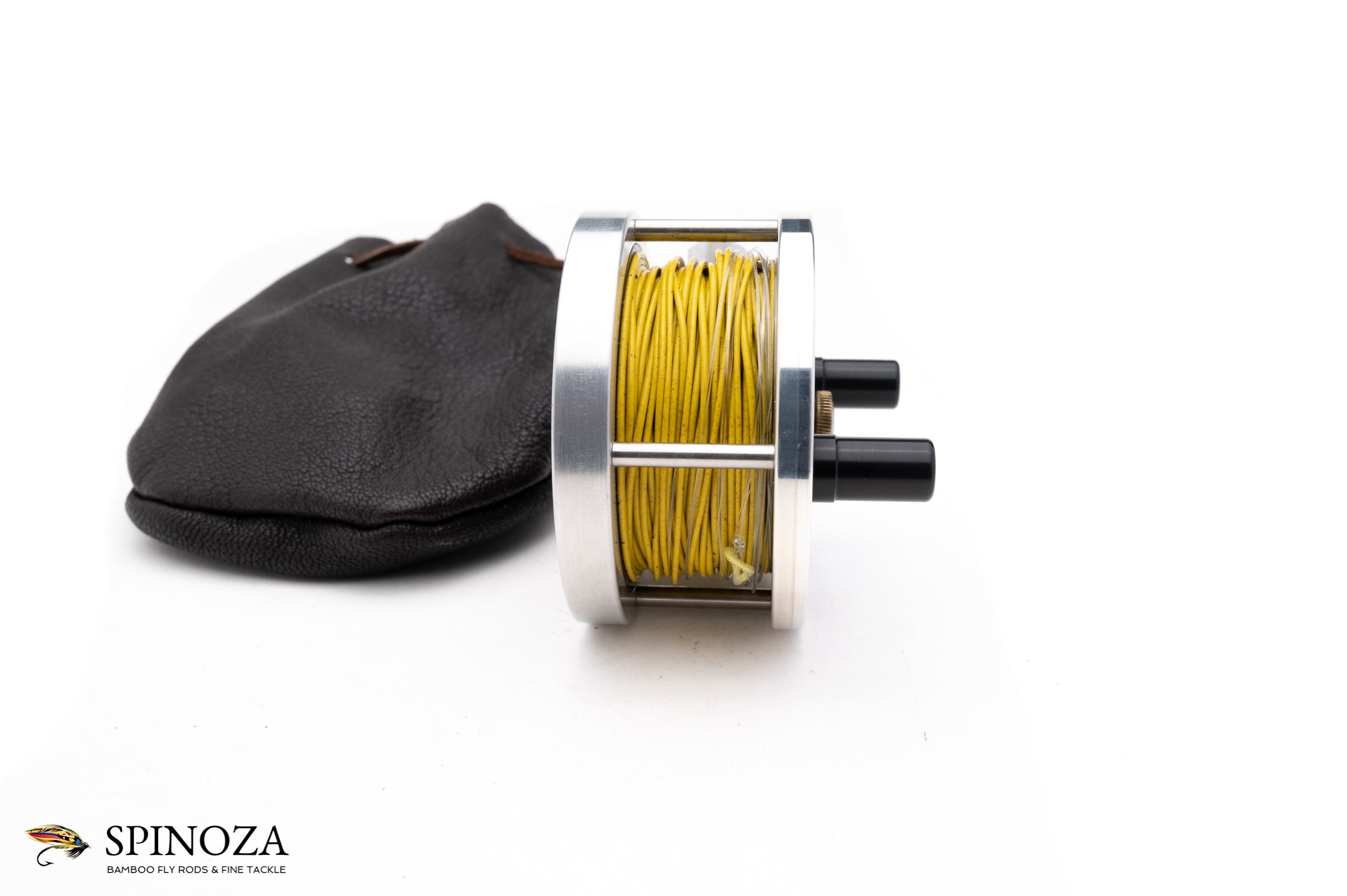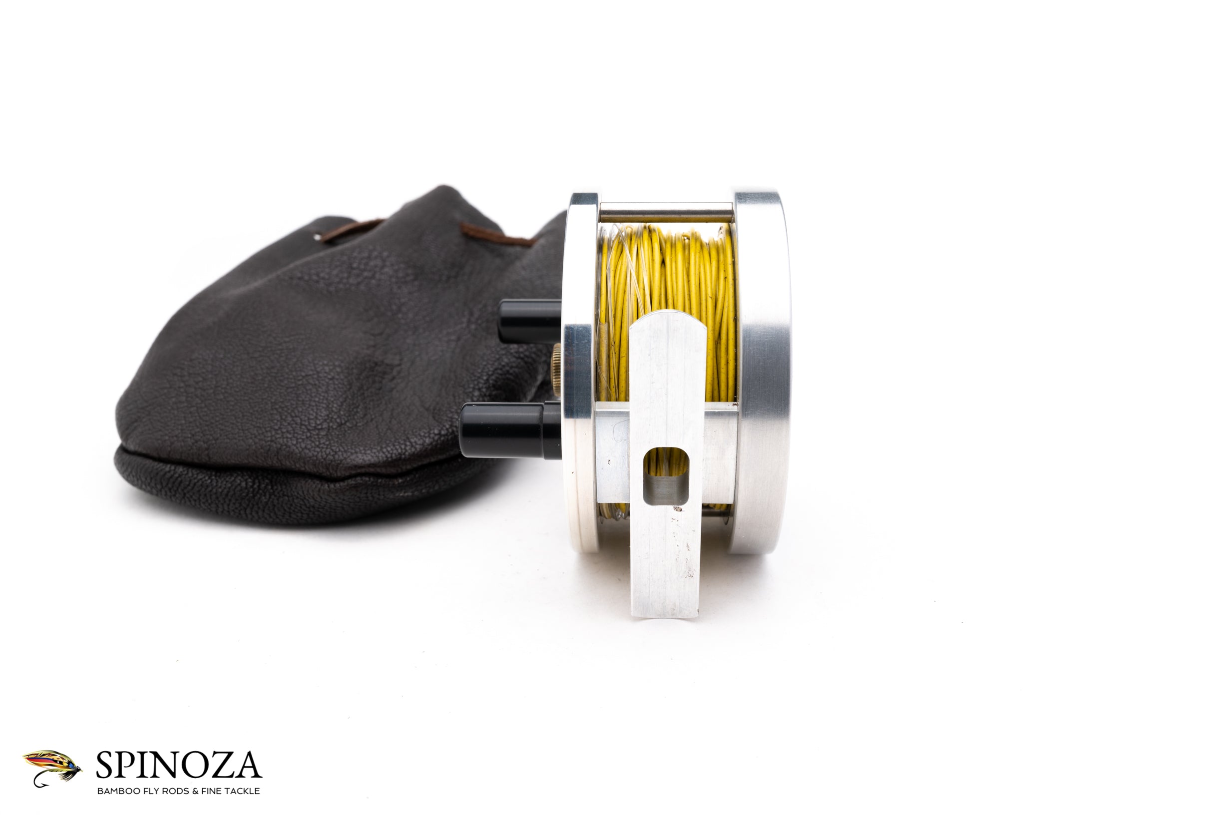 A nice South Creek Limited fly reel, designed by Colorado-based rodmaker Mike Clark and made in the USA. 3" diameter to hold a #5 or #6 line. Set up for LHW, though reversible. Catalog weight of 6.38 ounces. This one is serial #073. Near mint condition with just a whisper of cosmetic wear in a few spots, very clean. I doubt this reel has been fished more than a few times despite the line being loaded on it. Black sideplates with a traditional silver frame, crank, and foot. The crank is stationary on the spool. "South Creek Limited, Lyons Colorado" marked on the faceplate. The reel packs into a leather drawstring pouch.