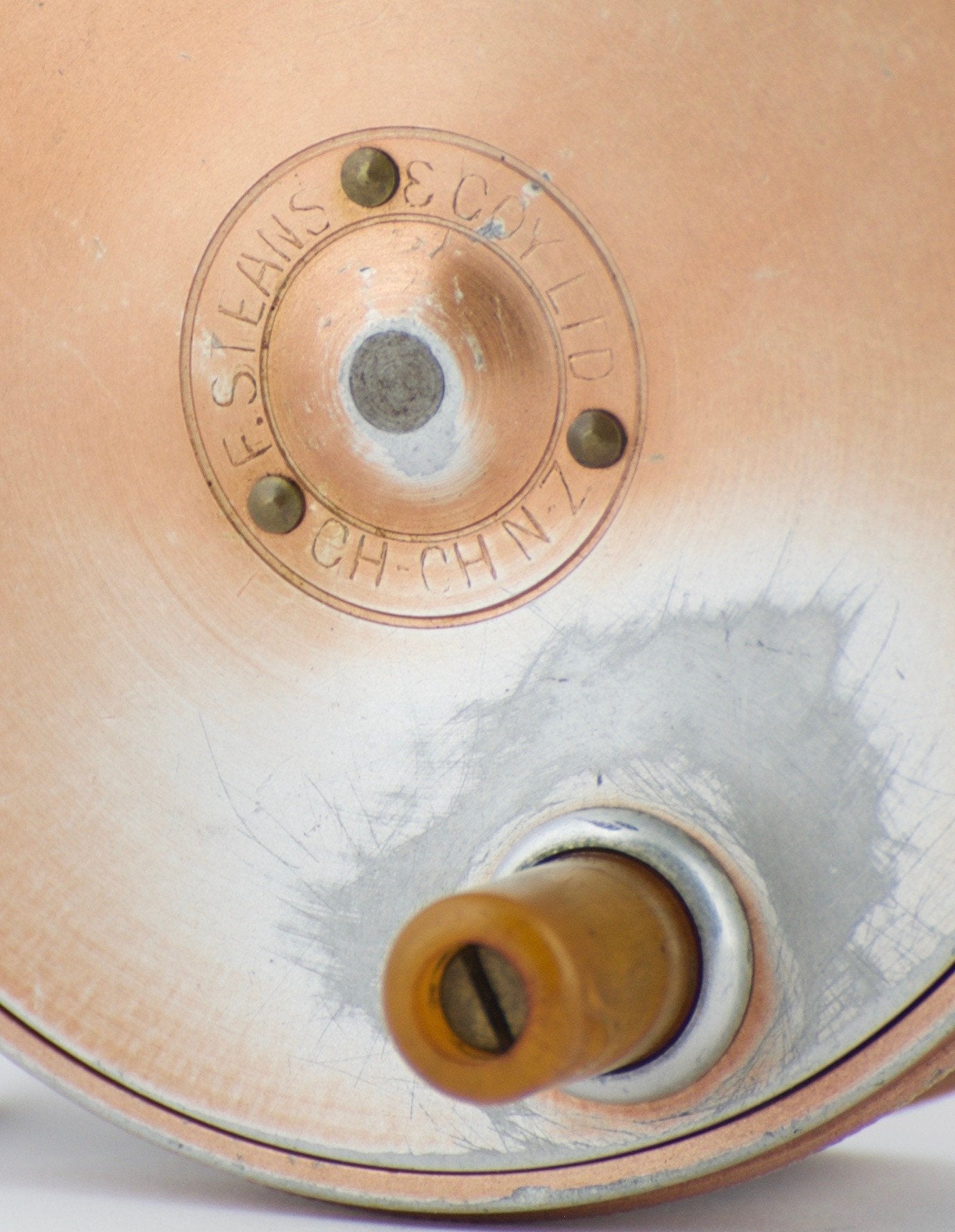 For sale is a very scarce Perfect-style reel made by E.J. Brown and sold by Steans & Co. from New Zealand. 1950s vintage. 3 3/4" diameter. Weight ____ oz. Right hand retrieve. A very solid reel mechanically. No repairs or unoriginal parts exist. The foot has not been shortened or filed. The tension regulator works as intended.