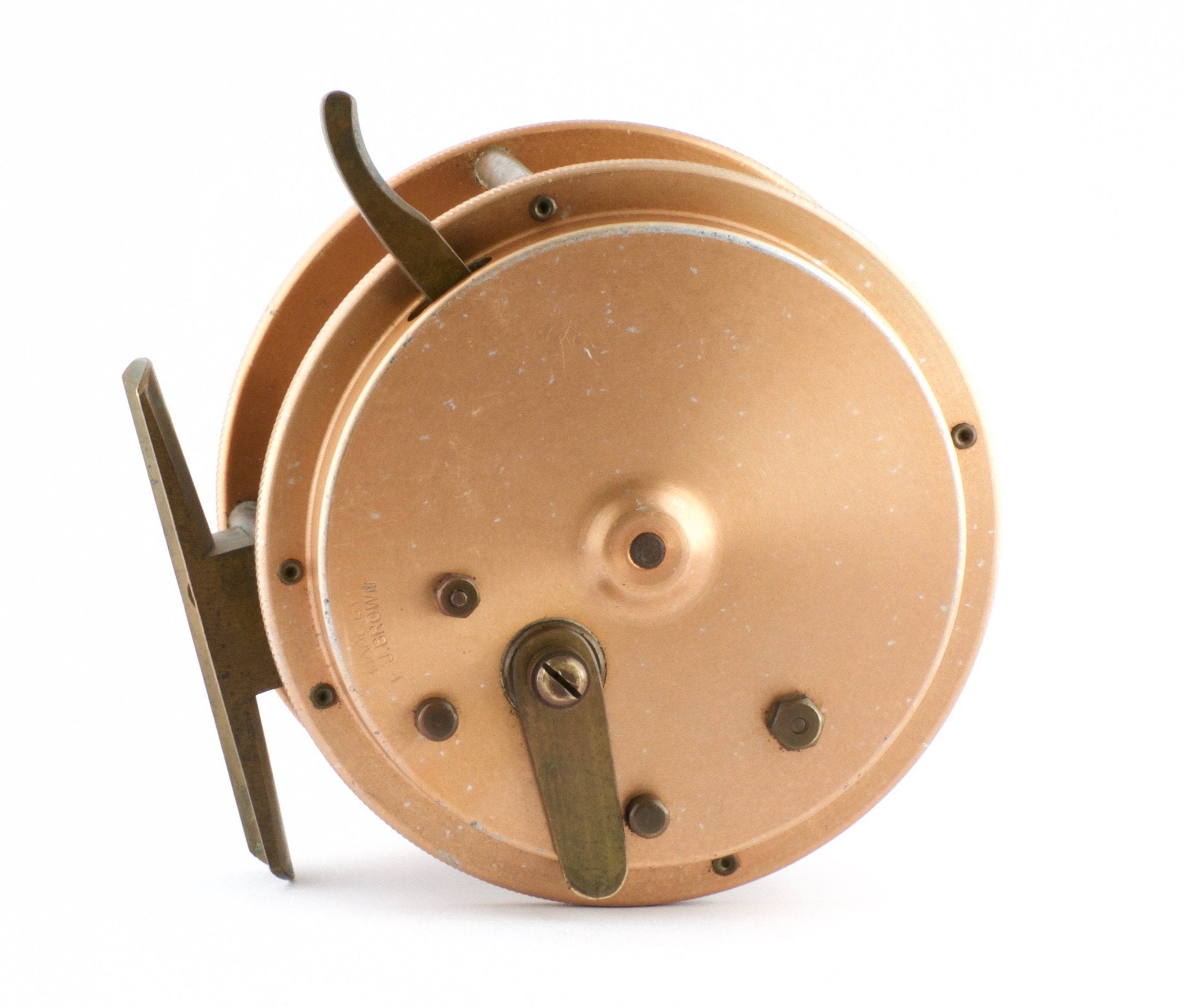 For sale is a very scarce Silex-style reel made by E.J. Brown and sold by Steans & Co. from New Zealand. 1950s vintage. 4 5/8" diameter, 1 1/2" spool width, weight 21 1/4 oz. Right hand retrieve. A very solid reel mechanically. No repairs or unoriginal parts exist. The foot is perfect. The on/off click lever works as intended. The hand brake applies an adequate amount of pressure to the revolving spool while fighting a fish. The spool screw also serves as a startup drag tension setting.
