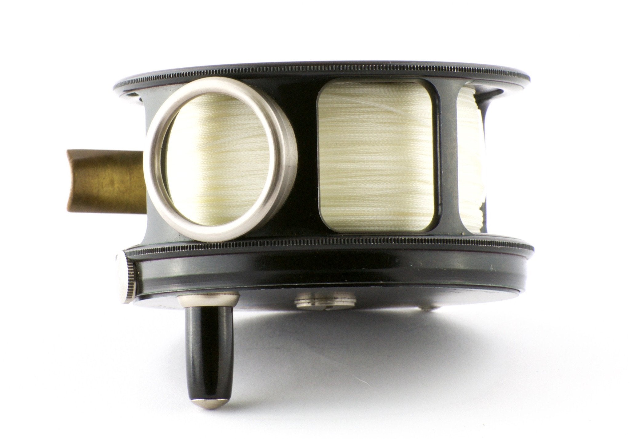 From Dan Homel's book, Antique Fly Reels, A History and Value Guide, "The drag incorporates a separate brake shoe for tension and pawl for click, both mounted upon lever arms fitted to opposite sides of a brake drum. The brake drum is provided with a smooth surface to accommodate the shoe and a toothed area or ratchet for the click pawl. Overall tension can be adjusted in various combinations between the pawl and brake shoe by means of two individual knobs which each drive a spring loaded stem against their respective lever arm. A recessed roller cage houses loosely fitted ball bearings to ease the entire rotation process."