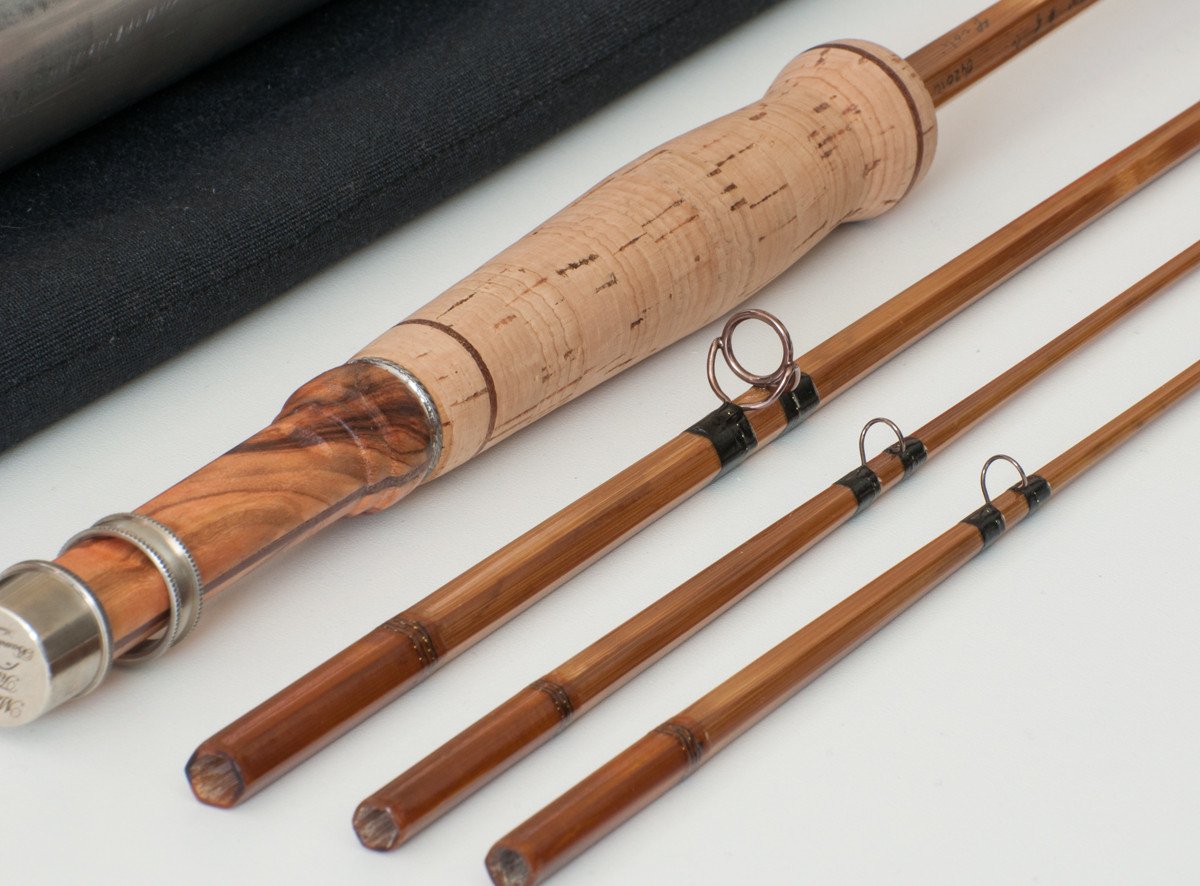 For sale here is a 7'10" #4-5 3/2 hollowbuilt bamboo rod made by Massimo Tirocchi of Italy. A very nice all-around trout rod. This rod exhibits great power through the mid and butt section with an amazingly sensitive tip action for presenting flies. Fast action. The rod works nicely in close due to the sensitive tips, or you can choose to use the power transmitted through the mid and butt sections for longer casts. The suggested line for this rod is a DT4, but it also performs well with a WF5. The rod performs admirably in windy conditions and will have no problem handling fish of considerable size. It sports English-style bronze snake guides and stripping guide. The grip is made of cork rings with mahogany inserts for a very appealing look! Made with Massimo's bamboo ferrules. Nickel silver cap and ring reel seat over a nice handmade olive wood insert. The rod weighs 4 3/4 oz.