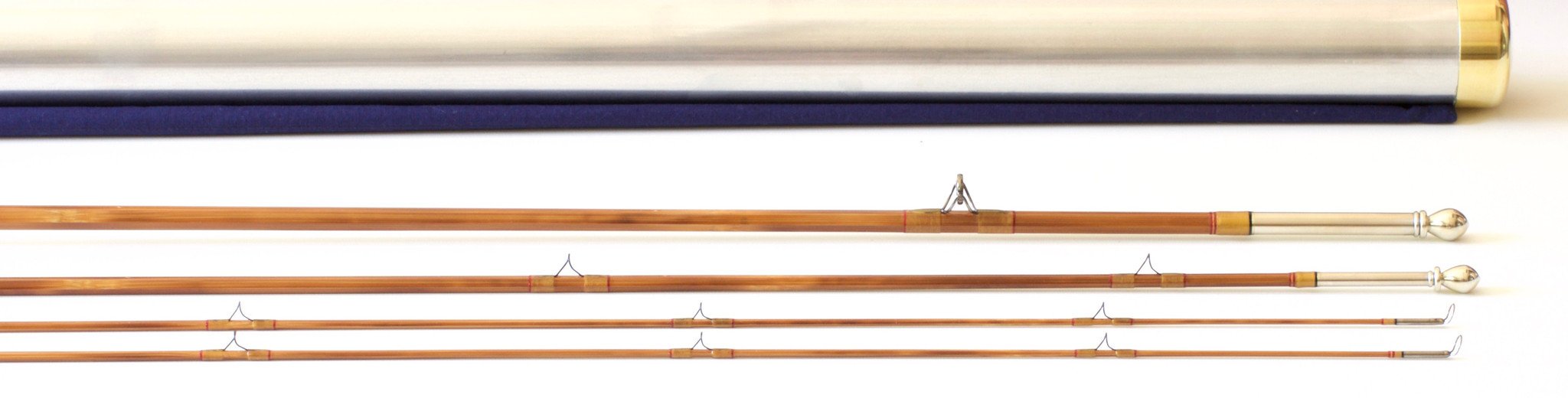Here is the latest from the team of Amelia Tufts and Gabe Batson, an 8' 3/2 5wt bamboo rod. New condition. Amelia and Gabe are cranking out some seriously stunning fly rods. The casting ability of the rods and attention to detail that they put into each rod is tremendous! This latest creation has a beautiful red agate stripper, oxidized guides, bright nickel-silver hardware, and a downlocking reel seat over a stunning Holly wood spacer that resembles ivory! The three-tier nickel silver winding check adds a wonderful artistic touch to the rod. Medium dry-fly action. The rod effortlessly loads a DT5. Feels balanced, light and controlled with plenty of reserve power. Semi-transparent silk wraps tipped with amber. Subtly shaped cigar grip. Polished nickel-silver ferrule plugs. Cotton poplin bag with hang tag, mill-finished aluminum tube. The rod weighs 4 1/2 oz. and the ferrules are size16/64 and 10/64. The tip tops are 0.0775", or 5/64. Don't let this one get away!