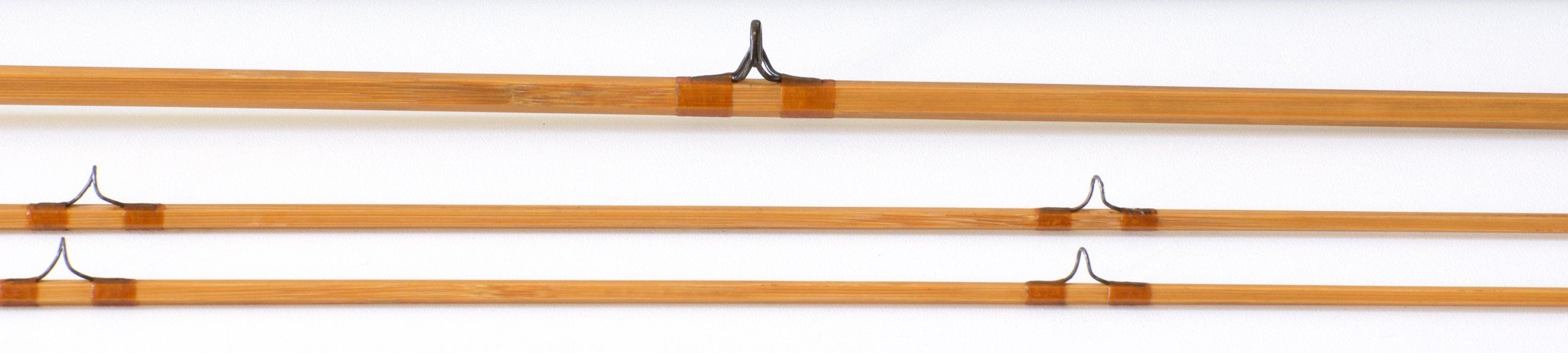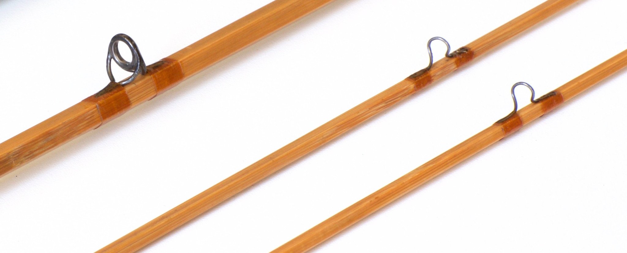 For sale here is a Nat Uslan kit rod. The rod is 7' and for a 4 weight line. This is a five-sided or pentagonal rod. The rod is in very good condition. Both of the tips are straight. The ferrules are tight and pop when pulled apart. The cork is soiled a bit, but only adds character. This rod has a medium fast parabolic action. Nat Uslan was one of the first builders to produce pentagonal bamboo fly rods in the 1950's. This rod was finished out from a Uslan blank by a hobbyist rod builder. The rod is impregnated, Uslan's impregnated rods were from his Deluxe model line. Rod comes with green rod bag and aluminum tube.