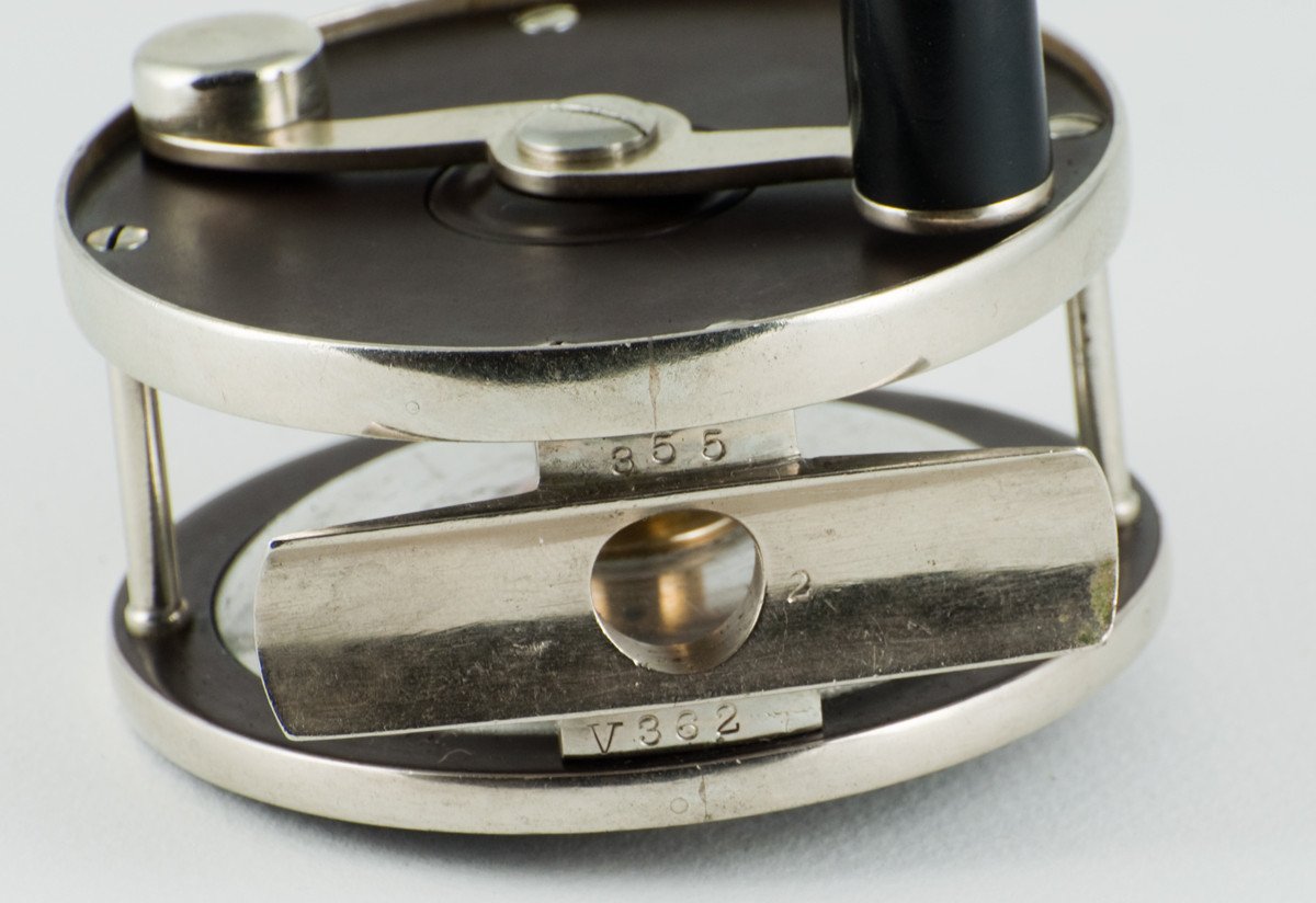 For sale here is a scarce Edward Vom Hofe Model 355 Peerless Fly Reel - Size 2. Nickel silver rims, handle arm screw, counterbalance, sliding click switch, pillars, screws and unmolested reel foot with serial number dating the reel to 1929. The hard rubber side plates are crack-free. Mechanically the reel is in excellent condition as well. The oil cap has the 1896 patent stamp. You will not be disappointed.