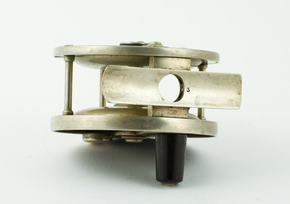 For sale here is a scarce early Edward Vom Hofe Model 355 fly reel - Size 3. Late 19th century reel owing to the lack of model number on the reel foot (instituted at the turn of the century), or serial number (instituted in 1908). This model was later dubbed the "Peerless" in 1911. German silver construction, including the foot and spool. The hard rubber side plates are in good condition with one slight crack on the backplate. There are also a few chips in the hard rubber on the inside rings by the spool and pillars. Mechanically the reel remains in excellent condition. The oil cap has the 1883 patent stamp. The german silver reel foot is full length and unmolested. The reel comes with its original Edward Vom Hofe stamped leather reel case with a missing strap, otherwise in good condition.