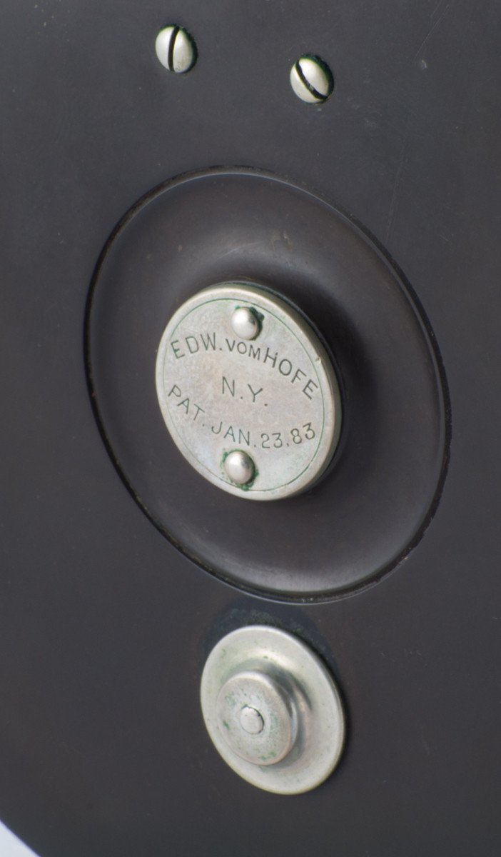 Made in 1890 (before it was called the Restigouche model, which was coined circa 1911). In this time period, the model was referred to as the "Celebrated Salmon and Grilse Click Reel". In the late 1800s this size (4 3/8" diameter) was designated as 5/0 (became size 6/0 circa 1911). The reel is in excellent original condition with no cracks in the hard rubber. This reel carries the Sep 2, 1879 patent on the drag adjustment knob under the handle arm, as well as the Jan 23, 1883 patent mark for the sliding click drag. German silver safety bands and pair of double roller bars. The reel has a strong click and fully functional adjustable pin-in detent drag under the handle (this feature was replaced with the seven detent arrowhead pointer on the front and then the back plate). Full-length and un-filed foot. It is believed that they started stamping the serial numbers on the feet circa 1908. A truly remarkable early example for the Vom Hofe fisherman/collector! Comes with its original Vom Hofe reel case as well in good condition.