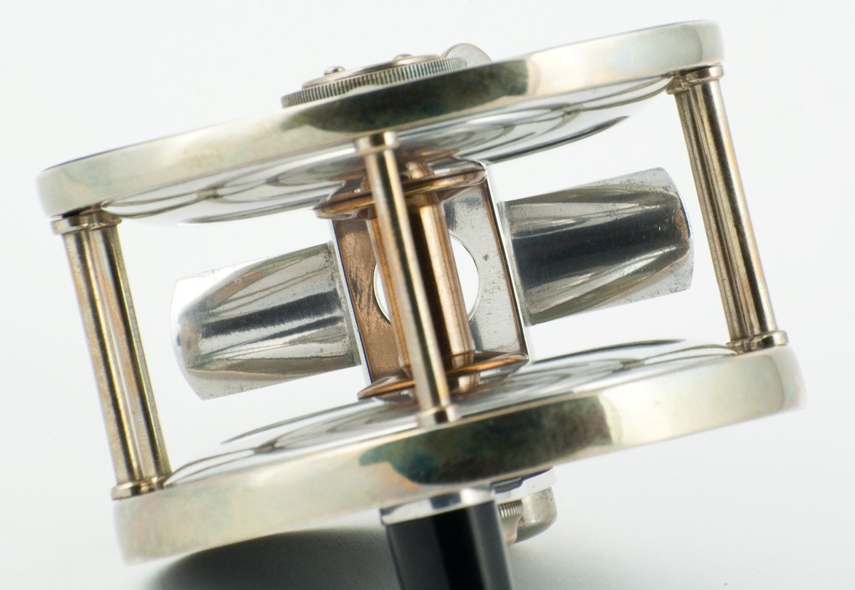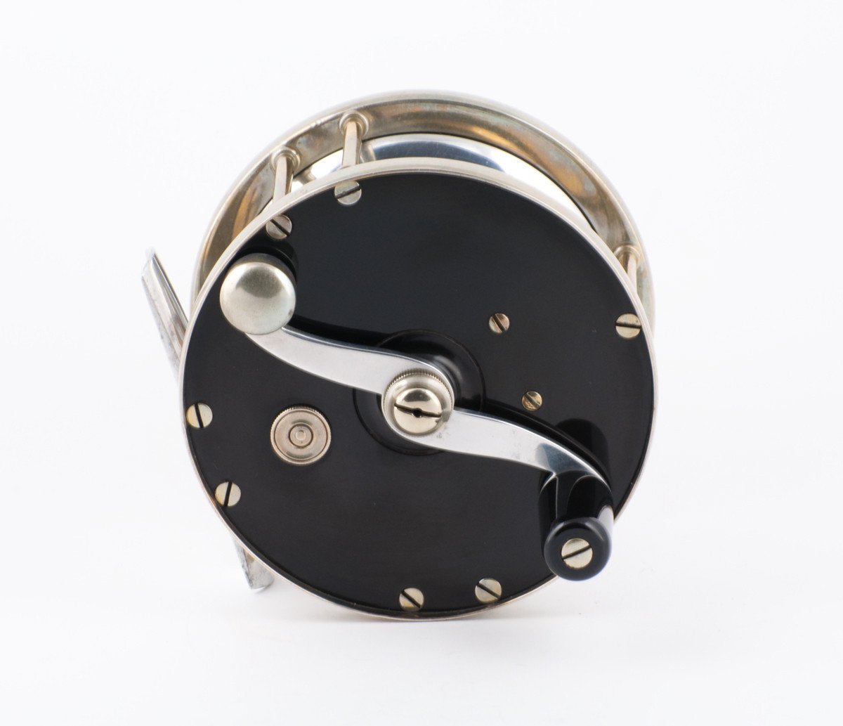 For sale here is an Edward Vom Hofe Model 423 "Restigouche" Salmon fly reel in near mint overall condition. Size 4/0 - 3 7/8" diameter with a width of 1 11/16". This reel carries the '02 patent date on the oil cap. German silver safety bands and pair of roller bars. The reel has a strong adjustable drag and click. This reel has the seven detent arrowhead pointer drag feature with very bright red dot indicators. The reel foot is full length, not filed, and has the model and size stamp but no serial number, leading me to believe it's a replacement foot to fit more contemporary rods. The reel almost looks brand new.