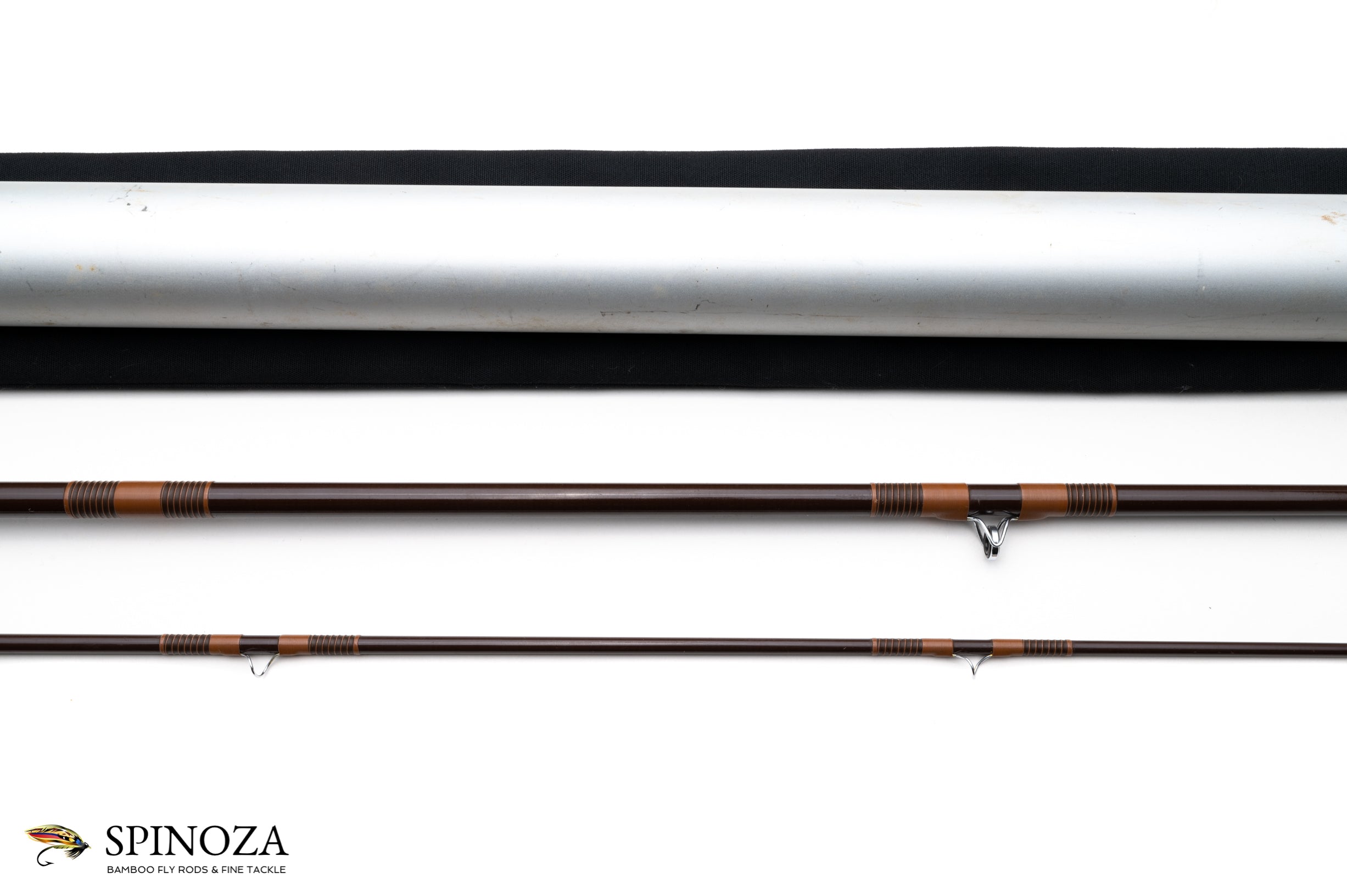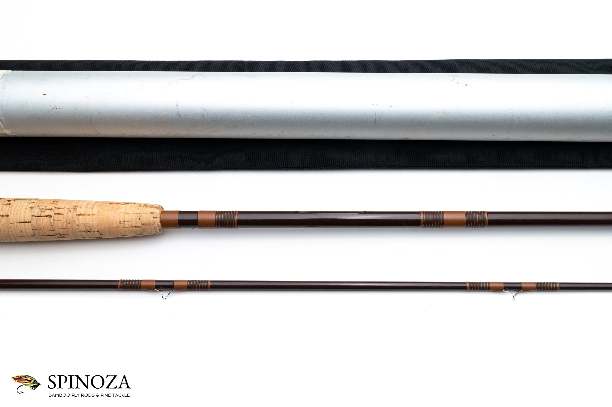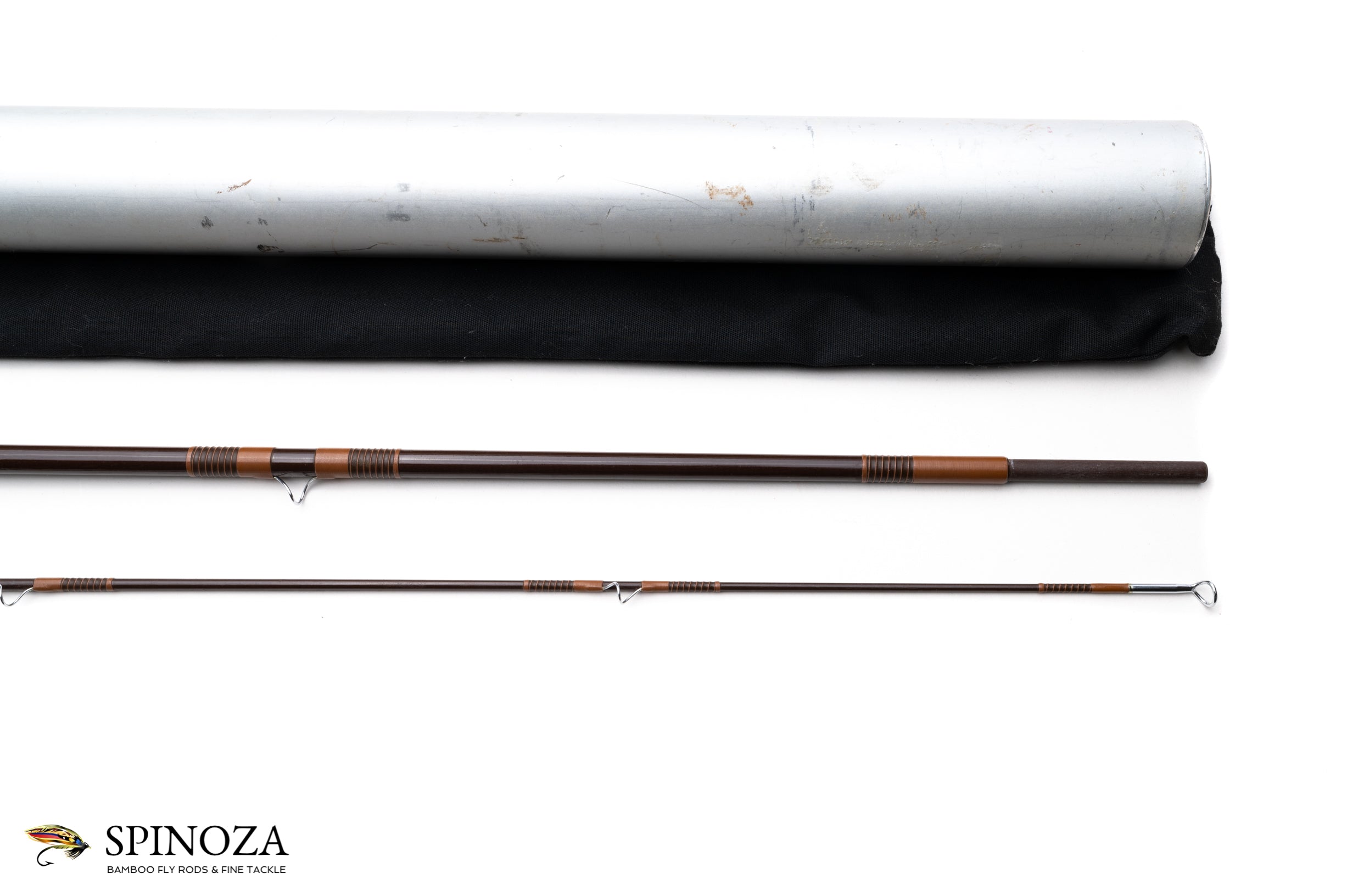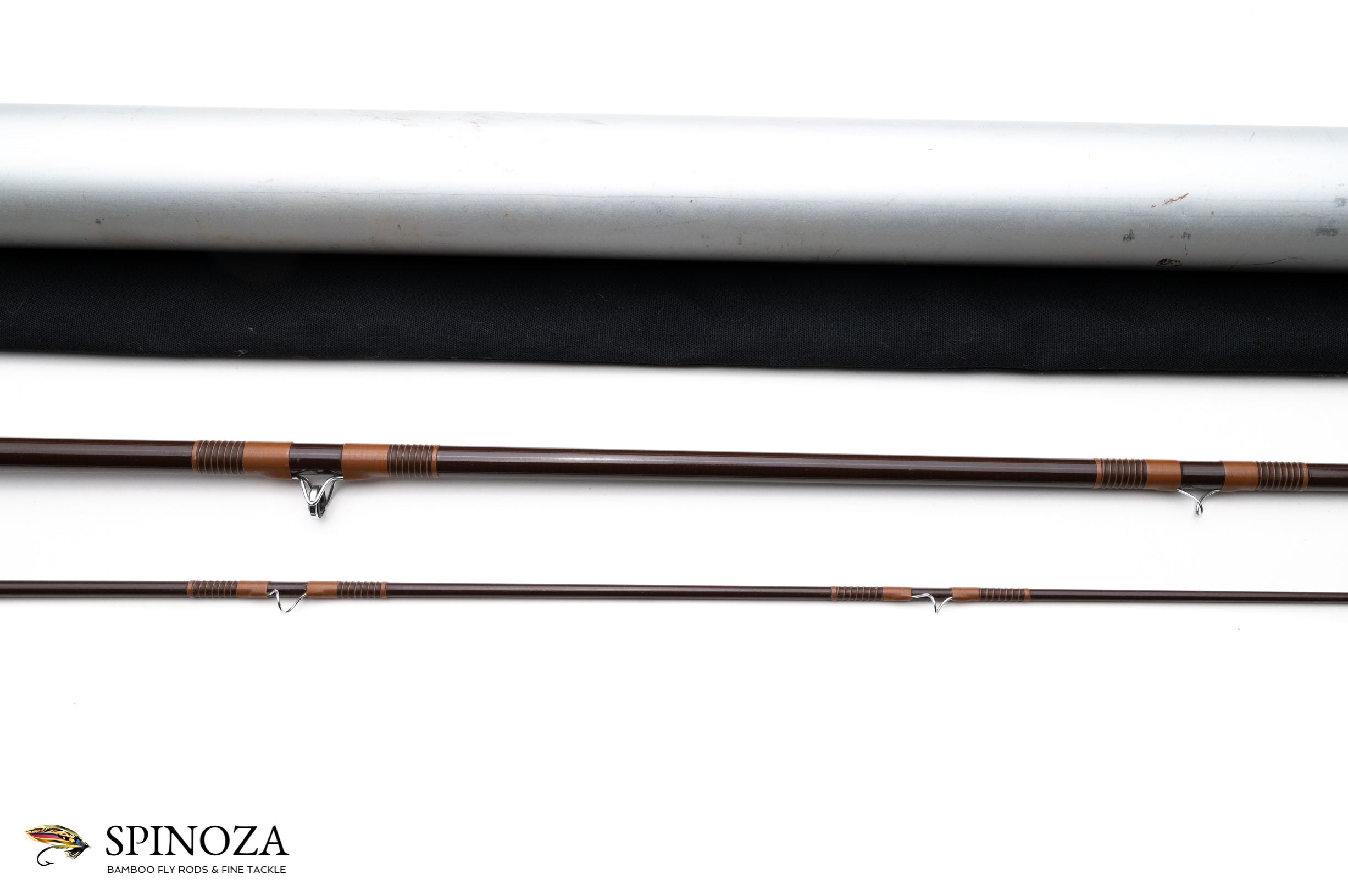 A Wanigas "Ausable" model fiberglass fly rod, 7'6", 2-piece, 1-tip, and built for a #5 line. 3 ounces. Unused condition. Brown fiberglass, brown wraps, ceramic stripper and chrome snake guides. Spigot ferrule. 6" cork grip shaped to a medium cigar. Uplocking black anodized screwlock with a cork spacer. Black cloth bag. Champion aluminum tube with the Wanigas Rod Co sticker.
