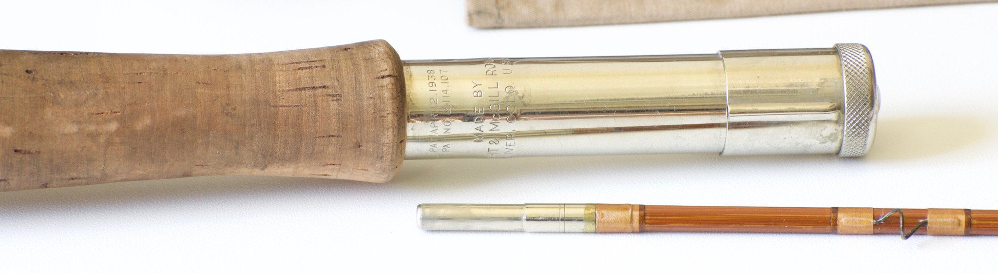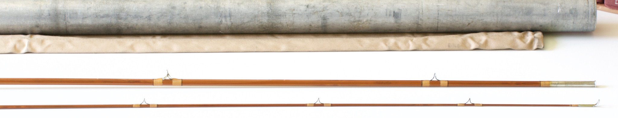 For sale here is a scarce Wright & McGill Granger Aristocrat Model GA7030. Seven feet. Two sections with one remaining tip. The rod is in excellent original condition. The Wells grip is well-soiled but no ridging exists. Original bag and tube. A delightful medium action four weight rod!