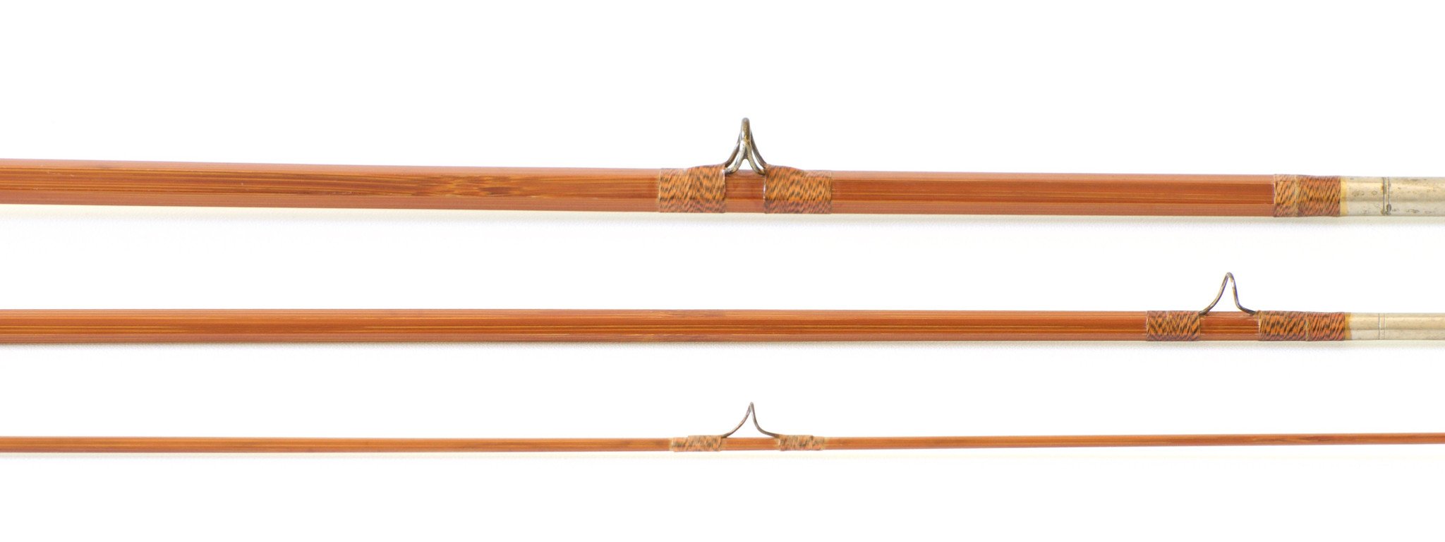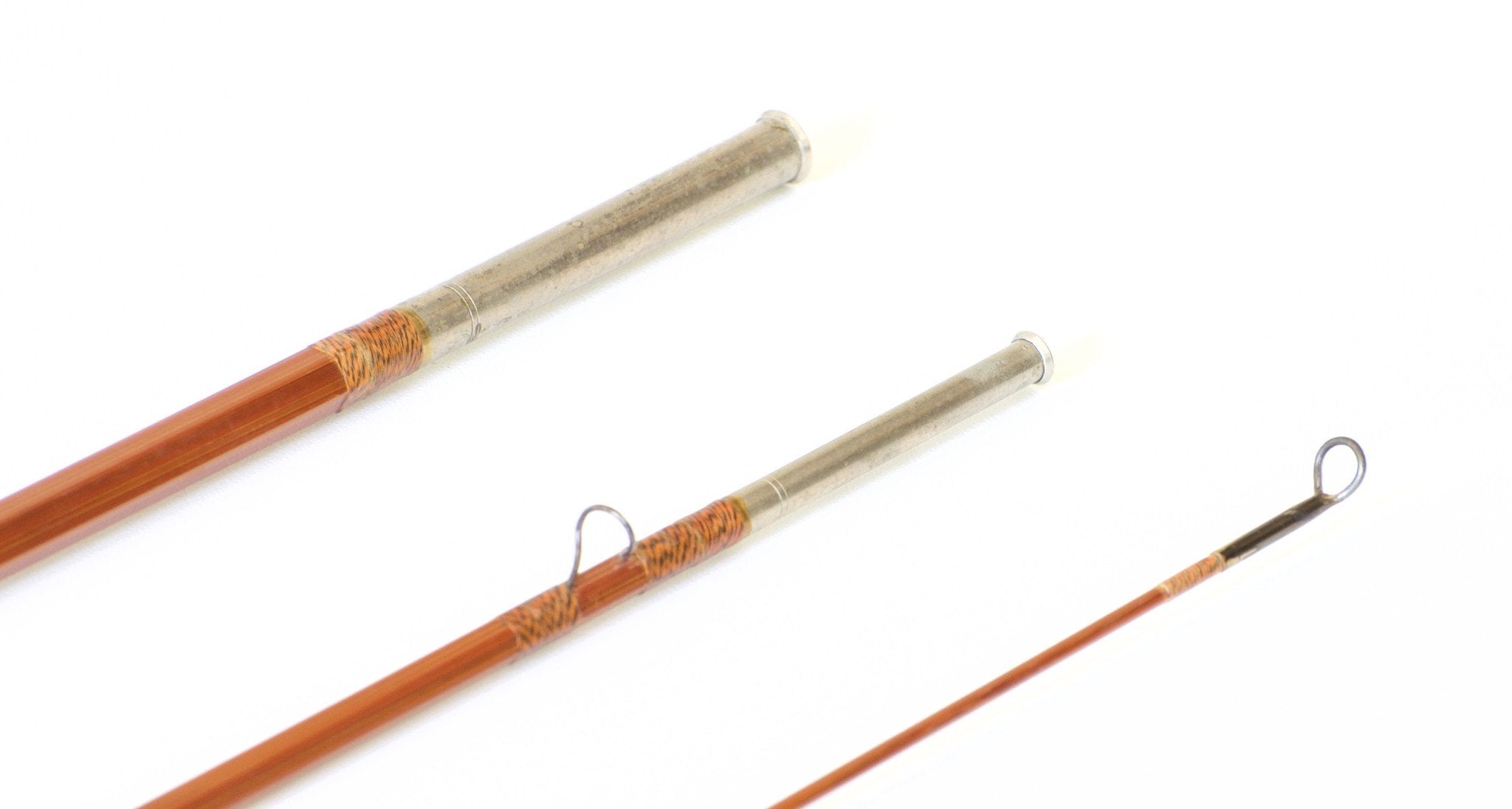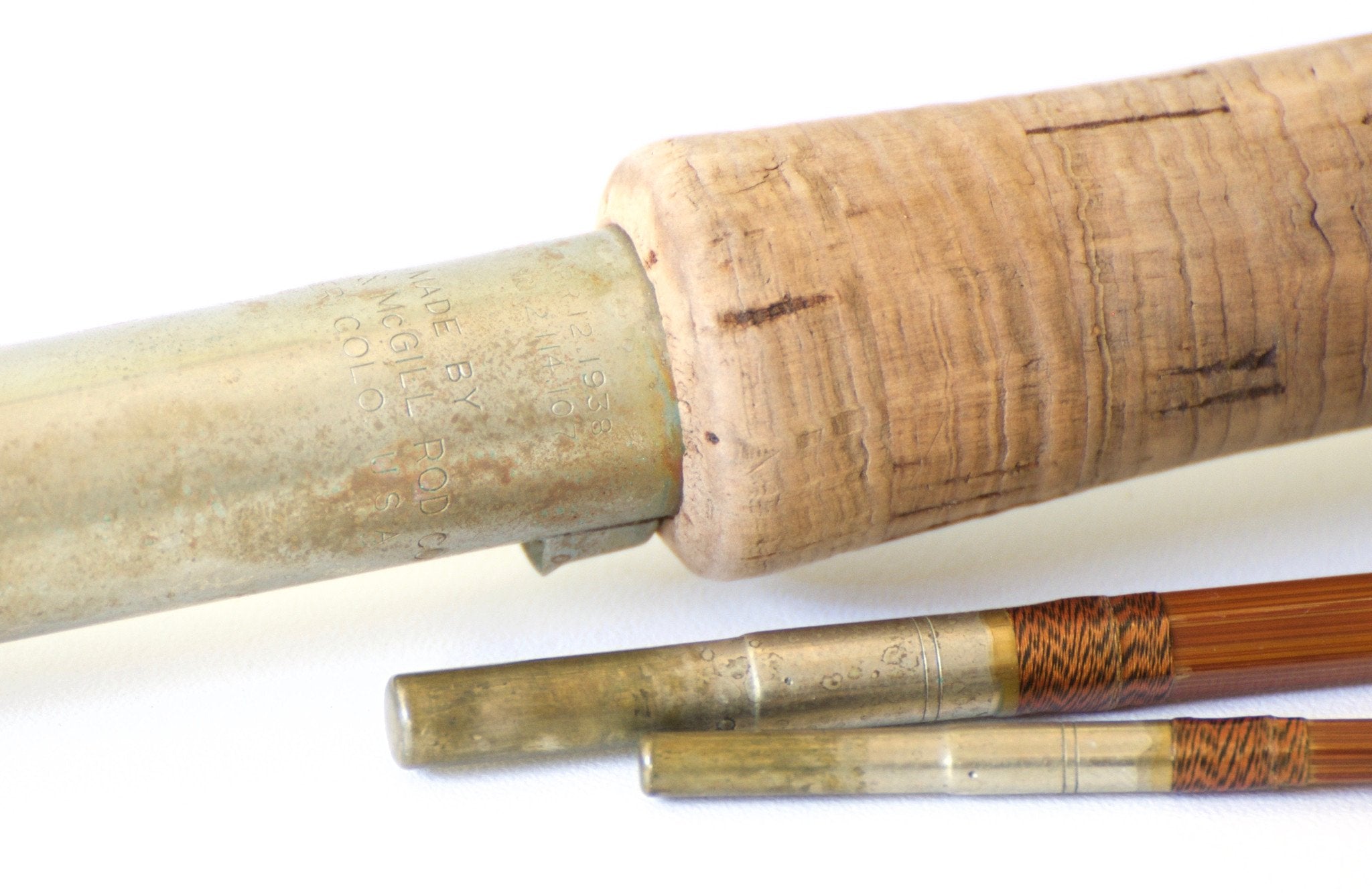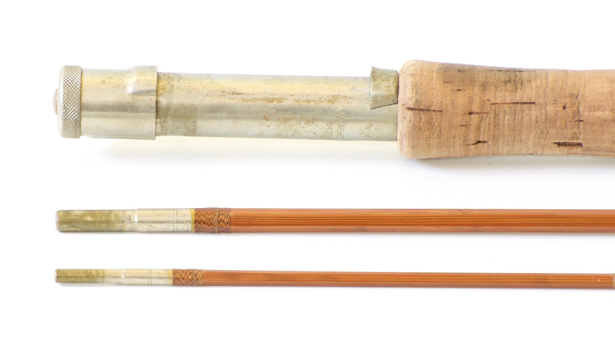 For sale here we have a Wright & McGill Granger Victory 8040 bamboo rod -- 8' 4-5wt 3/1. The rod is in excellent original condition. All sections are full length. The second original tip is missing, otherwise a very nice example of a W&M Victory 8040. The rod features classic ammoniated browntone cane. Rust and black variegated silks. Spiral signature wrap midway between the grip and stripping guide. Blued guides. The black stamping on the butt section are all clear and legible. Western-style grip is soiled but in wonderful shape. Nickel silver patented up-locking reel seat could use a good polishing but is otherwise in excellent condition and operates as it should. Nickel-silver ferrules with witness marks, size 15/64 and 10/64. The fit is excellent. The tip section has a slight fishing set. The rod has a pleasant medium action well suited as an all-around trout rod. Weight - 4.60 oz. Replacement bag, no tube. Don't miss a chance to own a fantastic fishing rod in the coveted 8040 model at a great price!