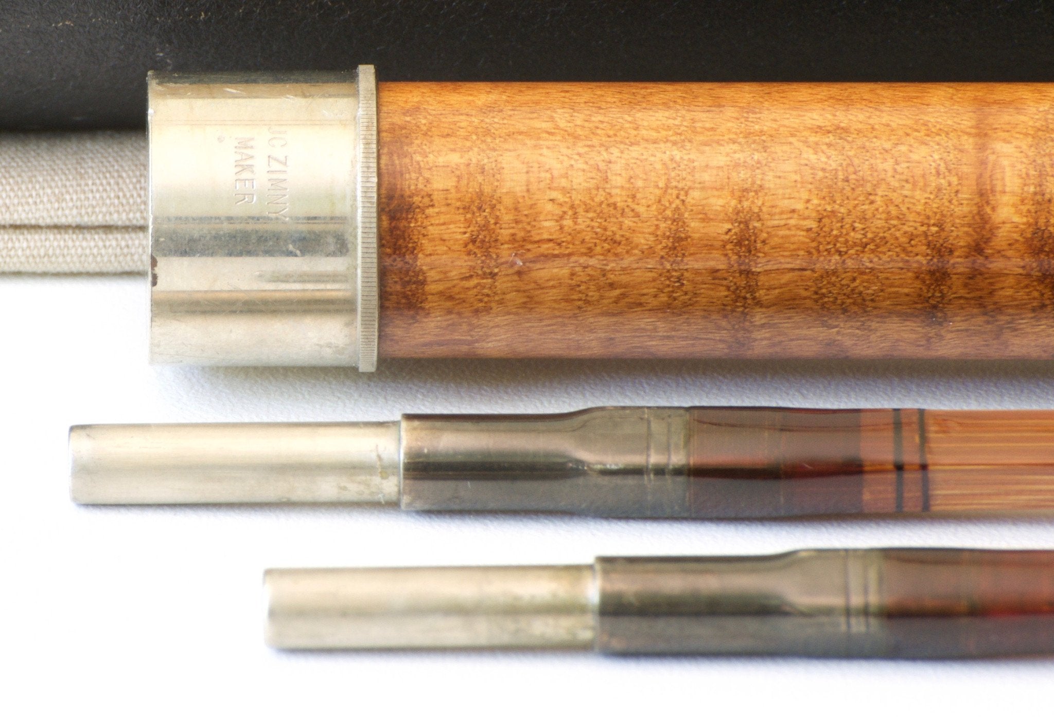 For sale here is a John Zimny 7'6" 4wt 2/2 Quad bamboo fly rod. The rod is in excellent condition. Serial number 108754Q 105Q. Tips numbered one and two. Richly tempered cane with caramel colored silks and fine black tipping. Chestnut brown wraps at the ferrules. Oxidized guides and ferrules. Agate stripping guide. Garrison style grip fits in the hand nicely. Down-locking sliding band reel seat over a beautiful Tiger Maple spacer. "JC Zimny Maker" engraved on butt cap. The rod has a nice dry-fly action on the faster side of the spectrum. Ferrule fit is very good and pop when pulled apart. The rod weighs 3 5/8 oz. Original bag and fine black powder coated tube with brass ends and J.C. Zimny label. This is an excellent dry-fly rod for small to medium streams.