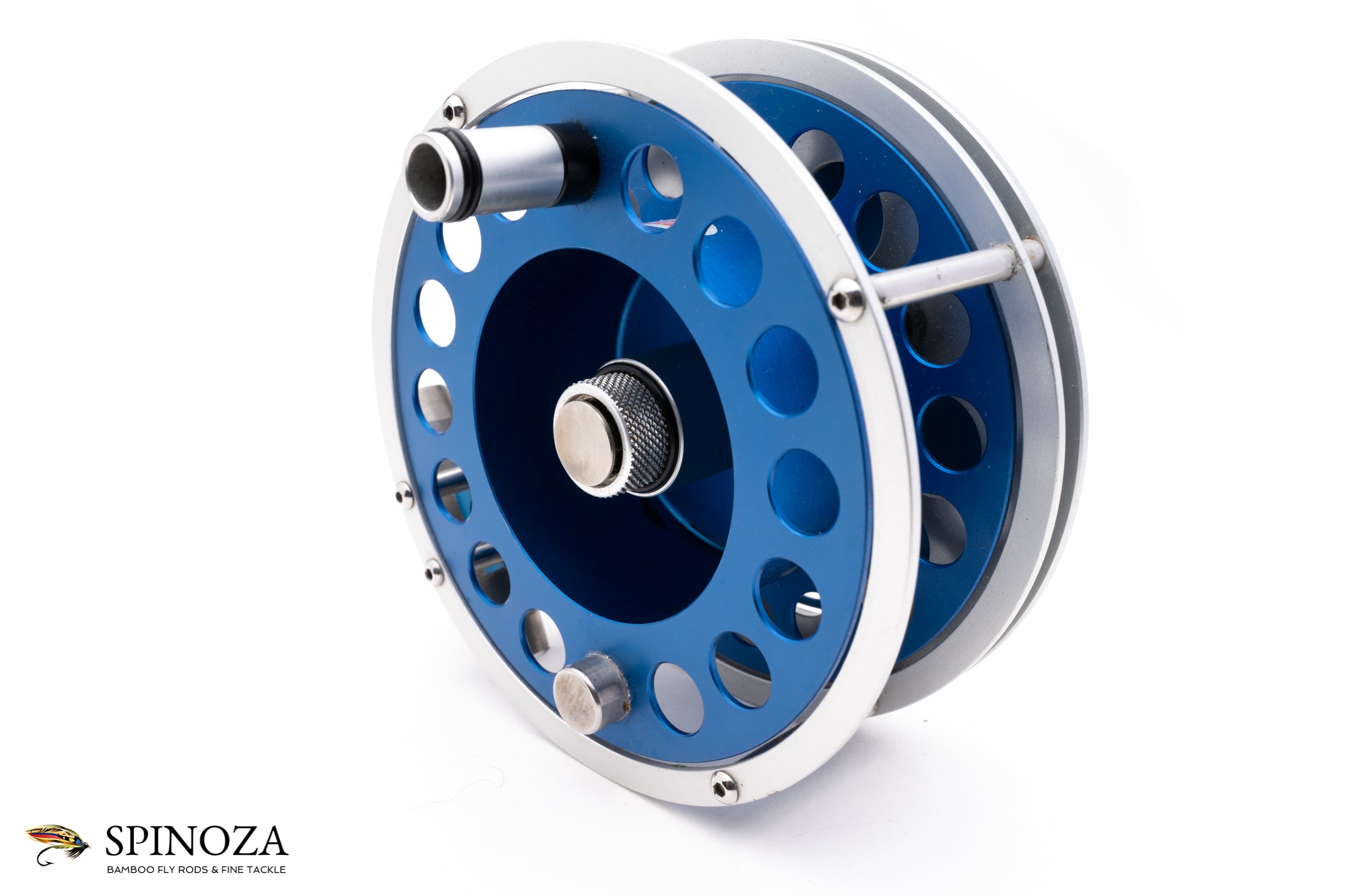 A nice Ari T Hart Large Arbor V reel, set up for LHW. 4 3/4" diameter with a 1 7/16" spool width. Large arbor design with a ported spool and three large ported holes on the backplate. Excellent used condition with a few minor wear marks here and there. There is some minor discoloration to the innermost part of the spool though I suspect it is cleanable, and there is a tiny bit of corrosion around the base of the counterbalance. A smooth powerful drag with a nice click in both directions. The frame is anodized silver while the spool is anodized royal blue (as is a small part of the reel foot). Made in Holland. No bag. A relatively scarce Ari T Hart model.