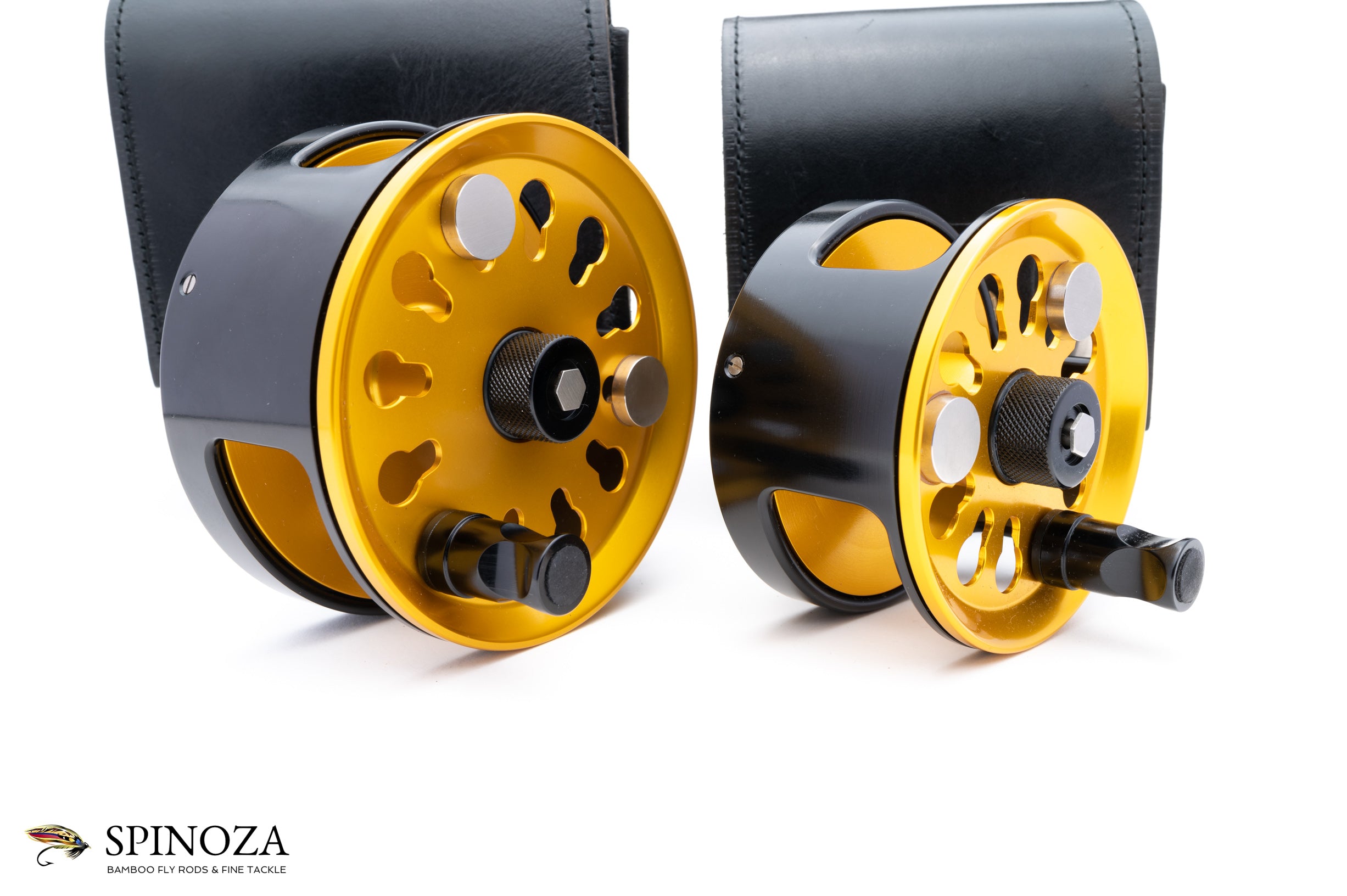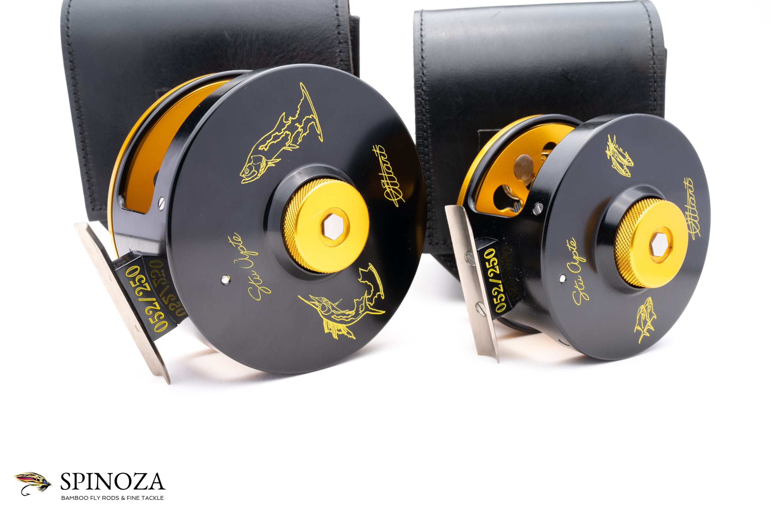 An exceptionally rare Ari T Hart and Stu Apte limited edition set of reels, which includes a Bonefish/Permit reel and a Tarpon/Sailfish reel. 250 of these were planned but only 125 were ever made, making it one of the rare Hart reels out there. These reels are #052 of the set. The reels both feature black anodized frames with gold anodized spools. Both Hart and Apte's signatures are engraved on each backplate along with handsome engraving of the quarry that each reel was designed for. The reels are mint and unused. The drag surfaces feature cork and teflon that create plenty of smooth stopping power. The Bonefish/Permit model is 3 1/2" in diameter with a weight of 11.4 ounces and capacity to hold a WF9 and 350 yards of backing. The Tarpon/Sailfish model is 4 1/8" diameter and weighs 13.1 ounces with capacity for a WF12 with 490 yards of backing. Both reels are set up for RHW. They pack into original black ATH leather snap cases with the ATH design embossed on the flap. A very rare set of reels, perfect for the Ari Hart fan or anyone who appreciates classic saltwater reels!
