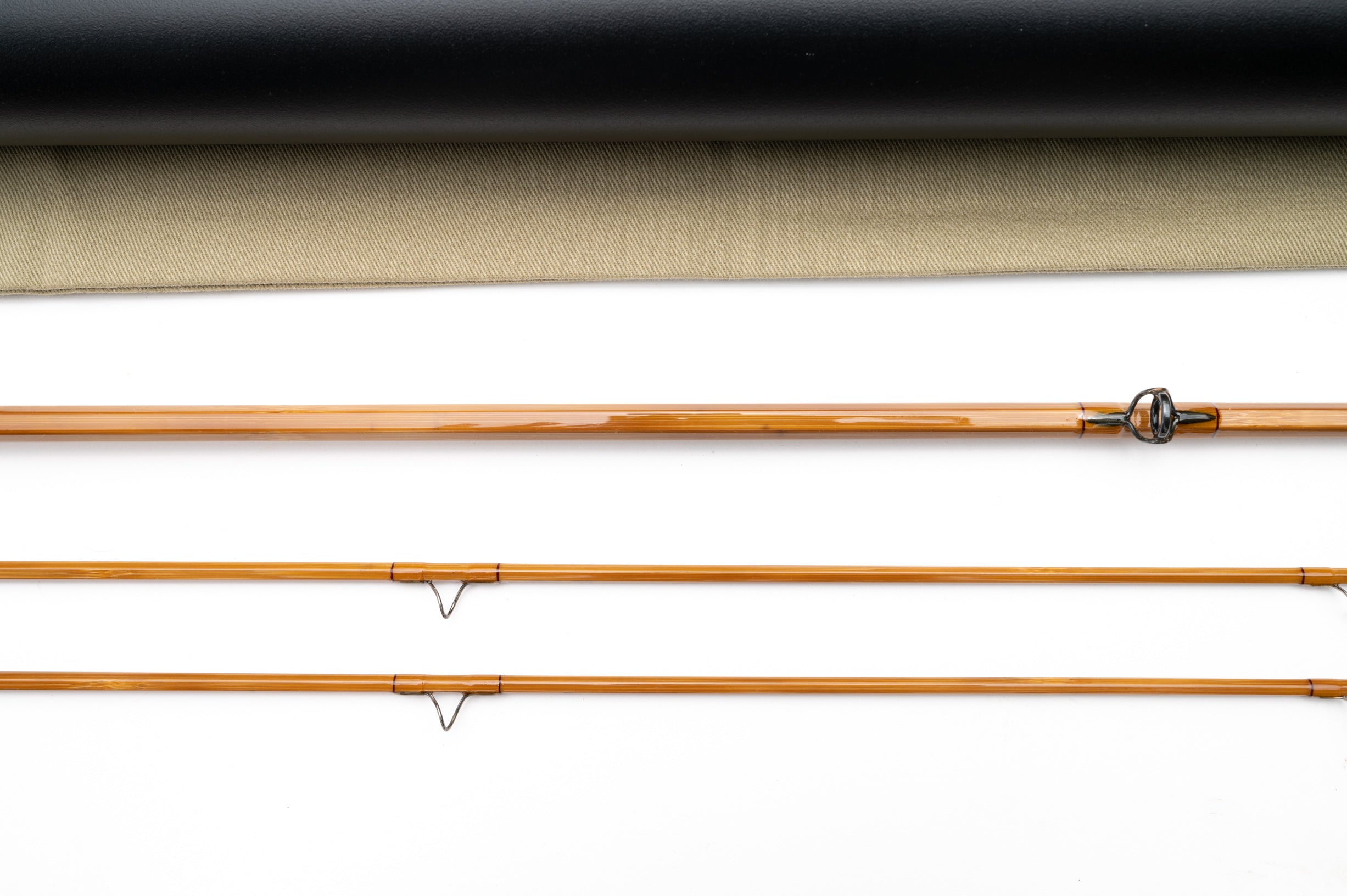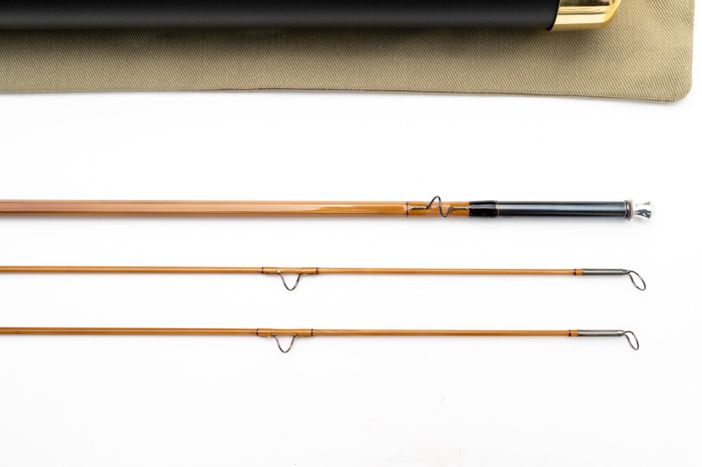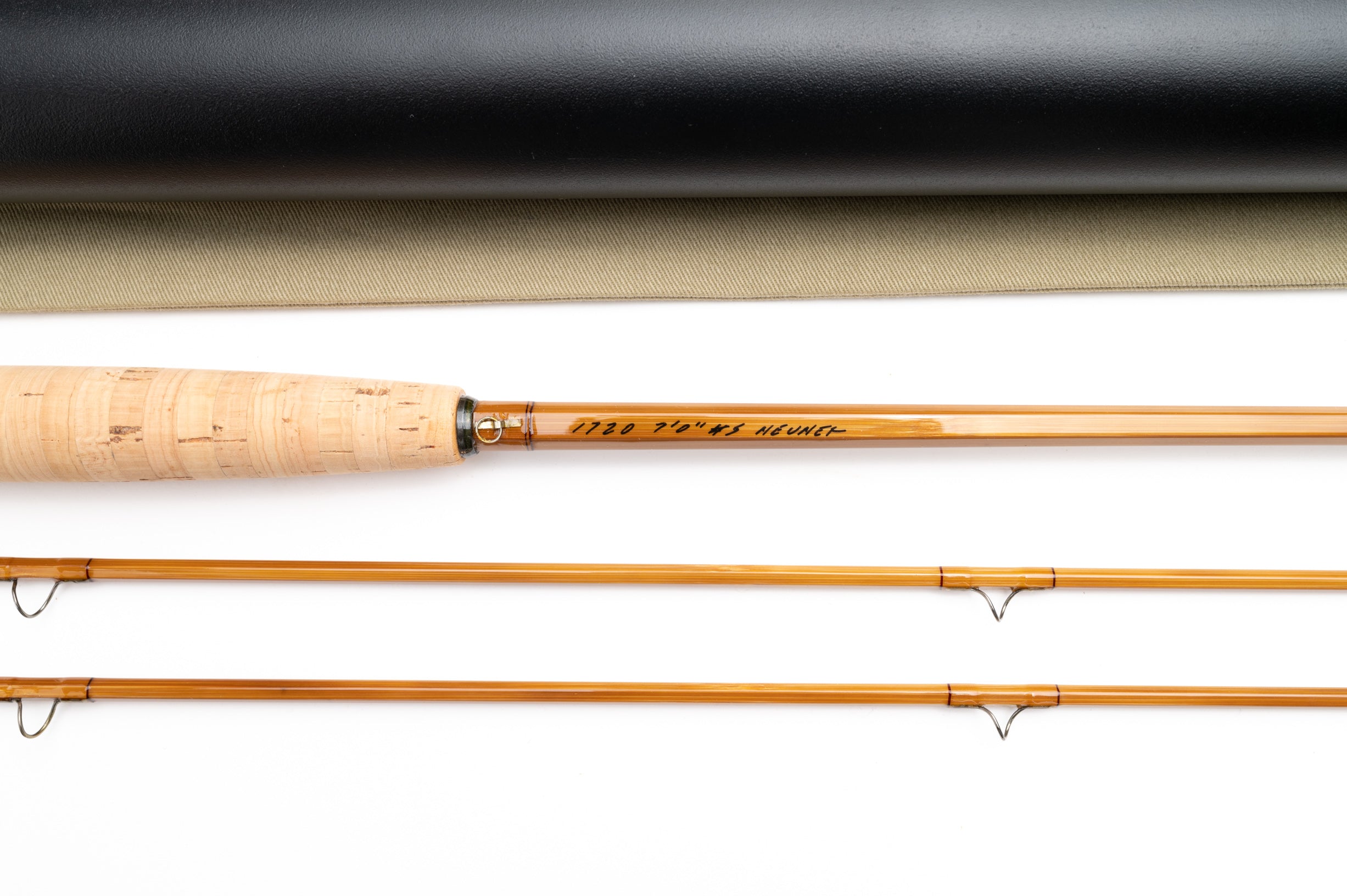 A Charles Neuner (Carmans River Rod Co) fly rod, 7', 2-piece, 2-tips, built for a #5 line. "1720 7'0" #5 Neuner" lettered on the shaft. 3-up node pattern construction. Weighs 3.1 ounces on my scale. Wheat straw colored cane with excellent varnish throughout. Translucent wraps with black tipping, wrapped full black at the ferrules. Oxidized step ferrules with a pewter shade to them. Aluminum and cork ferrule plug. Slim profile 6" grip. Oxidized cap and ring hardware over a light, highly figured wood spacer. "Charles P Neuner" stamped into the butt cap in an oval cartouche. Medium fast action. The ferrules fits are good. "1720" lettered on the shaft at the base of each tip. This rod is new and unfished. Comes in a khaki bag and black tube with a brass top and bottom.
