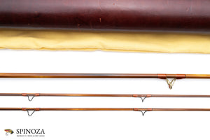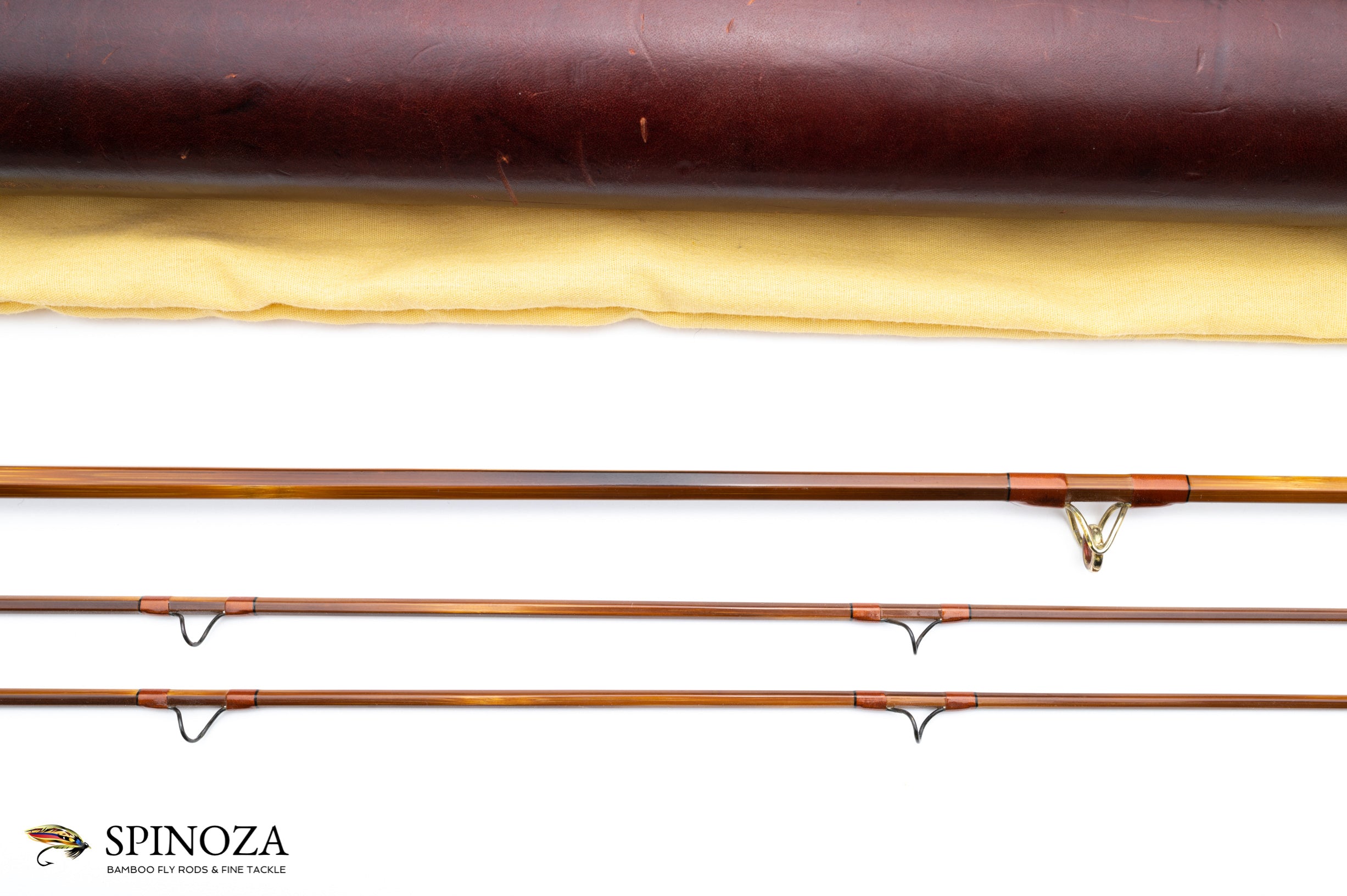 A nice Darryl Whitehead fly rod, the personal rod of noted west coast steelheader and hook maven Alec Jackson. 7', 2-piece, 2-tips, and built for what feels like a #4 or #5. Serial #52, built in 1992. Alec's name is engraved into the ring in the reel seat. Good used condition with some soiling to the grip. One of the tips has some condition issues: there are two cracked facets, one under the lower guide and another between the third and fourth guide from the bottom, and there are several glancing hook scrapes to the varnish, though they do not go all the way through to the cane. The rod is of a Presentation grade. The cane is flamed with the nodes done in a spiral pattern. The wraps are copper color with black edges and an extra band of yellow and black at the keeper and ferrules. The wraps are color preserved. The guides are agate and black snakes. The swiss-style ferrules are engraved by Paolo Barbetti and are polished. The grip is 6" long in a slim cigar composed of 1/4" corks. The reel seat is fossilized and has downlocking screwlock hardware which has been similarly engraved by Paolo and has "Alec Jackson" engraved in the slide. The bottom of the cap is engraved "D. Whitehead, Maker, No 52, 1992". The ferrule plus is nickel silver with a fossilized pull. The rod comes in a yellow cloth bag and a Holland handmade leather tube.