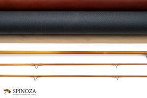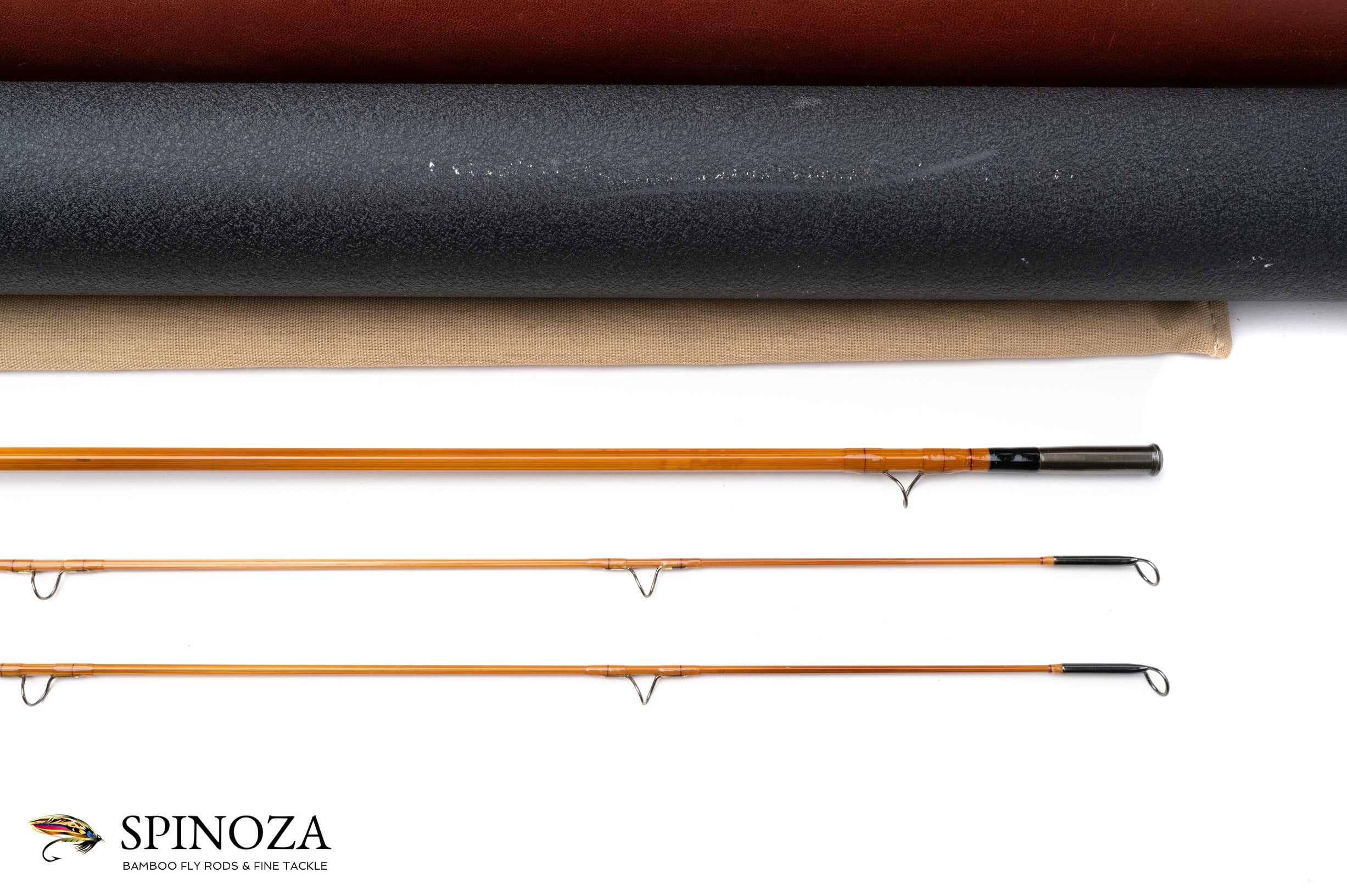 A nice Bernard Ramanauskas (Eden Cane / Freestone) bamboo fly rod, 6'9", 2-piece, 2-tip, and built for what feels to me like a #4. The rod weighs 3.2 ounces on my scale. "210Y-4" is inked on the shaft, along with a drawing of a nymph and a highly stylized signature. Medium fast action. Medium wheatstraw cane done in a nodeless scarfed configuration. The rod is lightly used with a small scratch to the varnish just above the writing on the shaft, some light reel foot impressions on the reel seat spacer but no other meaningful signs of use that I could find. The rod has transparent wraps with dark red decorative spiral wraps above the grip, and a single band of red in the middle of each guide wrap, with red tipping at the ferrules and tip tops. Agate stripper. The female ferrule has a dark red overwrap at its base. Truncated and oxidized swiss style ferrules. The grip is made of rattan and has a slim cigar profile with front and rear cork checks. The reel seat is a simple slide band over a varnished wood spacer and the cap and ring are oxidized and highly minimalistic in design. The bottom of the cap has the Eden Cane logo stamp on it. The rod packs into a tan cloth bag and comes with two tubes, one a black crackle paint aluminum tube with brass fittings (and the "Freestone" logo on the tube) as well as a leather Arne Mason tube with the Freestone logo stamped into the cap.