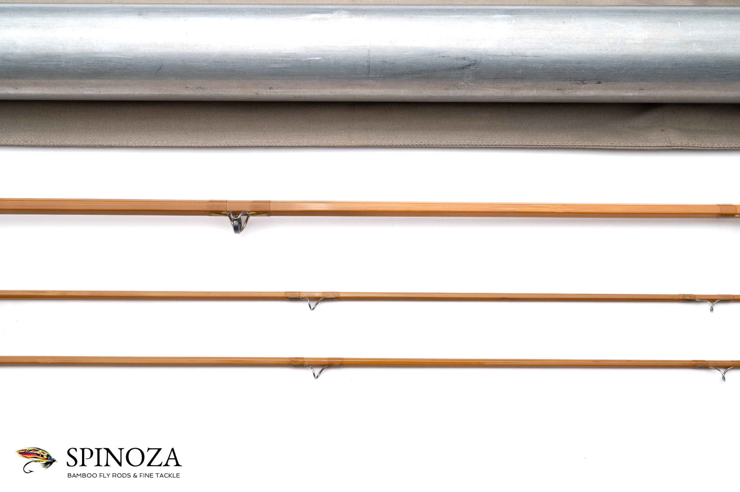 A scarce Everett Garrison model 204 bamboo fly rod, 7', 2-piece, 2-tip, and built for a #4. The rod weighs 3 ounces. Faster action. I think it may fish a #3 well too. The 5th rod Garrison made in 1945. The varnish on this rod is in shockingly good condition and I would rate the rod in the light use category. The rod is fully original and everything is correct. The finish on this rod is the best Garrison I have ever seen. There are two condition matters to note which are that the olive tip has a hook impact 2 guides down from the tip top that caused the start of a splinter but it has been glued over and appears to be holding just fine. The second is that the red tip is 1/4" short. Blond cane with a spiral node pattern. The main wraps are fully transparent white, black (or dark brown) at the keeper and brown at the ferrules. The early style ferrules are oxidized. The stripper is carbide and the snakes and tip tops are chrome. The grip is a 6" long and shaped to the characteristic blunt cigar. The reel seat is all cork with a diamond knurled ring and a spun cap with a formed pocket. The ferrule fits are fine and the rod is straight. The rod comes in a grey poplin bag with two ferrule plugs attached and an aluminum tube with brass fittings. Original Garrisons like this rarely come to market!
