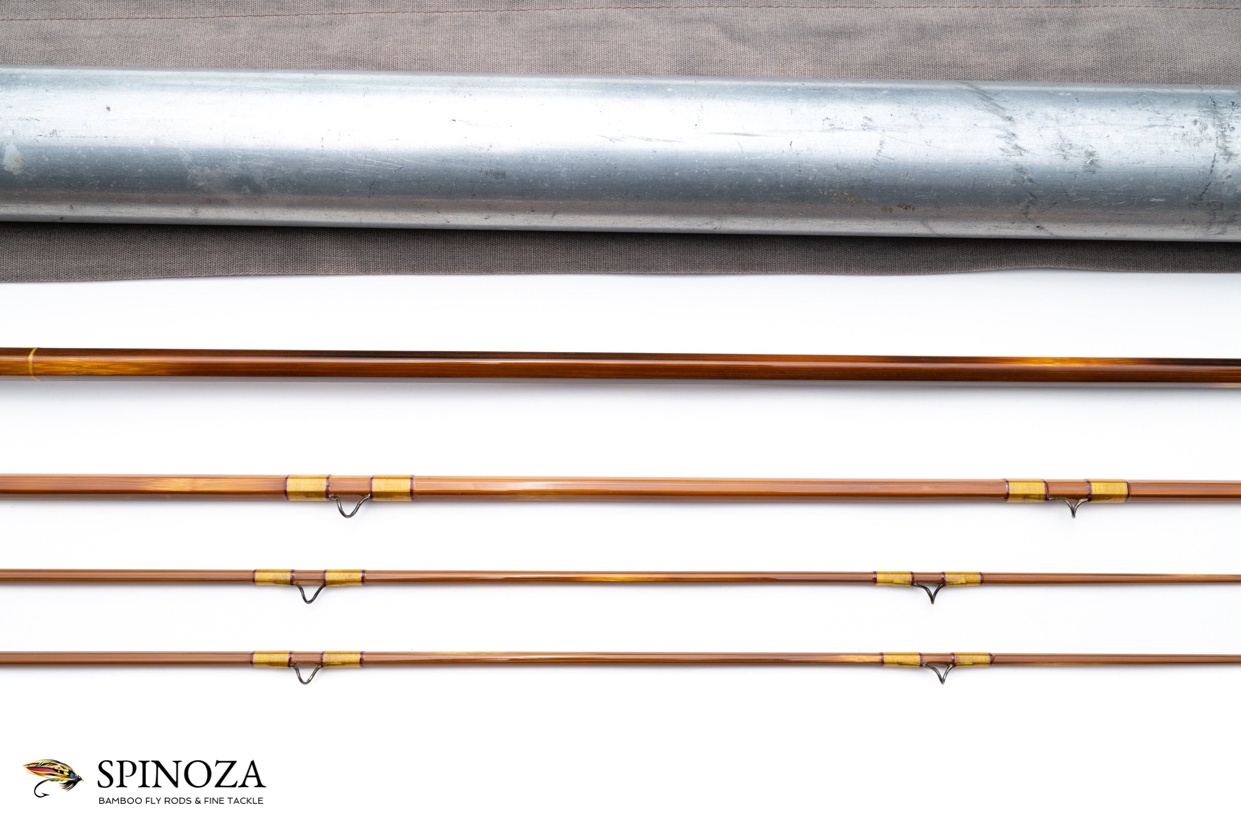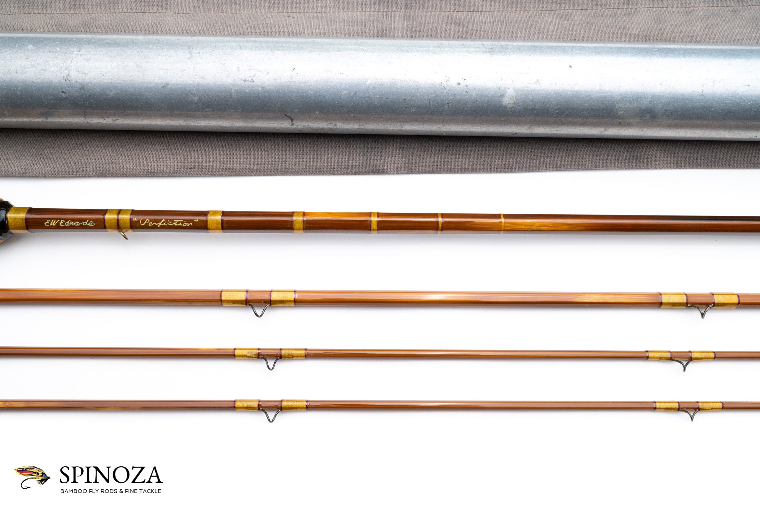 An EW Edwards Perfection model fly rod, 9', 3-piece, 2-tips, and built for what feels to me like a #4 or #5. Medium slow action. 6.1 ounces. Nicely refinished with all sections full length with no visible damage or delamination. The cane is flamed with no discernible node pattern. Excellent varnish with yellow main wraps and red edges. A set of windaways of diminishing size decorate the lower 8" of the butt. The step ferrules are polished bright. The stripper guide is agate and the guides on the mid are all period high slant snakes. Hard rubber was used as a front and rear grip check. The cork grip is a medium cigar 5 1/4" long and thankfully uncleaned. The real seat is an all nickel silver with a slide band and a soldered pocket cap. The Hardy LRH on my desk fits into this seat perfectly. The bottom of the seat features a large hard rubber cap. The grey cloth bag is original and the tube is as well.
