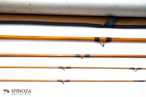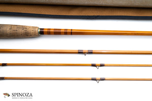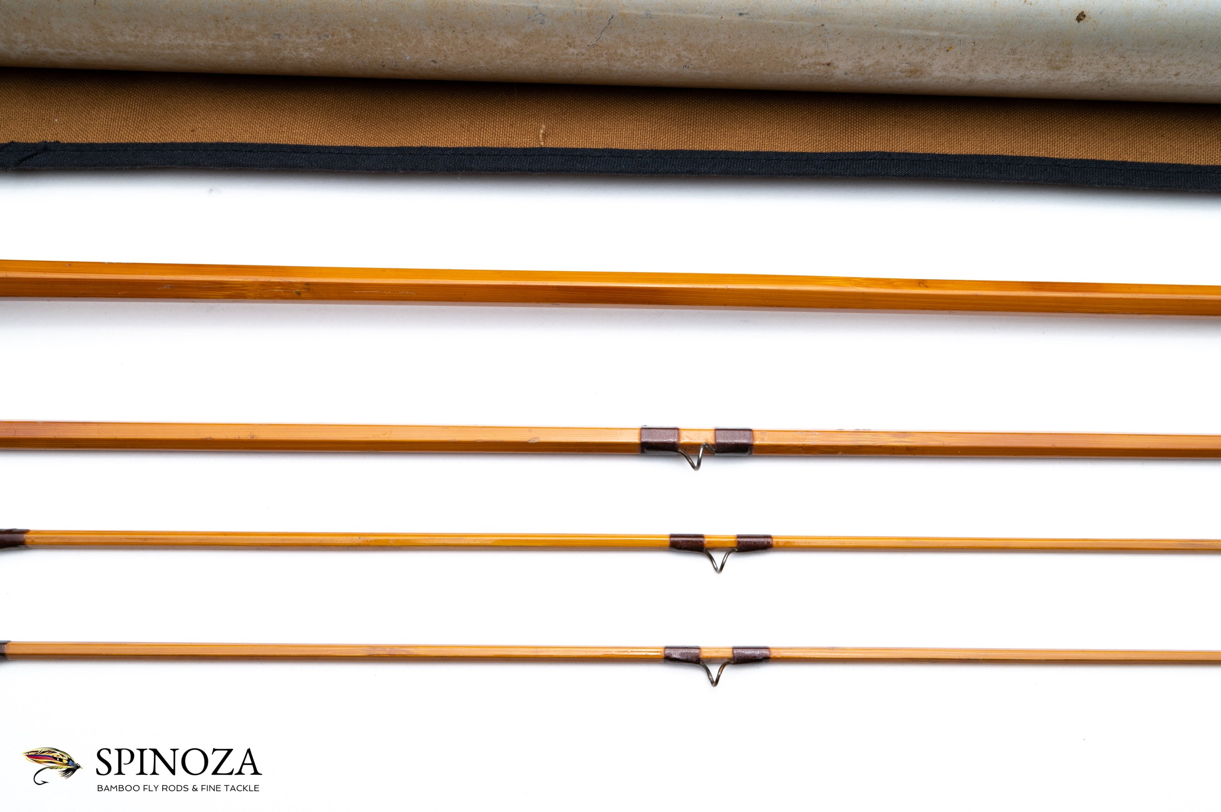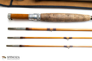 An FE Thomas Special bamboo fly rod, 9', 3-piece, 2-tip (one tip is short 4"). Serial #6154. 6.1 ounces. Medium fast action for what feels to me like a #8 or #9. Used and but for the short tip it is in pretty decent condition. The varnish is hard with a few chips missing here and there. There are some small cosmetic casting cracks at the ferrules. The ferrule fits are good and the rod could use a minor straighten. The wraps are brown with a red edge at the keeper and male ferrules and 3-7-3 signature wraps. Reverse twist snake guides. The grip is 6" long and shaped to a medium blunt cigar. The seat is a downlocking aluminum screwlock with a nickel silver pocket cap. The serial number is stamped on the bottom of the pocket cap. The rod packs into a heavy brown cloth bag and aluminum tube.