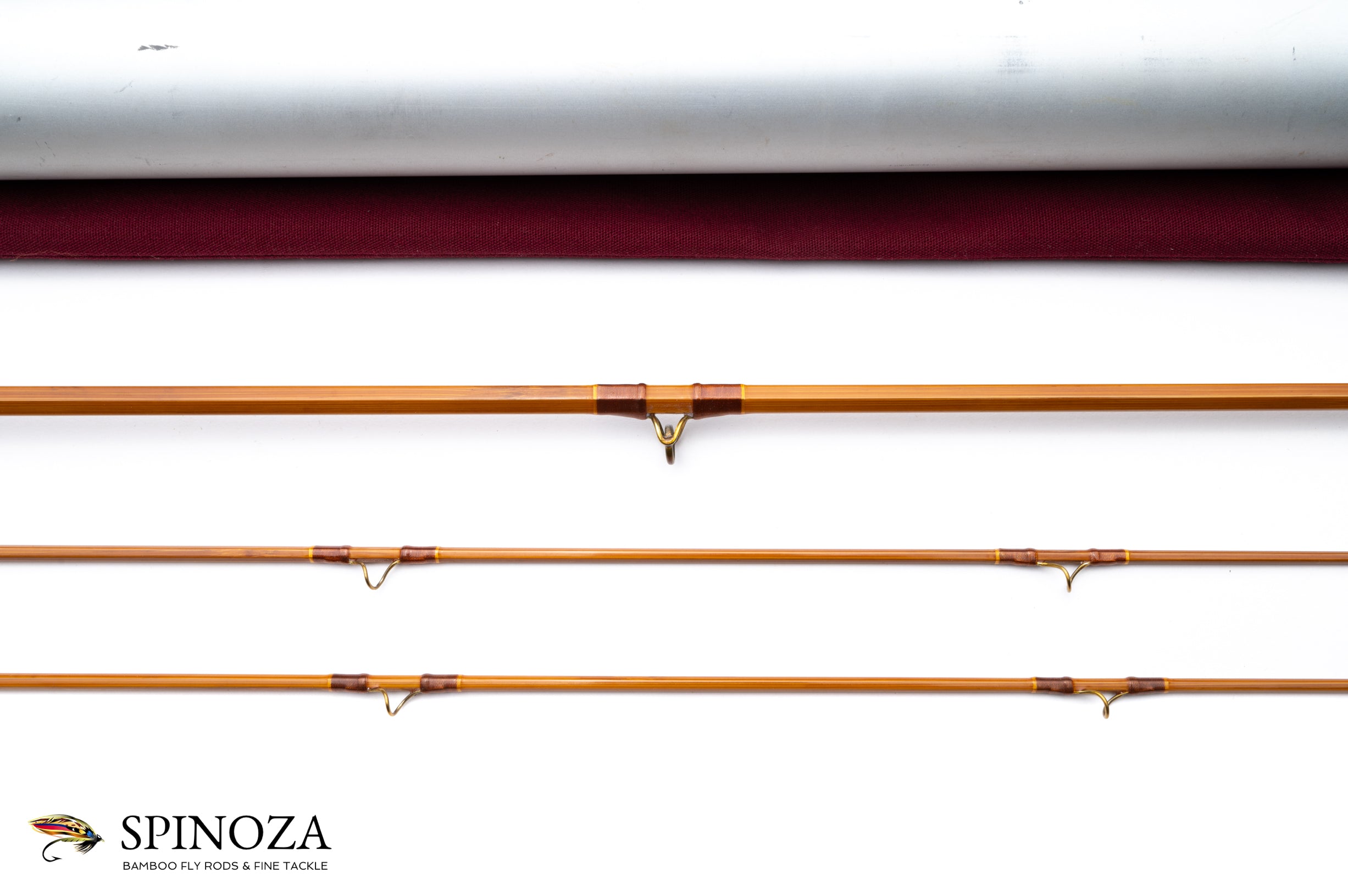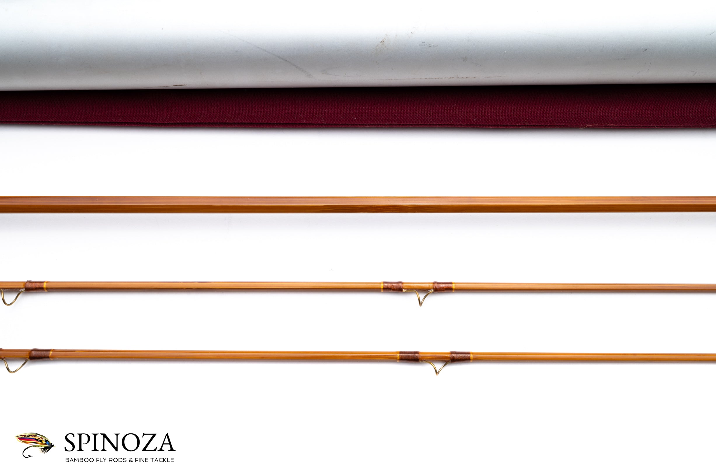A Gary Howells bamboo fly rod, 7'6", 2-piece, 2-tip, and built for a #4 line. Serial #4637. The rod weighs 3.1 ounces on my scale. Used but in excellent condition with no defects. The action is a bit on the slower side of medium. Oven tempered cane with slightly darker nodes arranged in a three up pattern. The main wraps are brown with yellow edges and one band of red at the keeper. The stripping guide is a #8 SRMC carbide and the snake guides and tip tops are chrome. The varnish is in perfect condition except for one tiny chip just above the keeper wrap. The grip is 5 1/2" long and styled to a Western profile, with a little bit of modest hand soiling. The seat is flatted all cork with an aluminum ring and pocket cap with a black plastic bottom cap. The rod comes with the original maroon Howells bag and the aluminum case with the Howells data sticker. The rod is also accompanied by a letter from Gary to the customer.