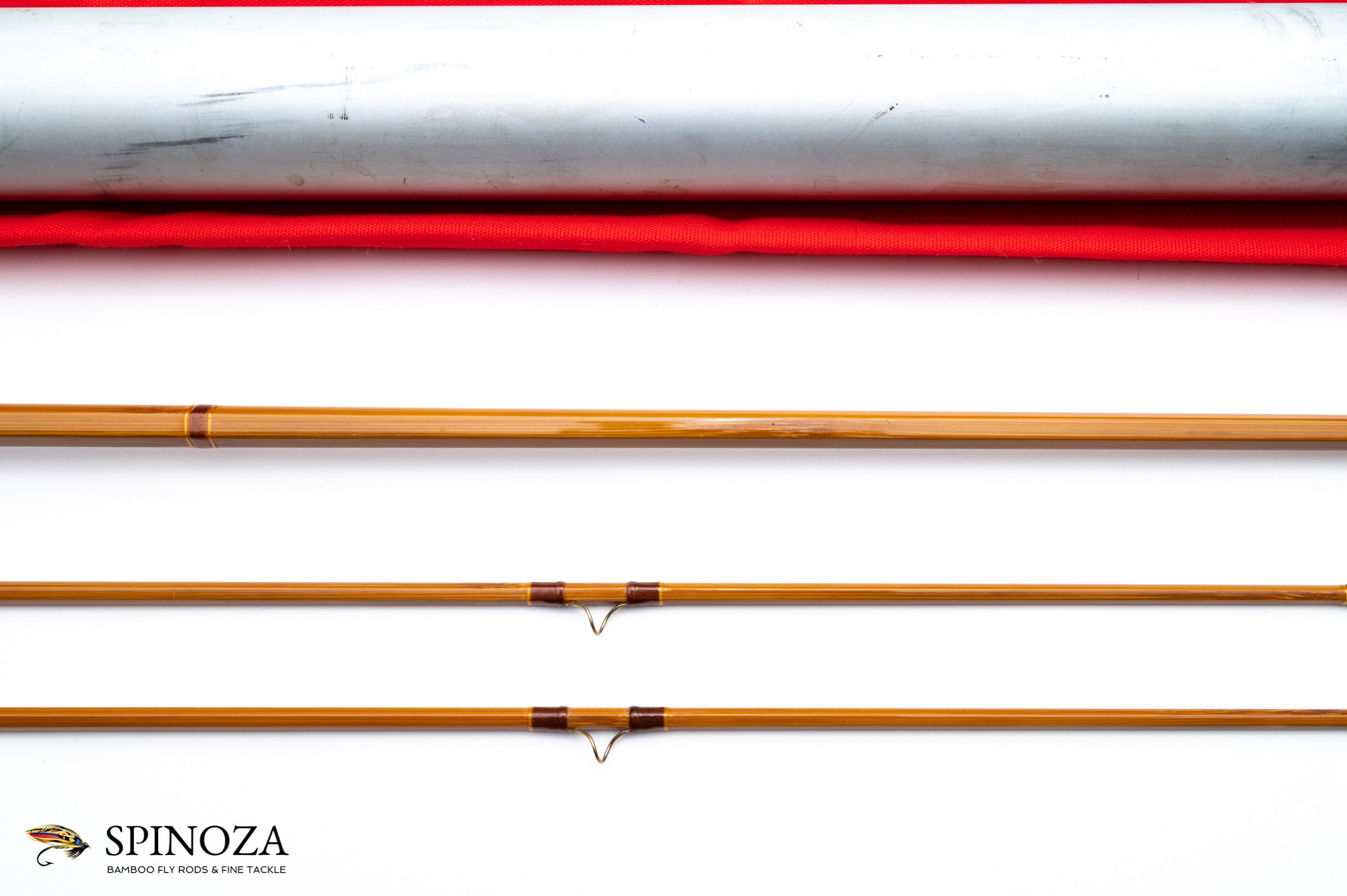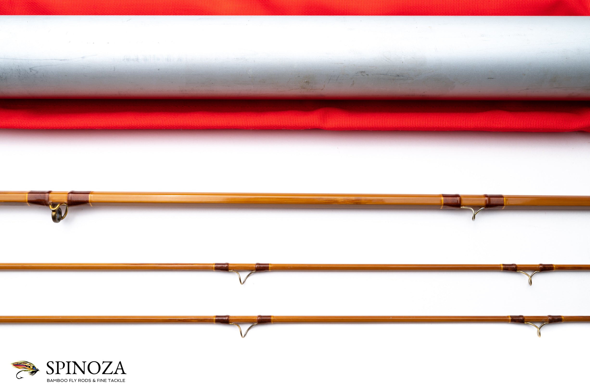 A very nice Gary Howells fly rod, 8', 2-piece, 2 tips, built for a #6 line. "G. H. H. Howells" and "8' 4 1/8 oz #4907" lettered on the shaft. The serial number denotes a 1983 manufacture date. Medium full flexing action. Near mint condition with only the faintest hint of use. The ferrule fits are good and the rod is straight. Medium wheatstraw colored cane and the nodes are distributed in a three up node pattern. The varnish is excellent. The wraps are the usual Howells brown with yellow tipping and the ferrules have the Winston-inspired overwrap, also in brown. Chrome tip tops. The grip is 12 corks long and 6" in length, done in a half wells profile and it has some mild ridging on the upper portion. The reel seat is an aluminum uplocking slide band with a pocket cap, done over Gary's trademark zebrawood spacer. The rod packs in a bright orange cloth bag and the original aluminum tube with brass hardware and the Howells data sticker intact.