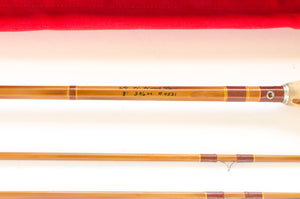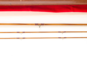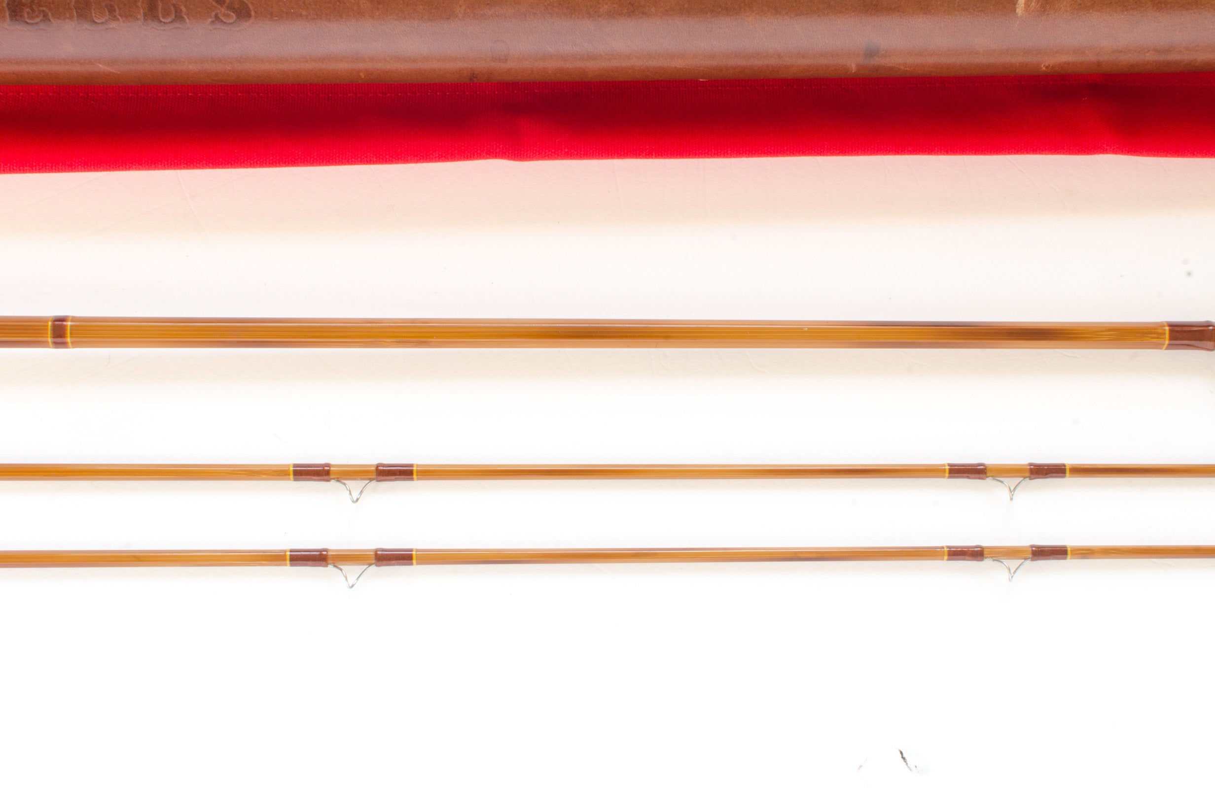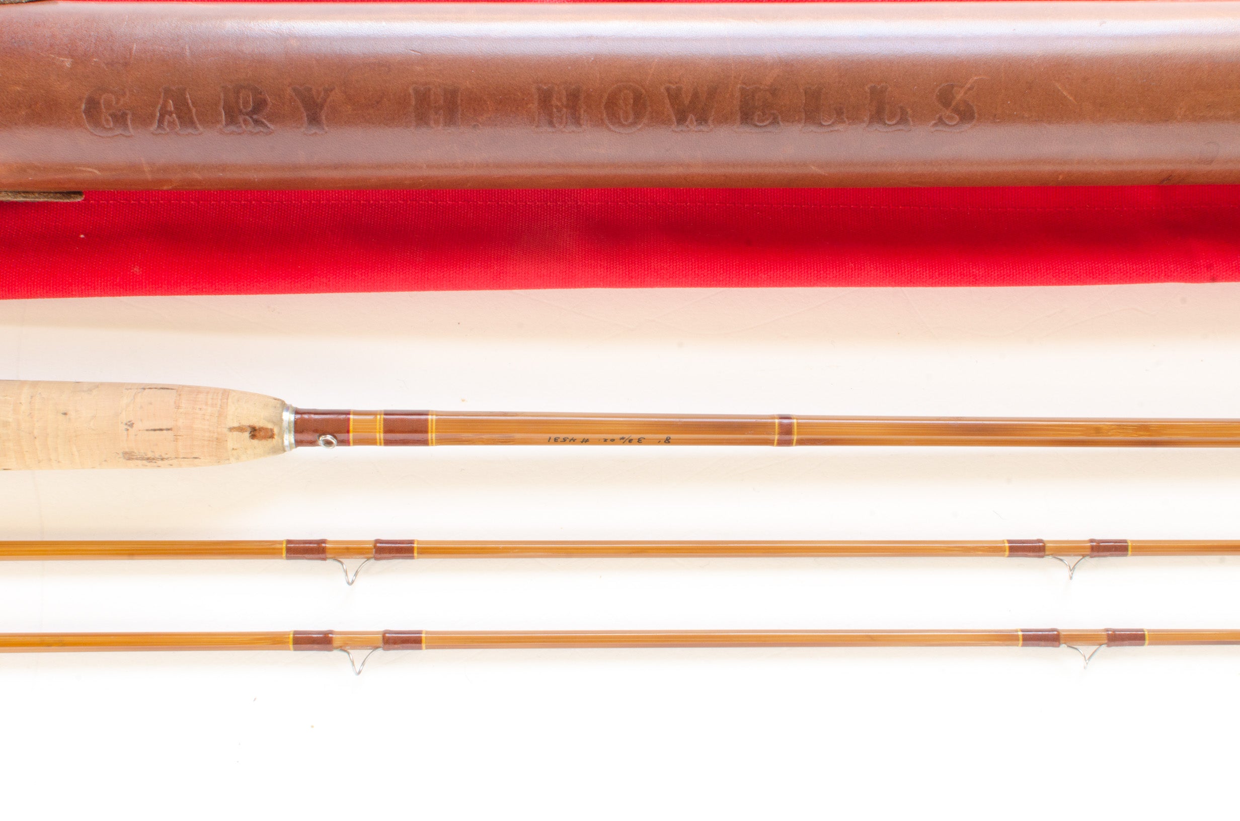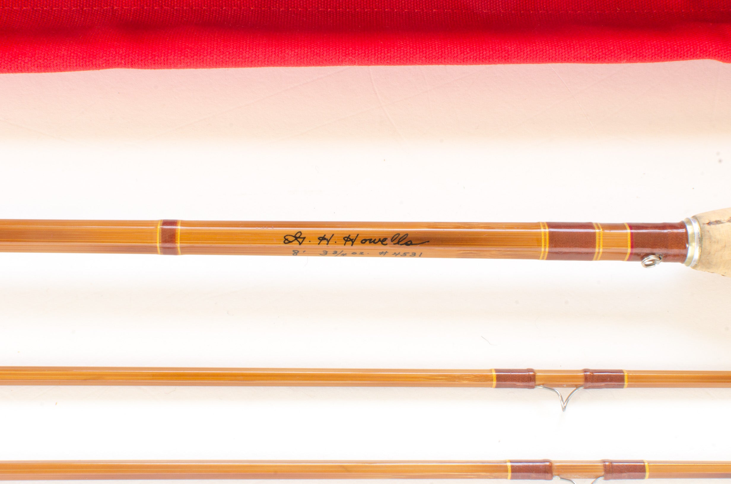 The rod is flamed cane in three up node pattern. Excellent quality varnish. Brown main wraps with yellow edges. Mildrum carbide stripper and chrome guides. Some cracking to the wraps at the ferrules. Lettered " G.H. Howells" with a small chip in the varnish between the E and the L . and "8' 3 3/4 oz. #4531. The serial number is also lettered on the wrap flat of both tips. The western-style grip shows faint signs of having been cleaned. The reel seat is a flatted cork skeleton seat with aluminum cap and ring. The rod comes with the correct red cloth bag and the embossed leather tube and paperwork of provenance.