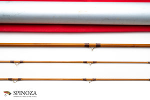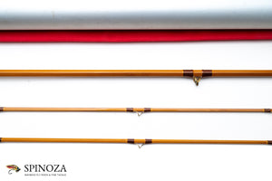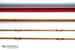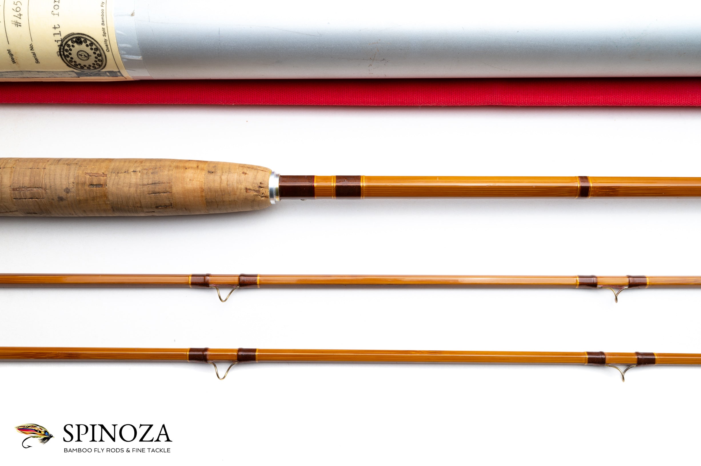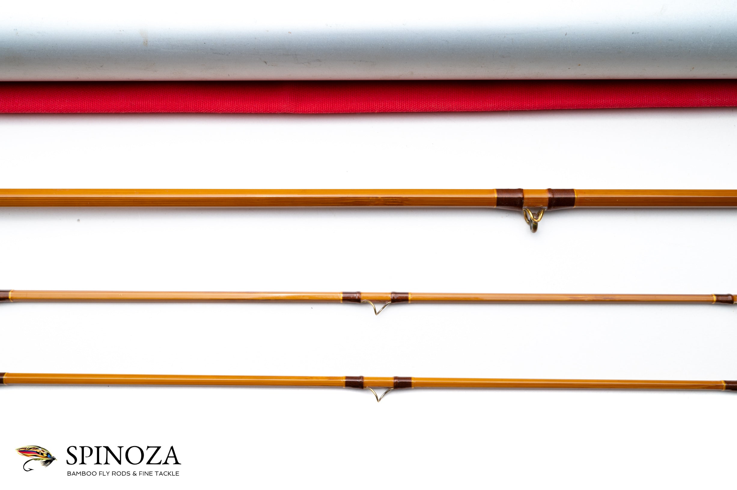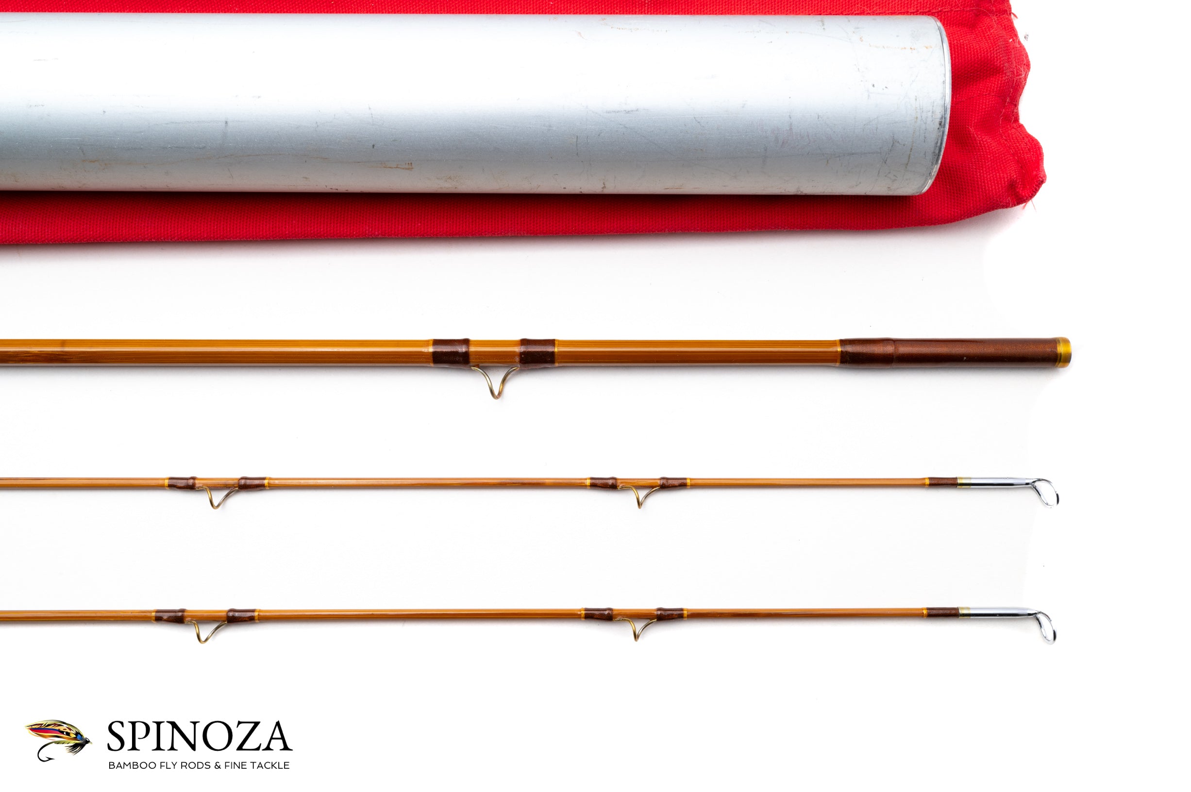 A nice Gary Howells bamboo fly rod, 8'6", 2-piece, 2-tip, and built for a #6 line. Serial #4653 which indicates a 1979 date of manufacture. Weighs 4.8 ounces on my scale. This rod has a faster action compared to the typical Howells taper. The condition is good, with tight ferrules. The rod could use some minor tip straightening, the grip has some modest hand soiling, and the varnish has some minor surface imperfections from hook digs (though I see no penetration into the cane anywhere). Oven tempered cane done in a three up node pattern. The main wraps are brown with yellow edges. Carbide stripper and chrome guides. The grip is 6 1/2" long and shaped to a western profile with a hidden pocket cap. The hardware is an aluminum uplocking screwlock over a nicely varnished wood spacer. The rod packs into a red cloth bag and an aluminum tube with Gary's data sticker affixed to it.