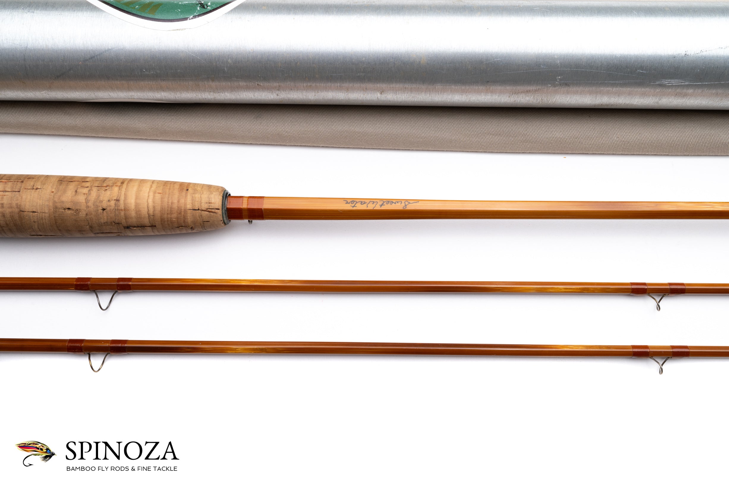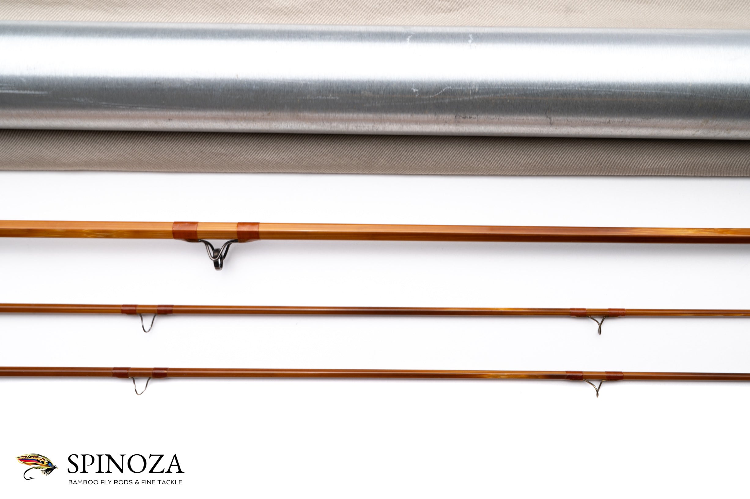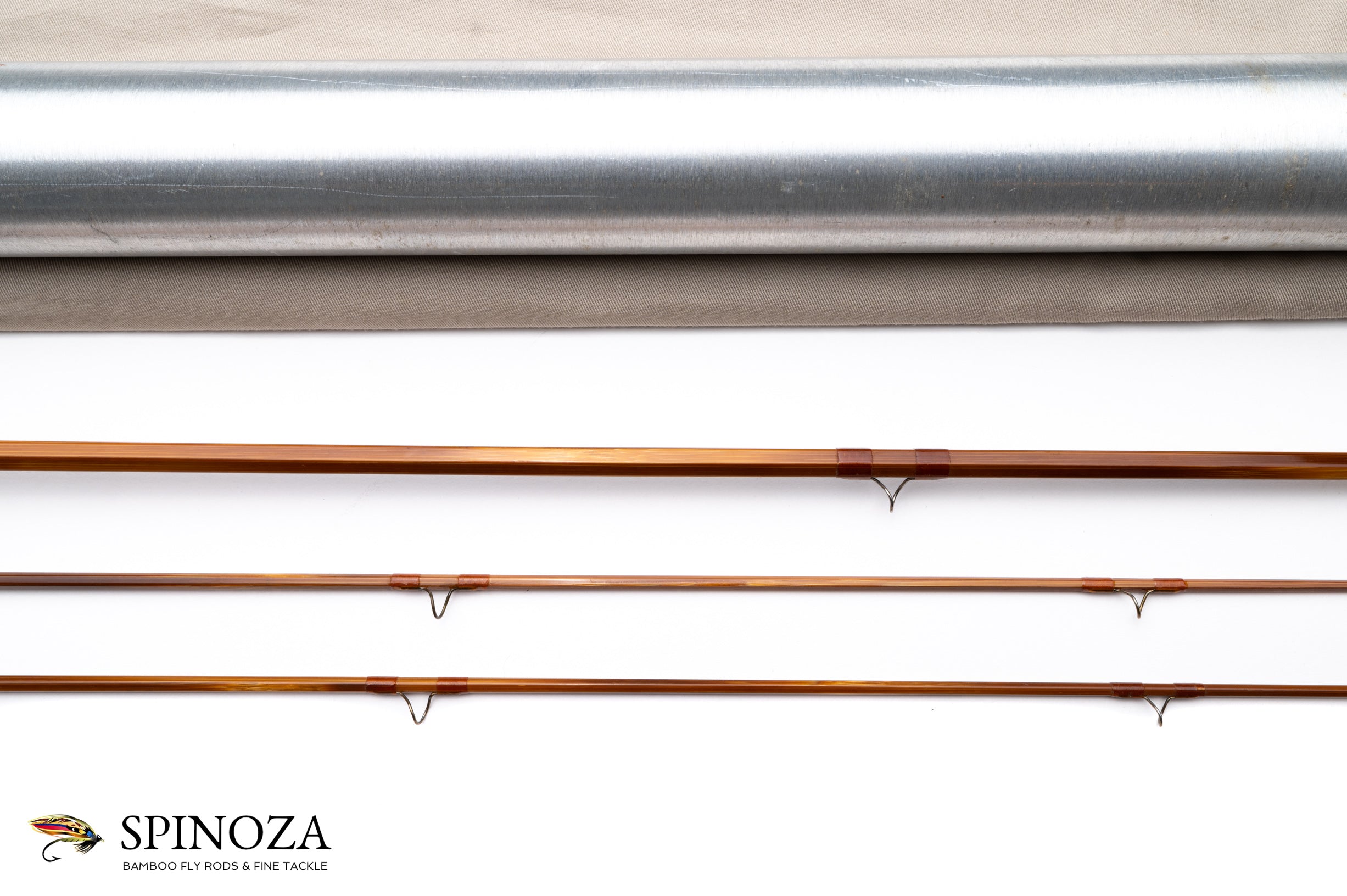 A George Maurer / Sweetwater "Rocky Mt. Special" model fly rod, 7'9", 2-piece, 2-tips, and built for a #5 or #6 line. Serial #2002-02. The rod weighs 4.3 ounces on my scale. Semi full flexing action. Used but very good condition. Blonde cane done in a three up node pattern and a light coat of varnish. The main wraps are light brown with no edges. Black stripper and black snake guides with only moderate signs of wear. Casting cracks at the male ferrule wraps. The ferrules are oxidized Super Z style. The grip is 6 1/2" long and turned to a medium cigar. The cap and ring seat are oxidized and the cap retains about 80-85% of the original oxidation. The spacer is a burl walnut. The rod packs into an eggshell cloth bag and a brushed aluminum tube with brass fixtures.