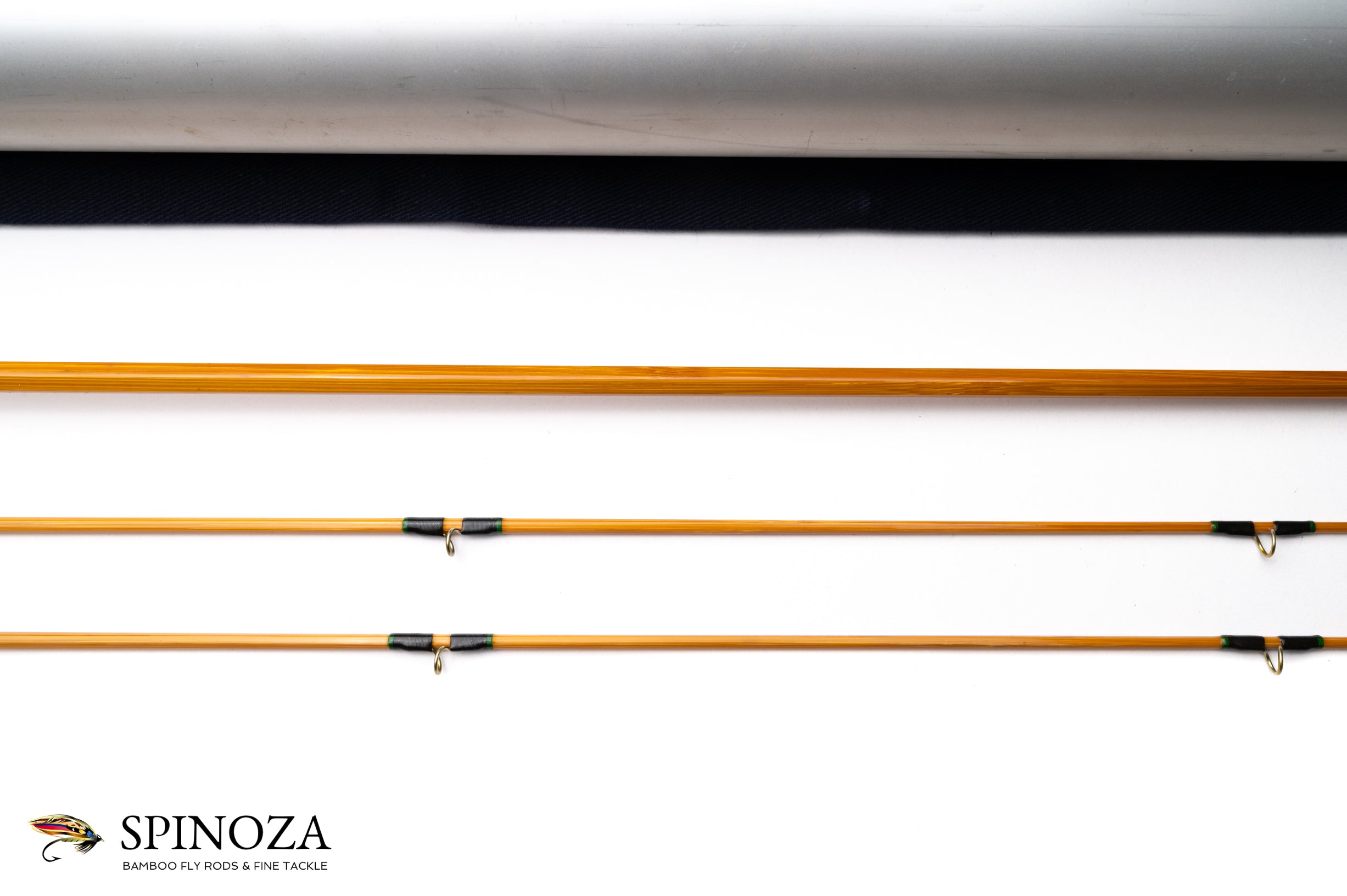 A nice Hardy Palakona bamboo fly rod, 7'6", 2-piece, 2-tip, and built for a #6 line. The rod weighs 3.6 ounces on my scale. Mint unfished condition. the action is a tiny bit into the slow side of medium. Wheatstraw color cane with a three up node pattern. Black main wraps with green edges. Chrome snake guides. Oxidized step ferrules. The grip is 5 1/2" long and tapers at the nose to the front cork check. The all cork reel seat has an aluminum slide band and pocket cap. The aluminum bottom cap is stamped "Made by Hardy, England". The ferrules have the original factory fit and the rod is perfectly straight. The rod packs into a heavy blue cloth bag and a large aluminum tube.