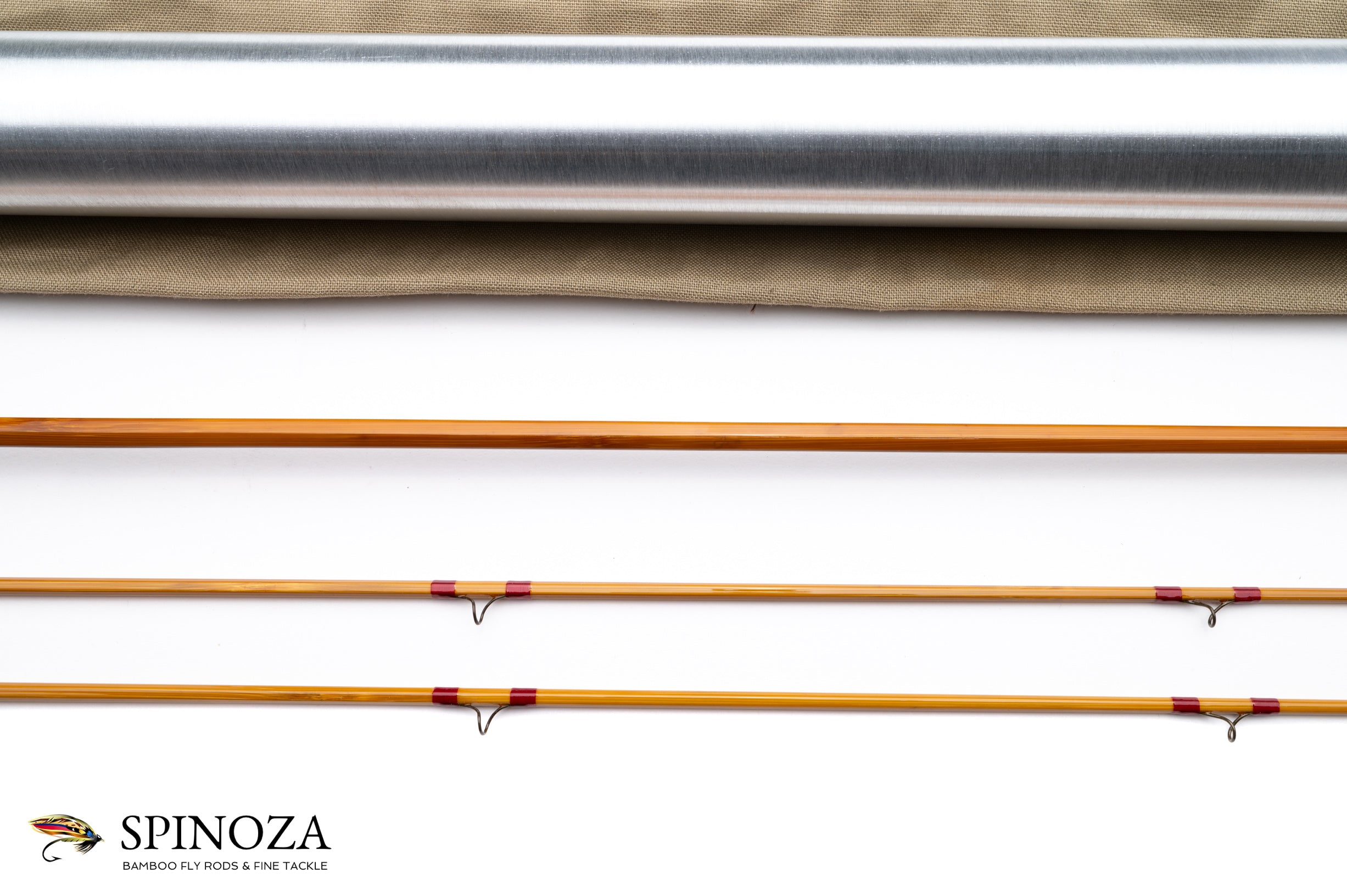 A nice H.L. Leonard model 39-5 bamboo fly rod, 7'6", 2-piece, 2-tip, and built for a #5 line. Refinished by Sam Carlson. Unfished since then. Paper and gum strips still on the grip. High quality dip finished and the rod comes with one of Sam’s brown cloth bags. New non-original rod tube. The tips may have been replaced by Sam also. Blonde cane, three up node pattern. Red main wraps with no edges. Perfection stripper and black snake guides. The Leonard step ferrules fit well and are polished. This rod is ready for another lifetime of fishing. The grip is 5 1/2" and turned to a medium cigar profile. The seat is comprised of a butternut spacer under a slide band and a pocket cap. The die stamp reads: “The Leonard Rod / H.L. Leonard Rod Co. / Makers” and outside the cartouche “Reg. U.S. Pat. Off.” As stated, the bag is one of Sam’s and the tube is