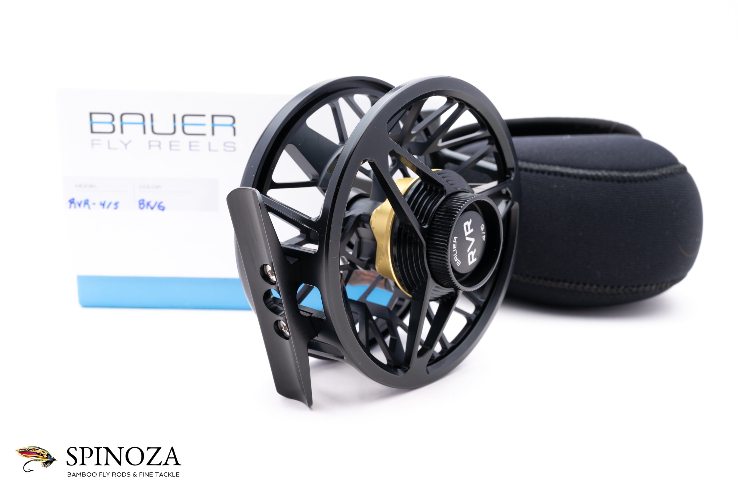 A Bauer RVR fly reel, 3 1/2" diameter and set up for LHW. Mint, unused condition. The reel weighs 4.9 ounces on my scale. Black anodized frame with gold accents on the spool and interior drag housing. Highly ported large arbor design, and sized to hold #4/5 lines with capacity for up to a WF5 and and 75 yards of backing. The reel packs into the original black neoprene pouch and box with paperwork.