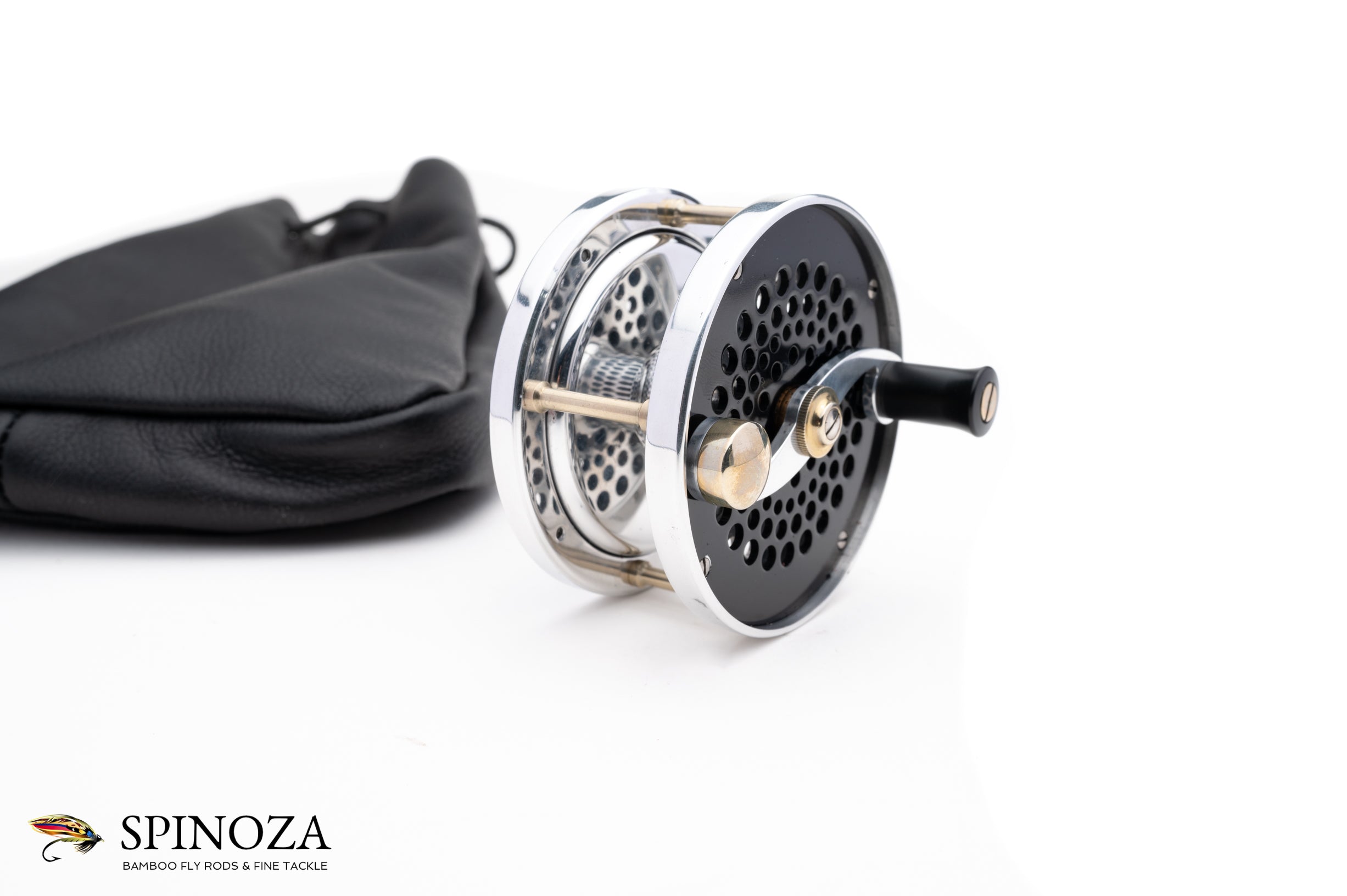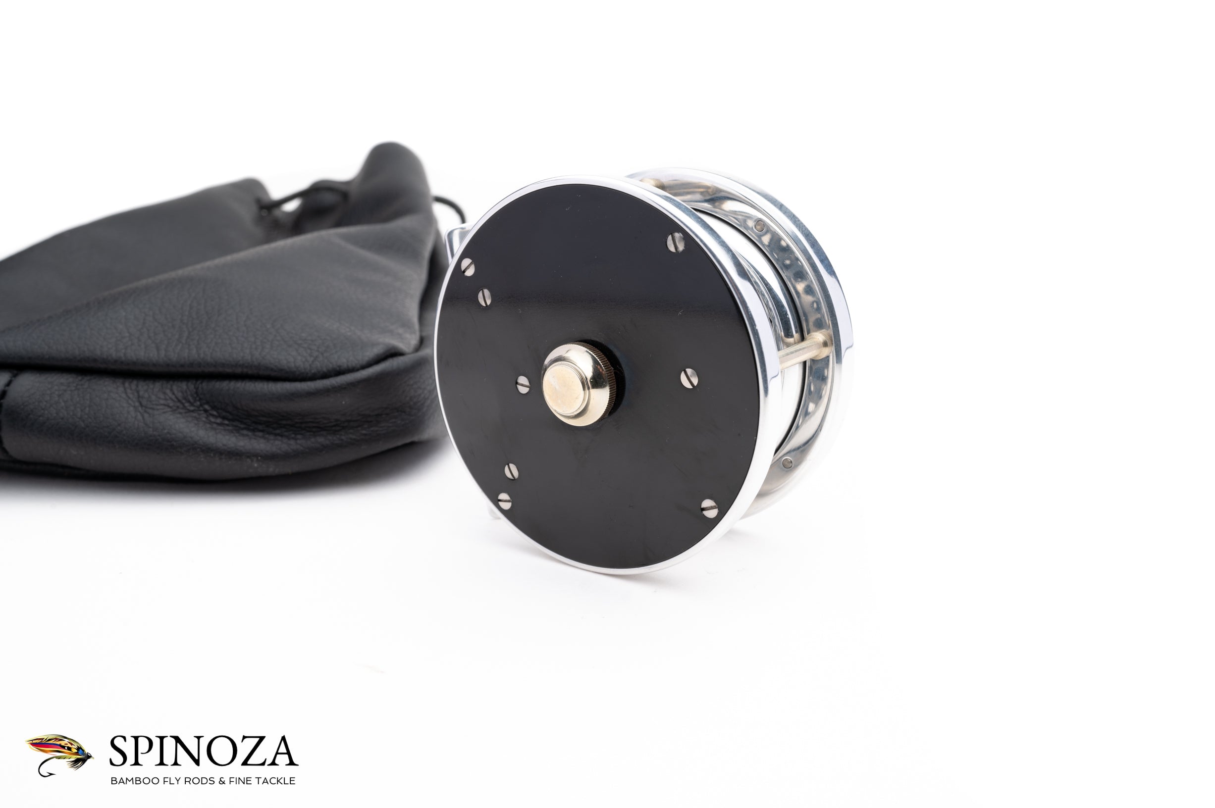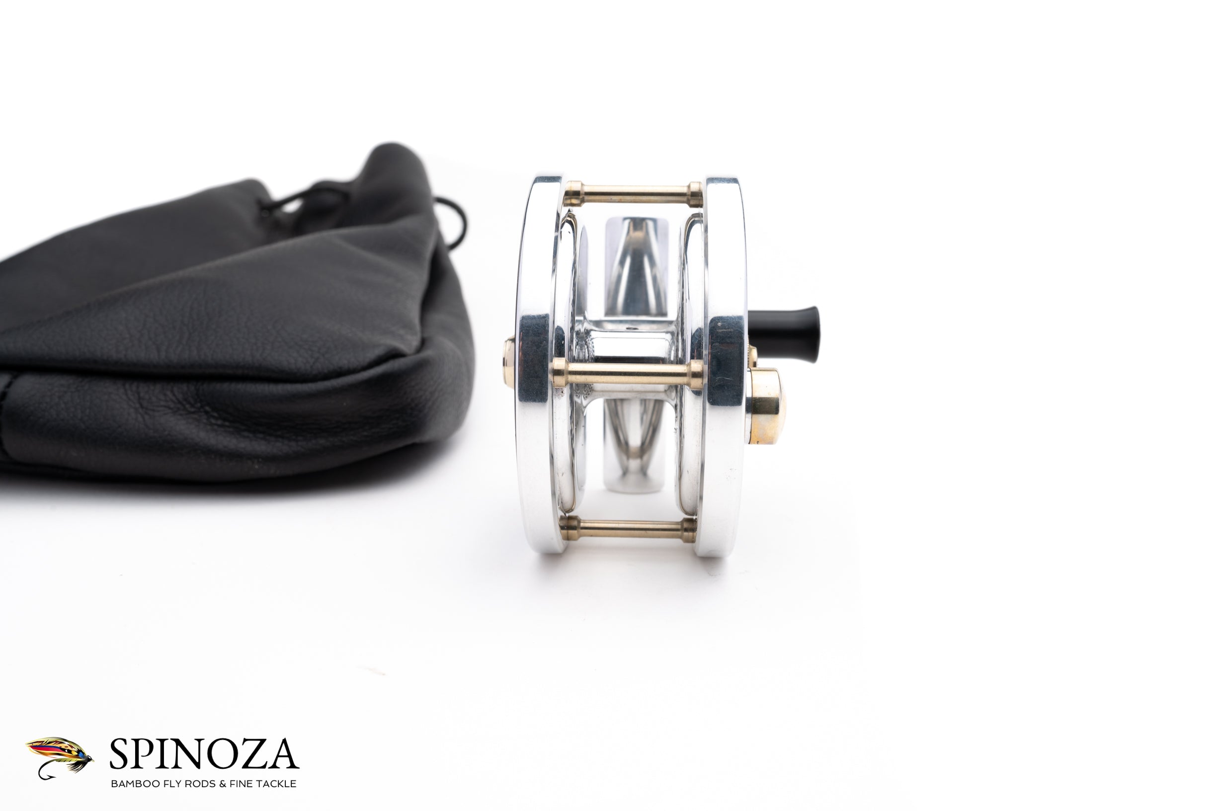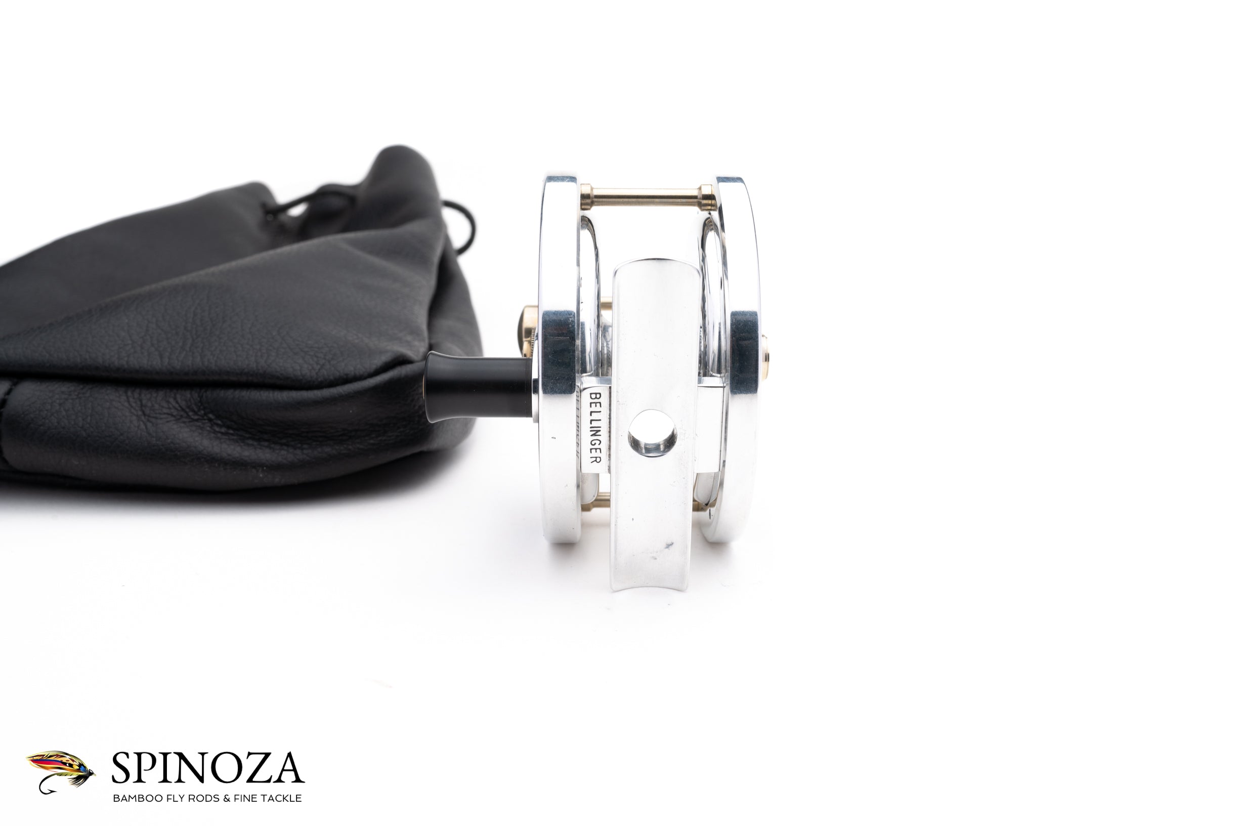 A nice Bellinger Classic fly reel, 2 3/4" and set up for LHW (I believe these can be converted to RHW). The reel shows no signs of having ever been fished. A traditional Vom-Hofe style S-handle reel with polished aluminum rims, spool, S-handle arm, and foot. Stainless pillars and screws. Delrin sideplates. Nickel silver oil cap, handle tub and screw, and counterbalance. Fixed click. The sideplates and spool are ventilated on the cranking side. The reel weighs 4.8 oz on my scale. Designed to hold a WF4+30yds. The reel packs into the original black leather drawstring bag with the Bellinger logo stamped into the side. A nice little classic trout reel.