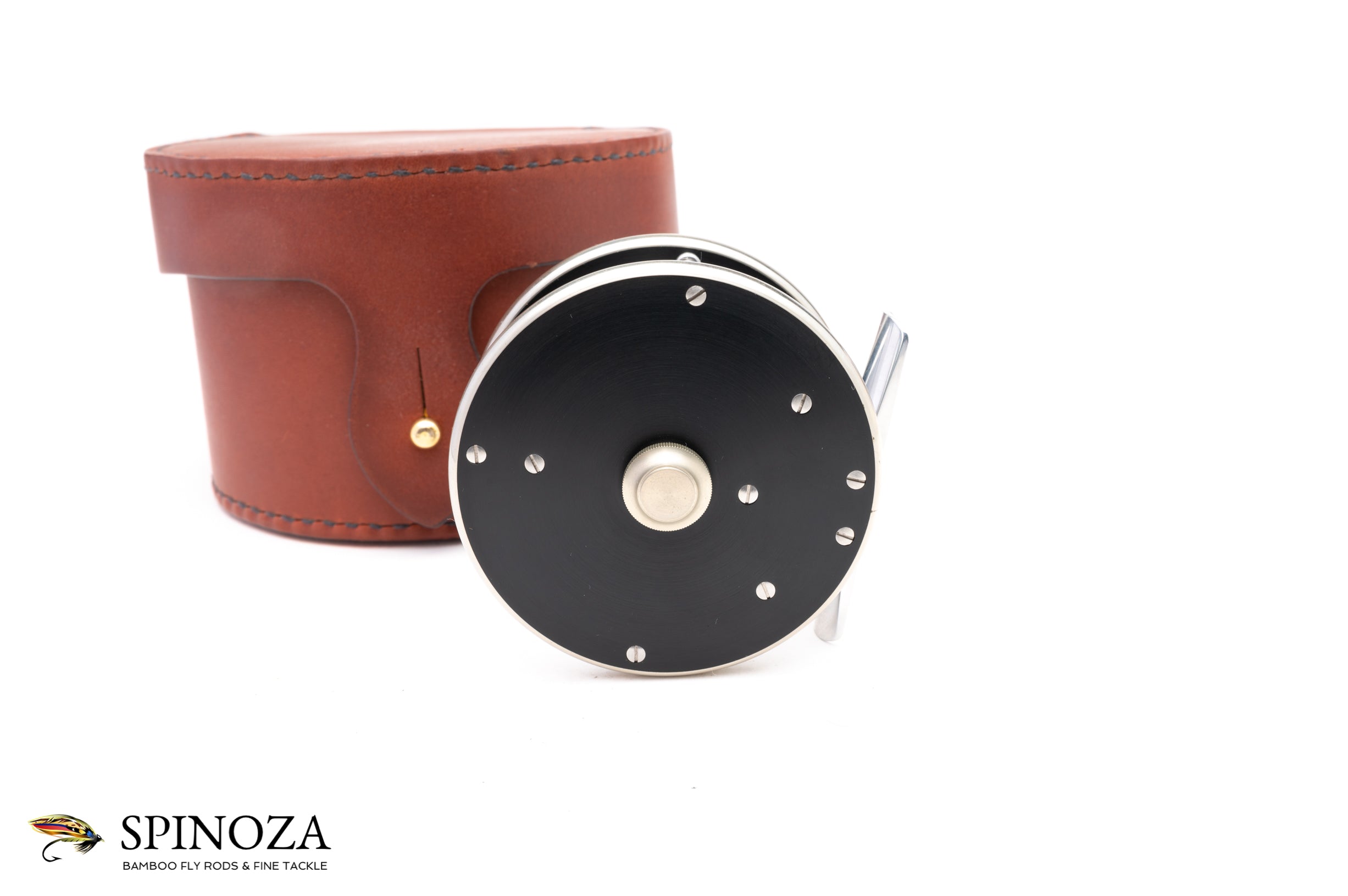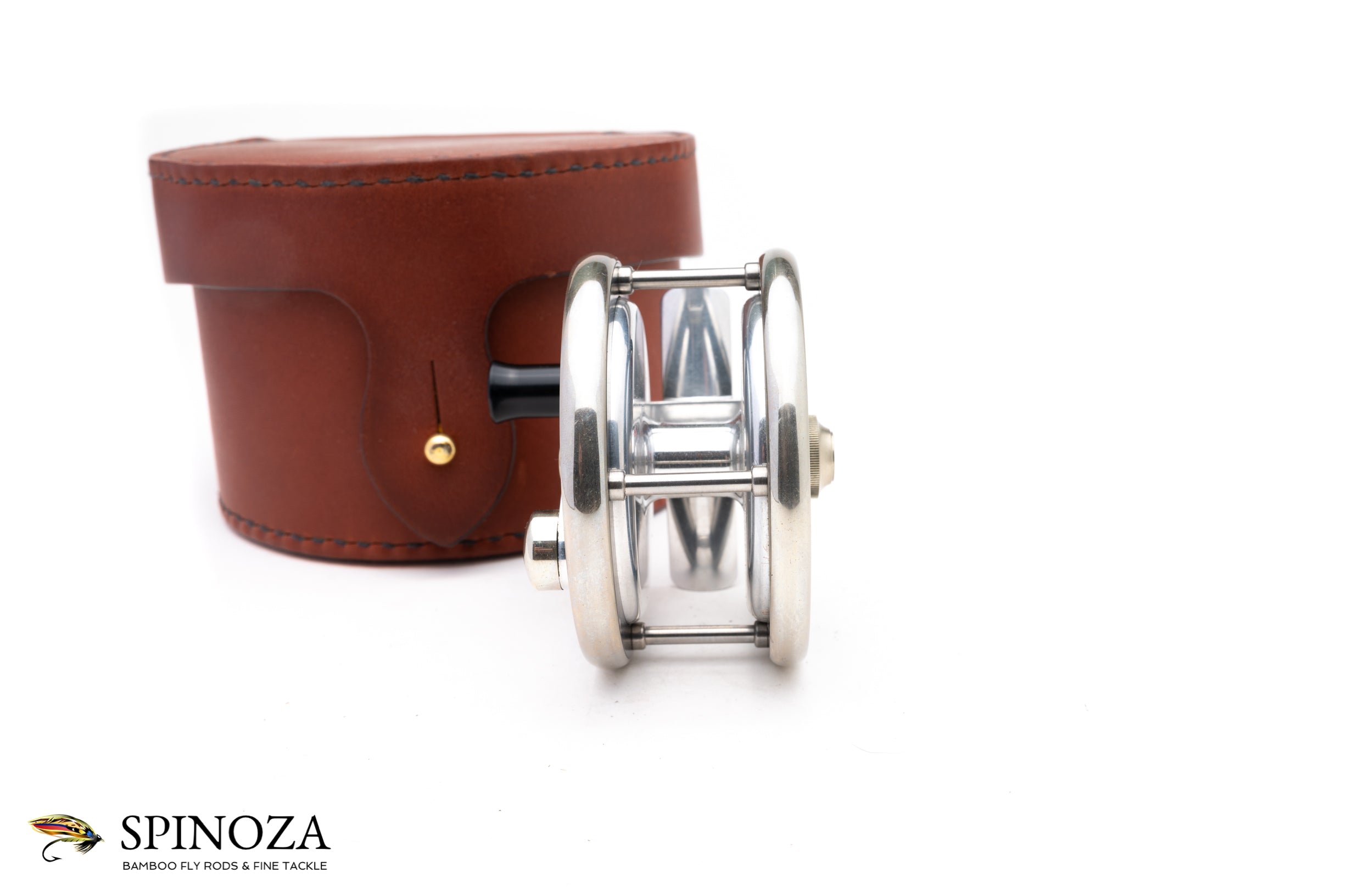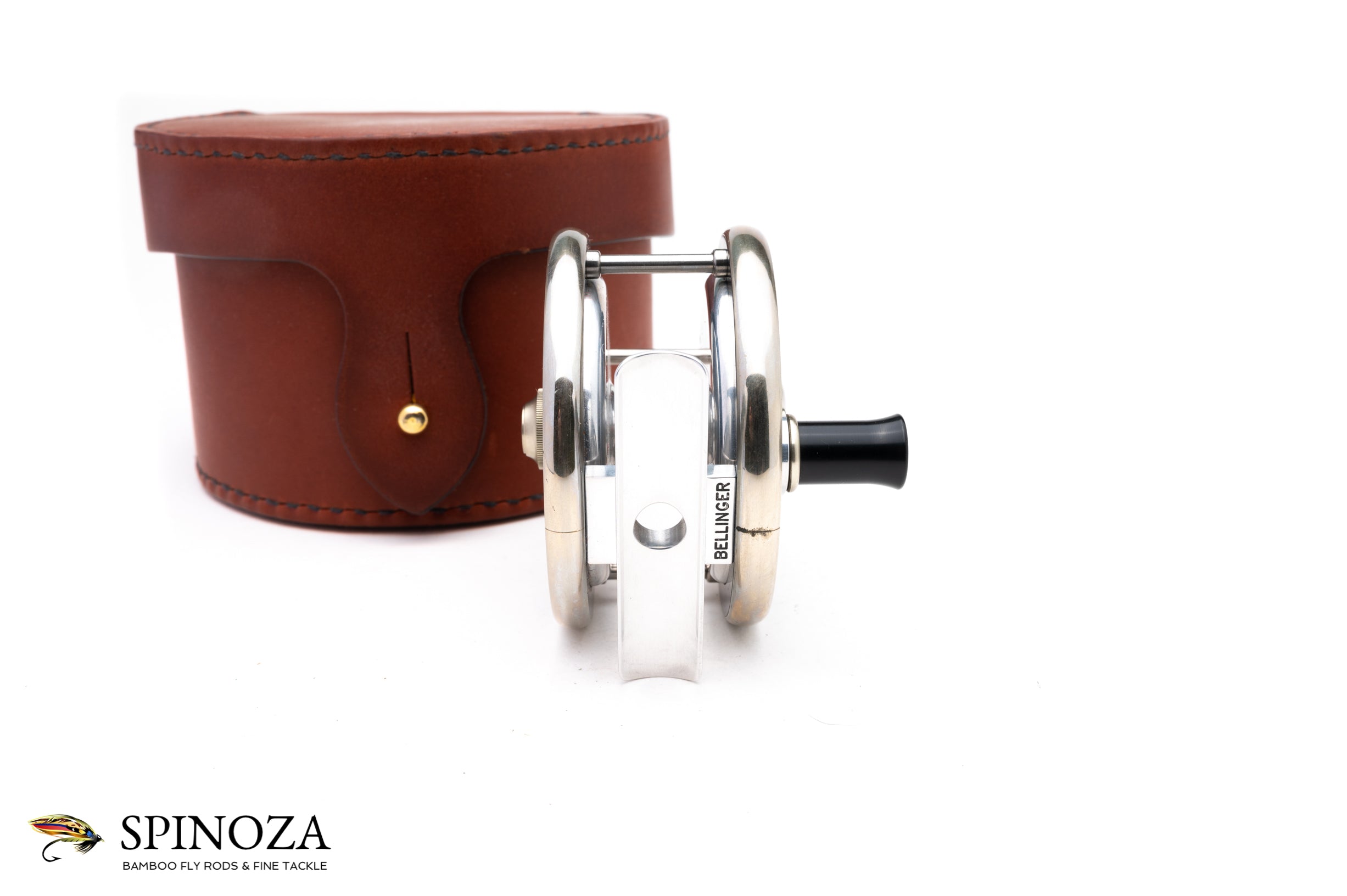 A handsome Bellinger Nickel Silver Fly Reel in 2 3/4" size. LHW. Black delrin side plates with a beautifully proportioned serpentine handle. Fixed drag. Highly polished nickel silver frame and has clearly never been used or lined. Comes in an Arnie Mason leather case. Designed to hold a DT3 or WF4 and 25 yards of backing. A very nice little S-handle reel to pair with your small stream bamboo rod.