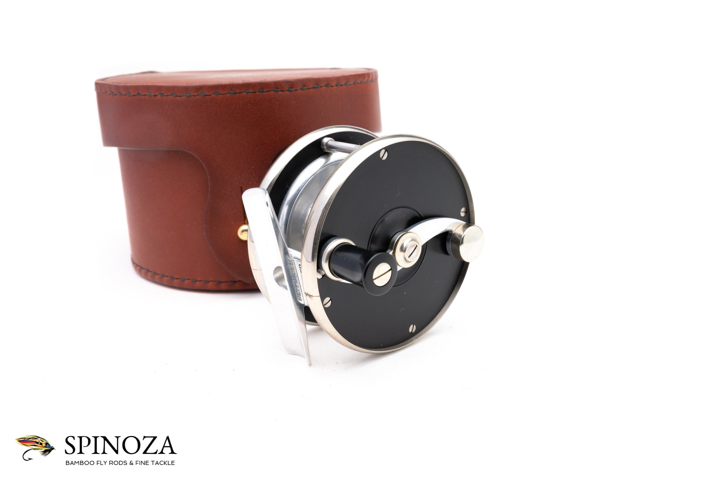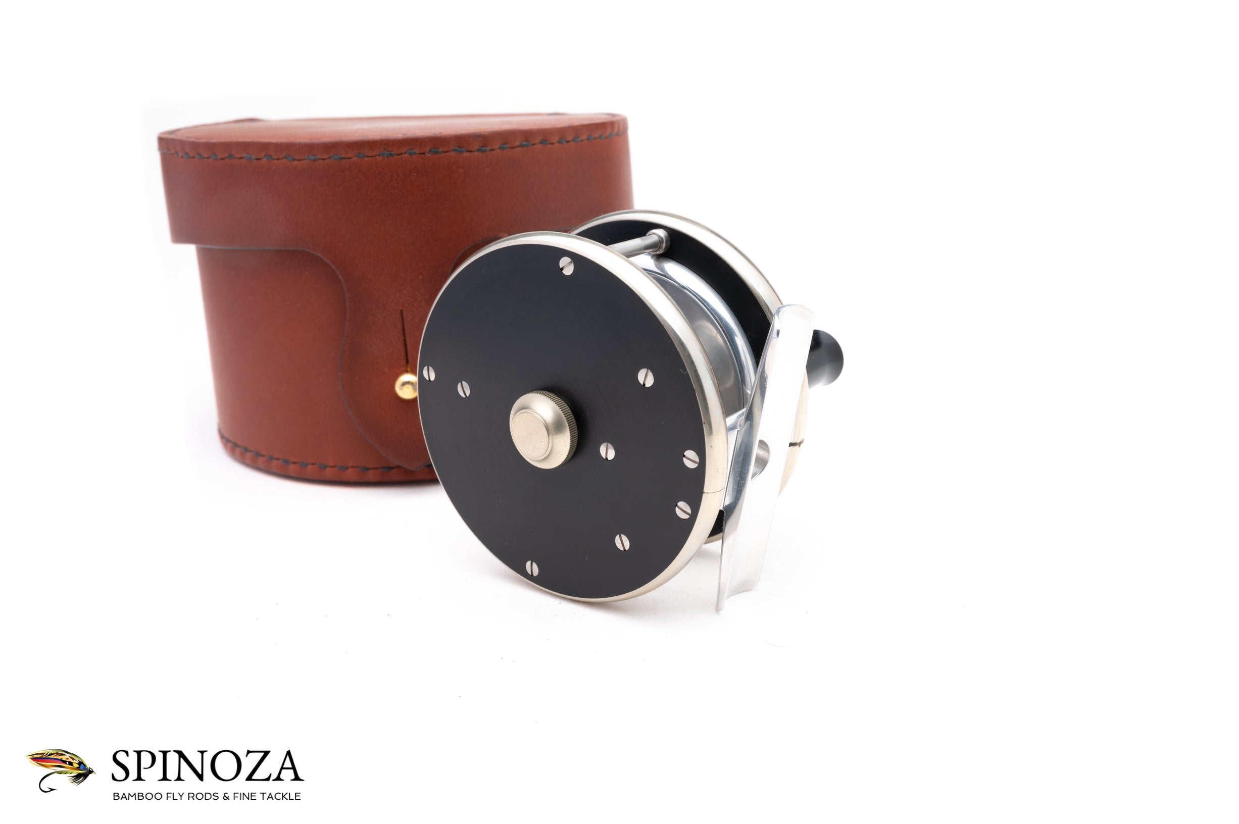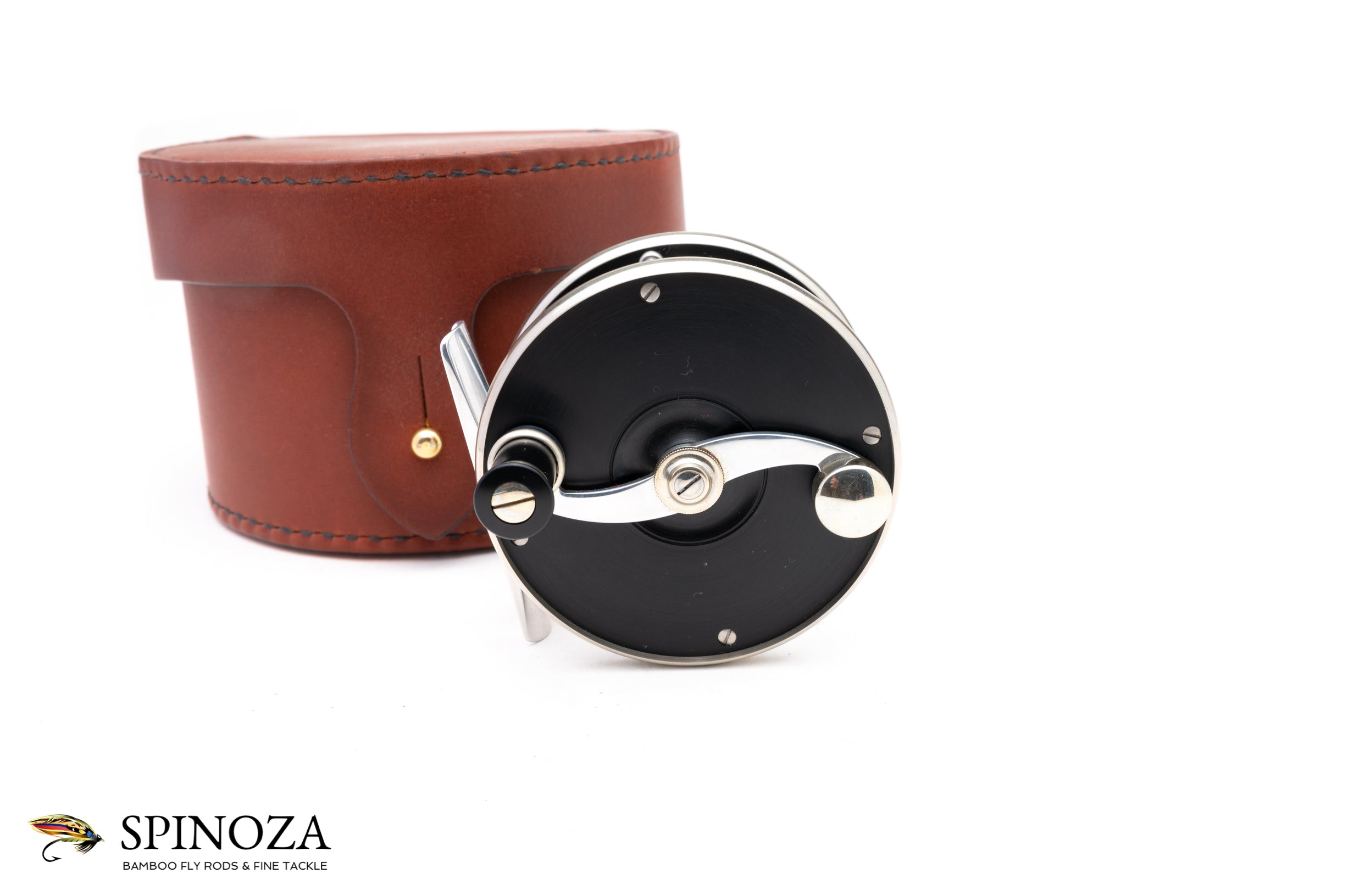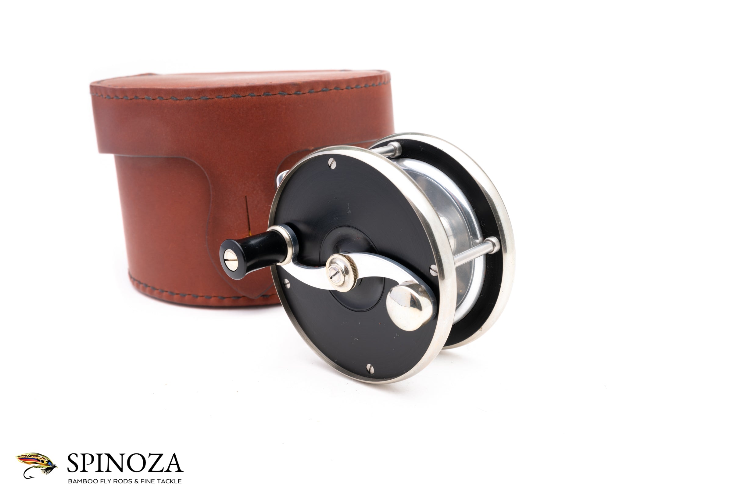 A handsome Bellinger Nickel Silver Fly Reel in 2 3/4" size. LHW. Black delrin side plates with a beautifully proportioned serpentine handle. Fixed drag. Highly polished nickel silver frame and has clearly never been used or lined. Comes in an Arnie Mason leather case. Designed to hold a DT3 or WF4 and 25 yards of backing. A very nice little S-handle reel to pair with your small stream bamboo rod.