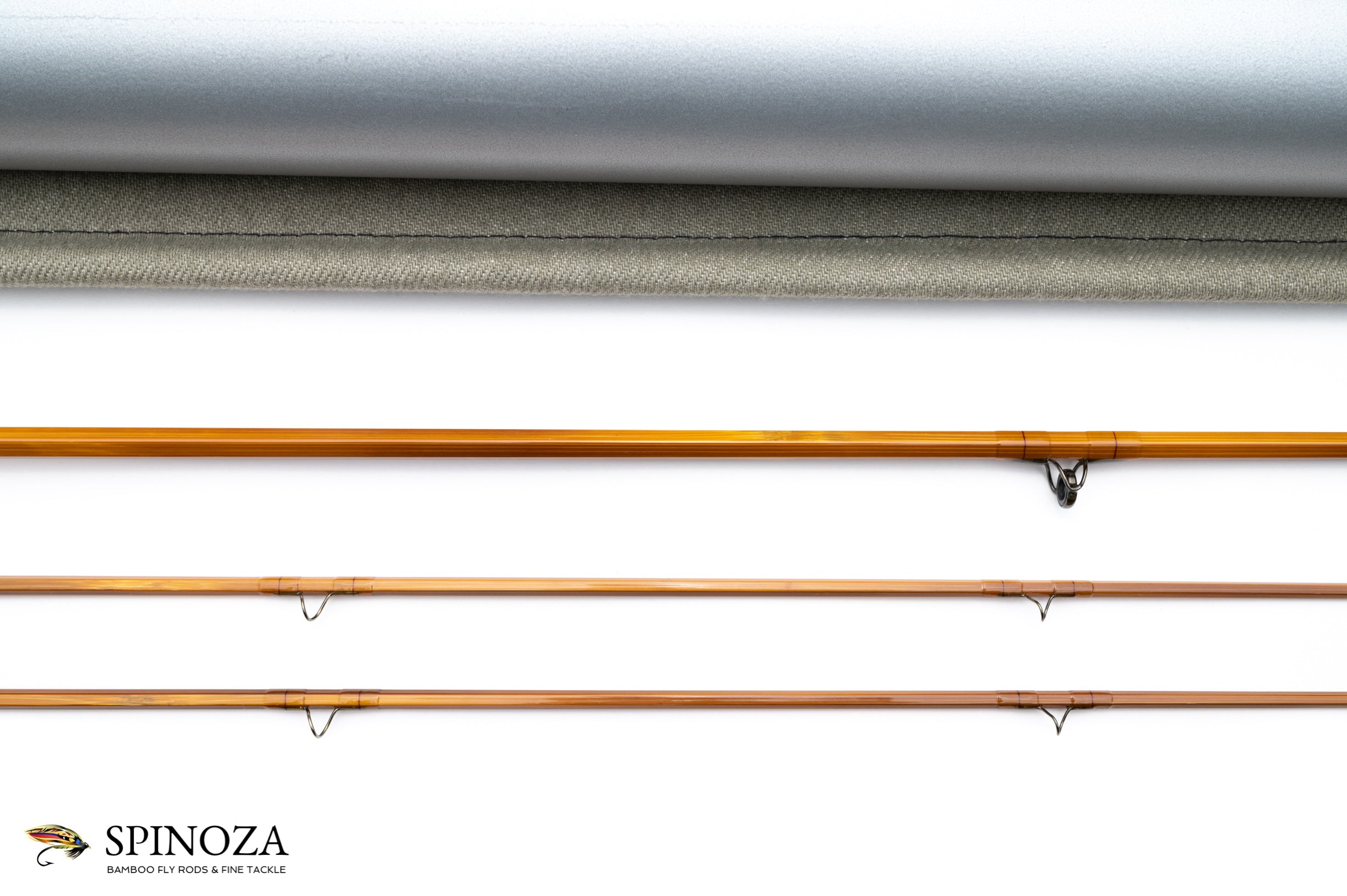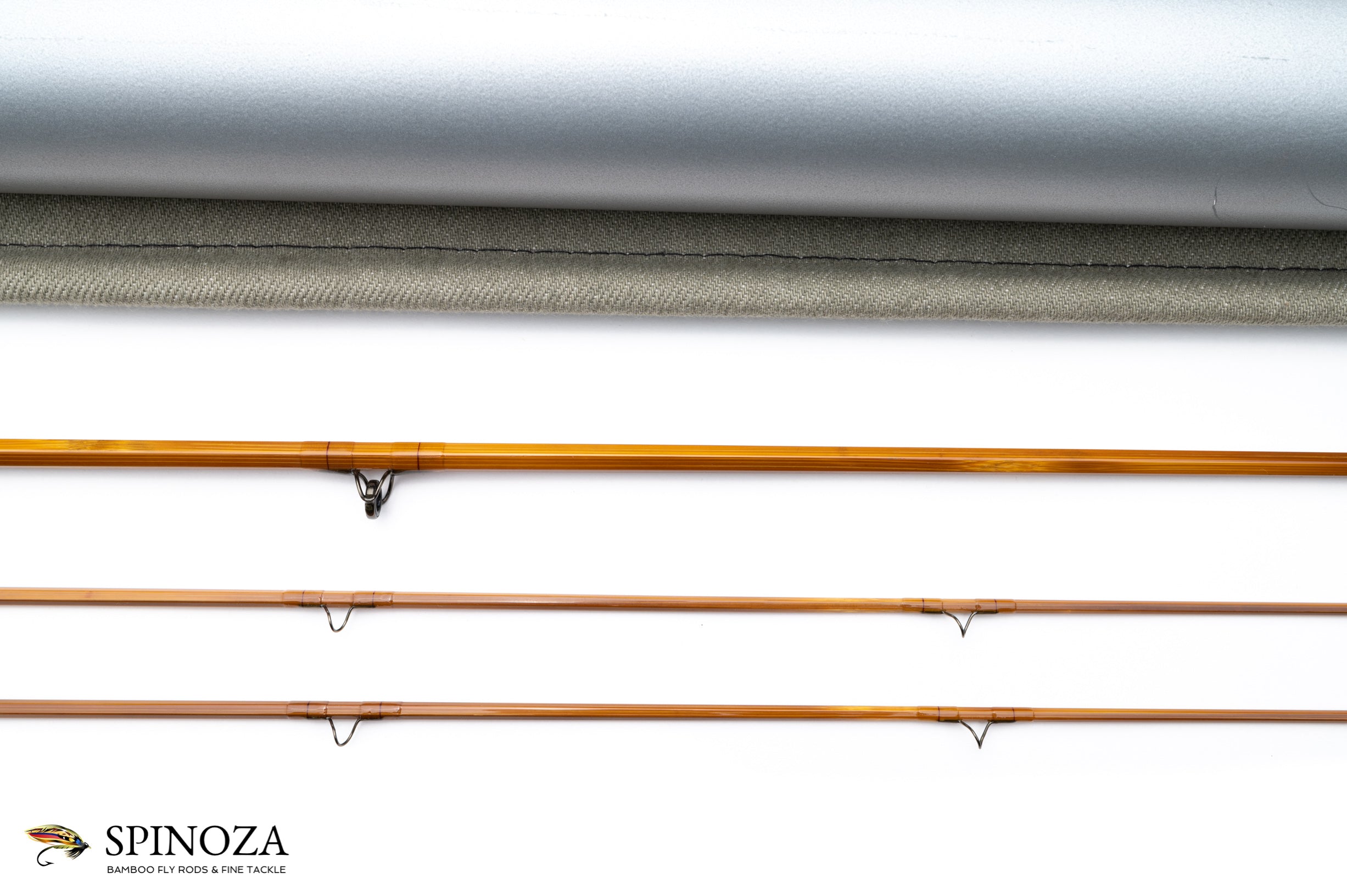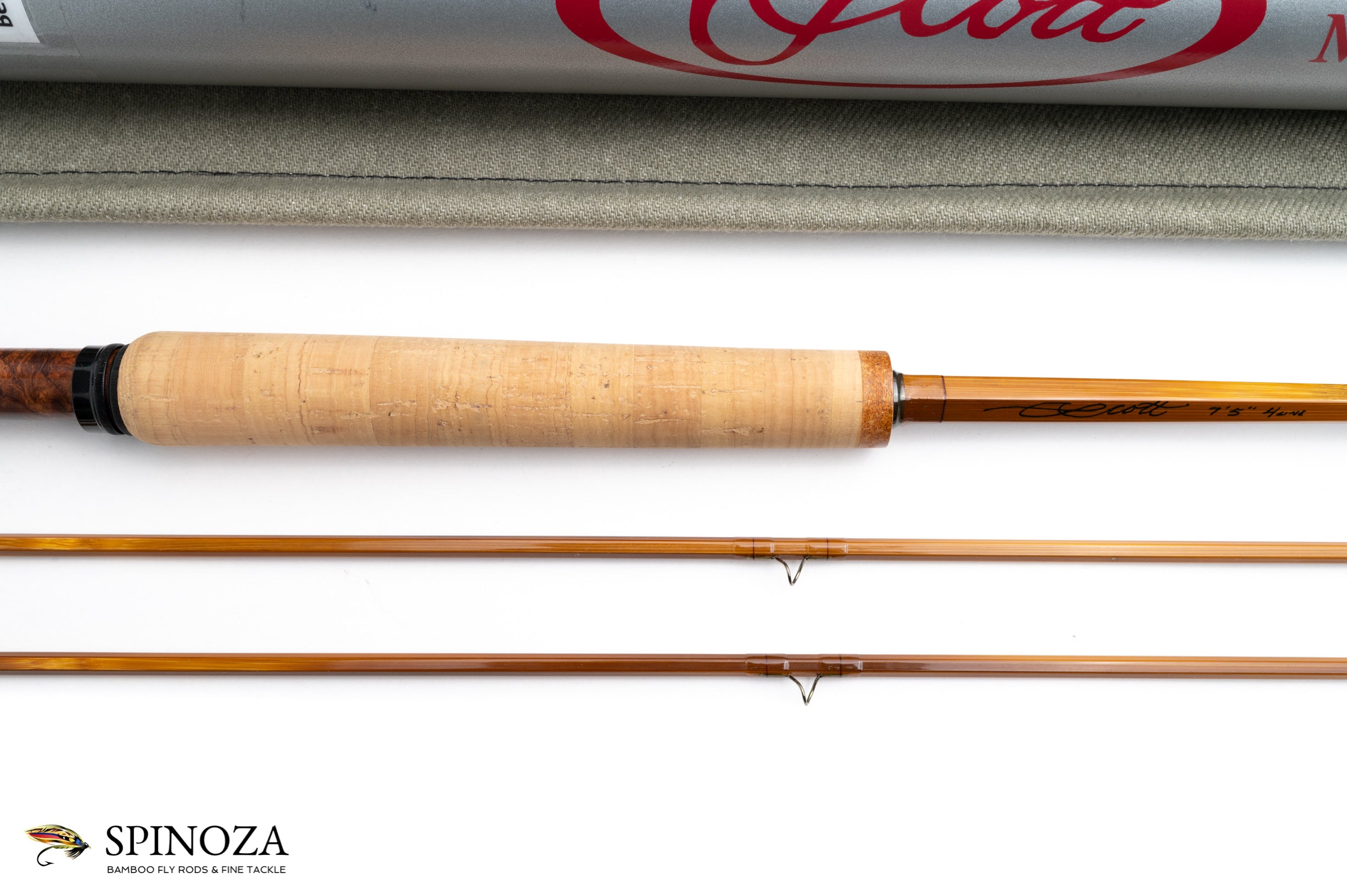 A Bernard Ramanauskas fly rod built for Scott, a model SC754, 7'5", 2-piece, 2-tip, built for a #4 line. Serial #0126. Rod appears to be mint, unfished. Medium, full flexing action. Light wheat straw cane done built with a three up node pattern construction. "Scott" inked in a flowing script on the butt shaft along with "7'5" 4 line" and two flats from there is Bernard's signature with the model number "SC754" and the serial number "#0126". Above the lettering is a spiral set of spaced signature wraps done in red. Excellent varnish overall. Clear wraps with a solitary black thread at the center of each wrap. Modern, relatively flat tapered profile grip with a slight curve at the rearmost cork and a half-cork of composite at the uppermost ring. Front and rear black matte cork checks. The spacer is a highly figured stabilized wood, and the cap and ring are oxidized black. Oxidized truncated swiss-style ferrules. The rod is nice and straight and the ferrule fits are good. There is a very tiny nick in the varnish about 6" up from the grip, likely from handling at some point. Comes in a heavy gray bag with stiffener and black trim and a gray Scott tube with bright aluminum fittings and Scott sticker.