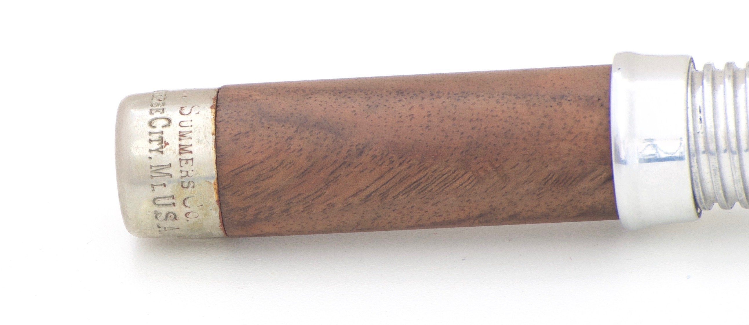 The rod features handsome flamed cane with exquisitely wrapped transparent, caramel brown silks with black tipping. The script remains clean and bold. Garrison-style hook keeper. Full wells grip measures 6" in length with light soiling. Bright aluminum down-locking reel seat over a mortised walnut burl spacer. "R.W. Summers Co. Traverse City, M.I. U.S.A." is stamped on the butt cap. The ferrule fit is excellent. The rod weighs 4.65 oz. Medium-fast and parabolic. Includes original labeled bag with attached ferrule plug and tube with Summers' unique brass fittings.