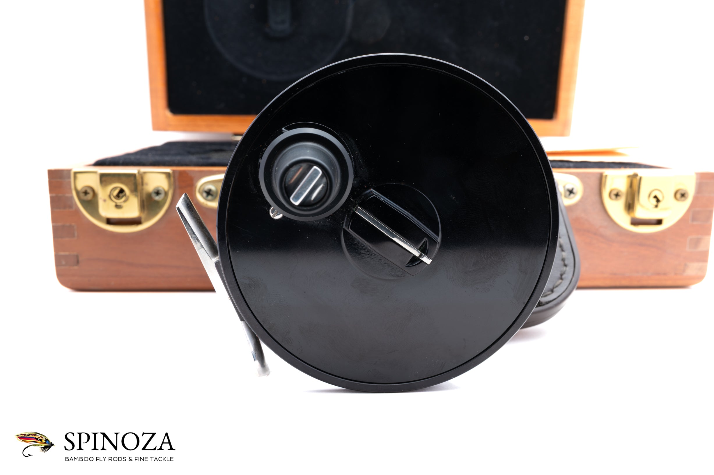A scarce API Sea Run fly reel designed and patented by Oscar Kovalovsky. 3 3/4" diameter and set up for RHW. Anti-reverse. Made in the late 1980s by Angling Products Inc. in Upper Saddle River, New Jersey. Serial #48 of 100 made. The reel does not appear to have been fished at all. It weighs 10.4 ounces on my scale. The spool width is 1". Black anodized finish and the reel comes in a handsome wooden display box with extra hardware and paperwork. A rare one!