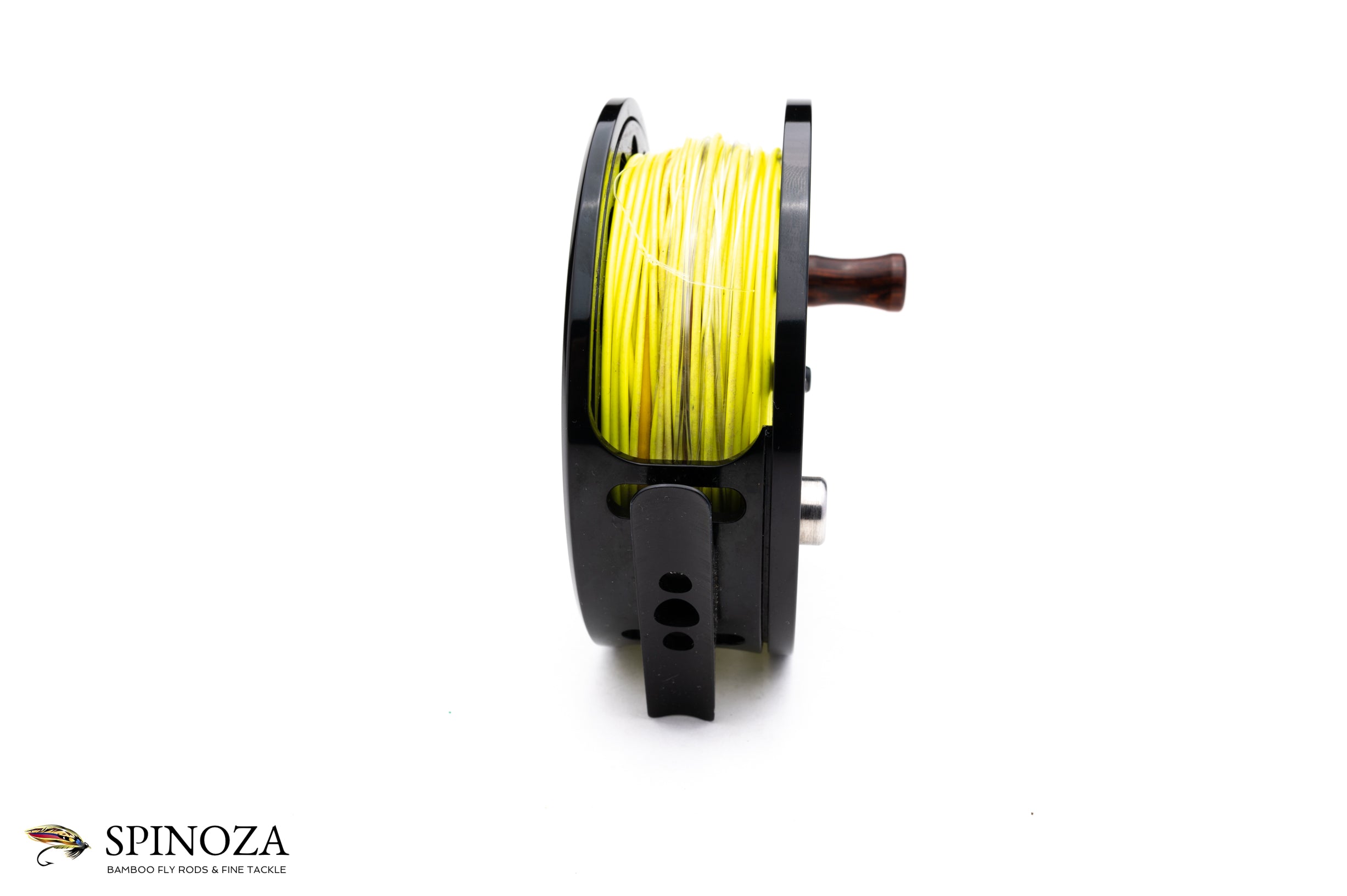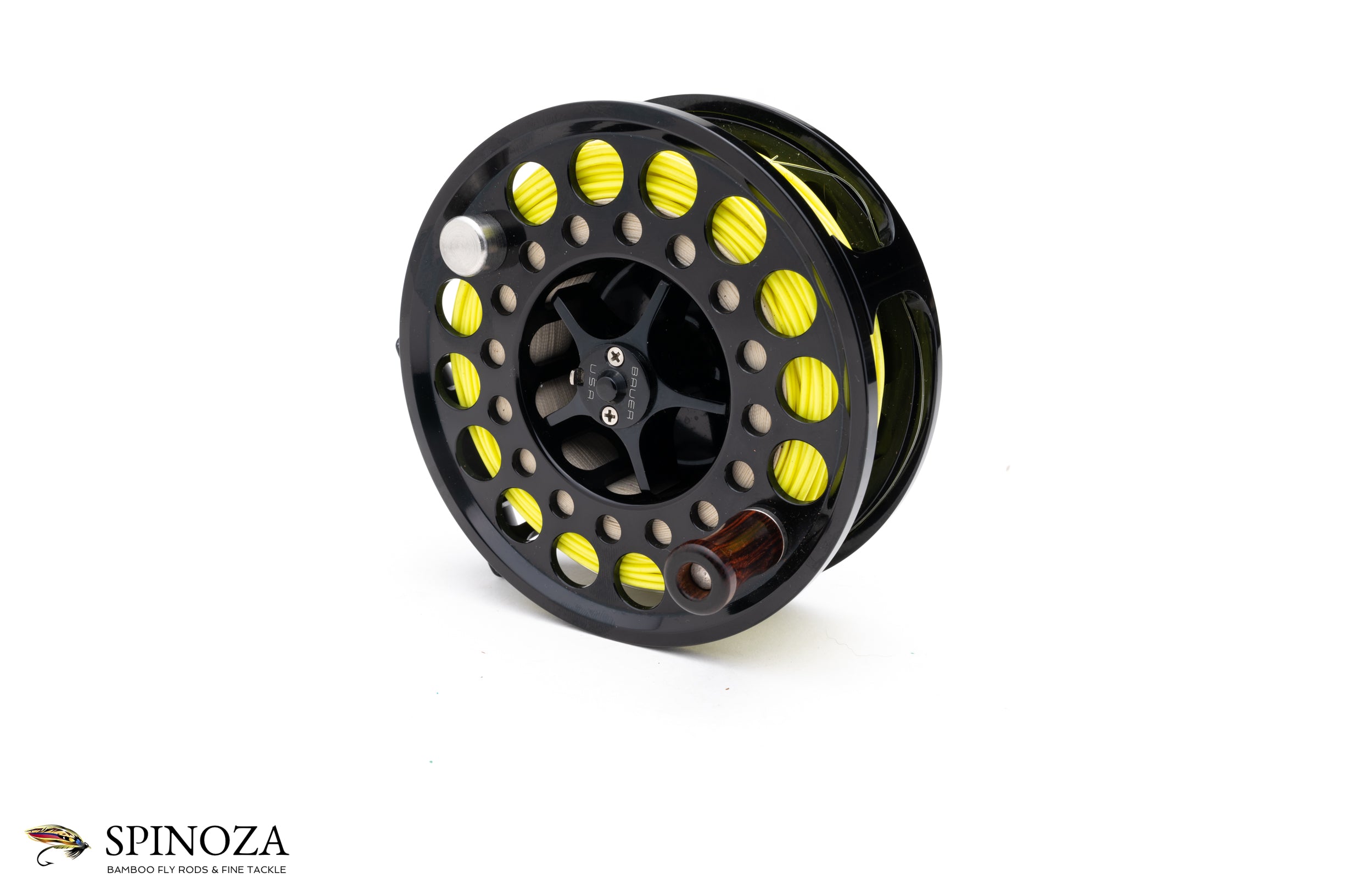 A nice Bauer M6 fly reel, 4 1/2" diameter and set up for RHW. Black anodized throughout. Catalog weight of 9.6 ounces but weighs 13.5 ounces with a line and backing loaded on it. Near mint condition with just a few tiny marks here and there. Designed to hold 10-12 weight lines and up to 325 yards of backing. Adjustable silent drag with plenty of stopping power. Packs into the original neoprene Bauer pouch.