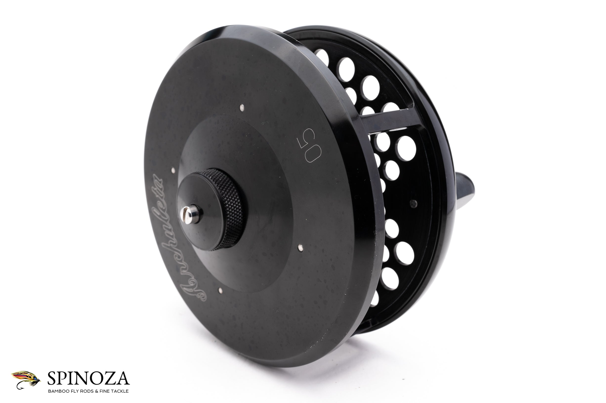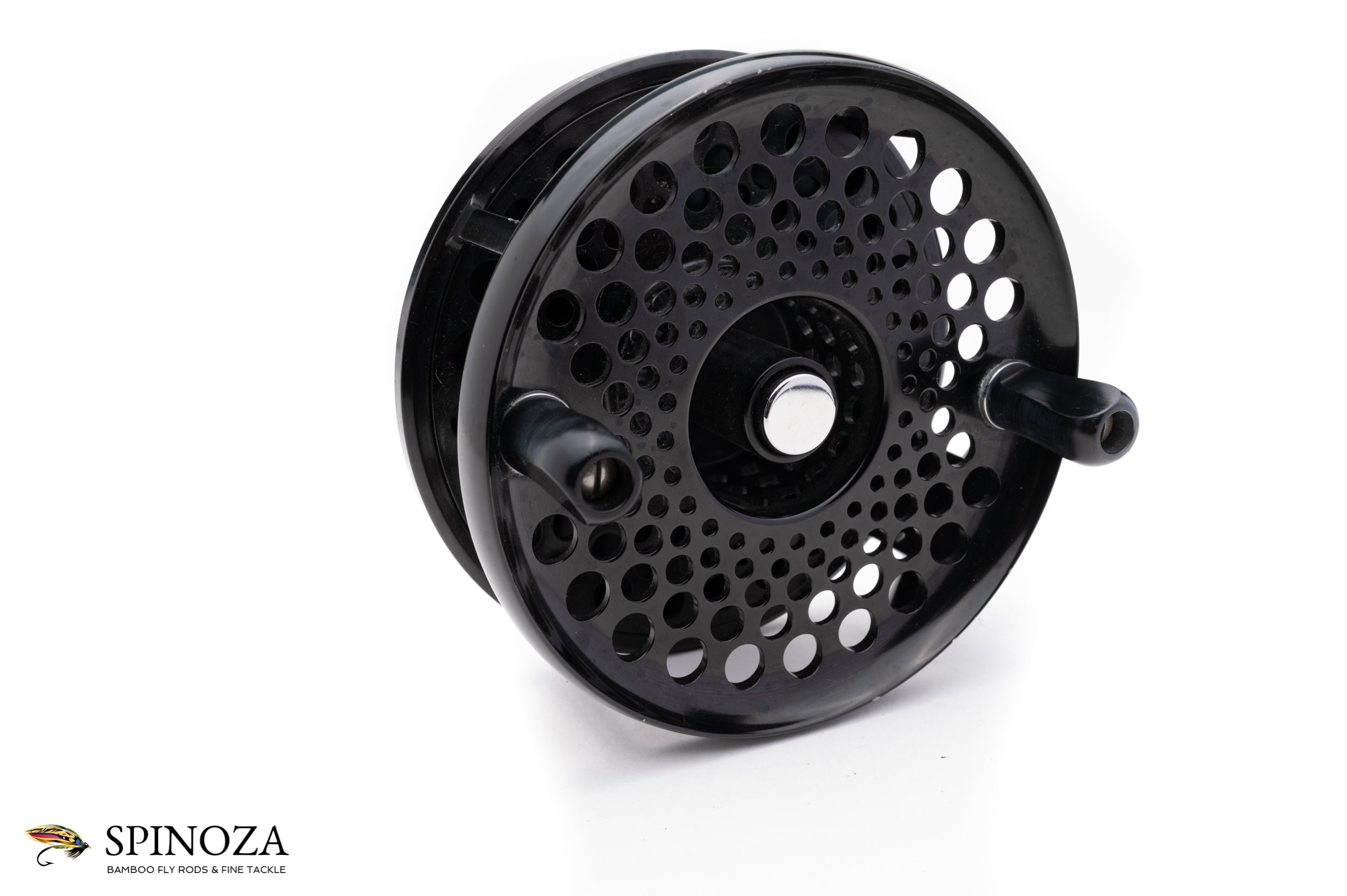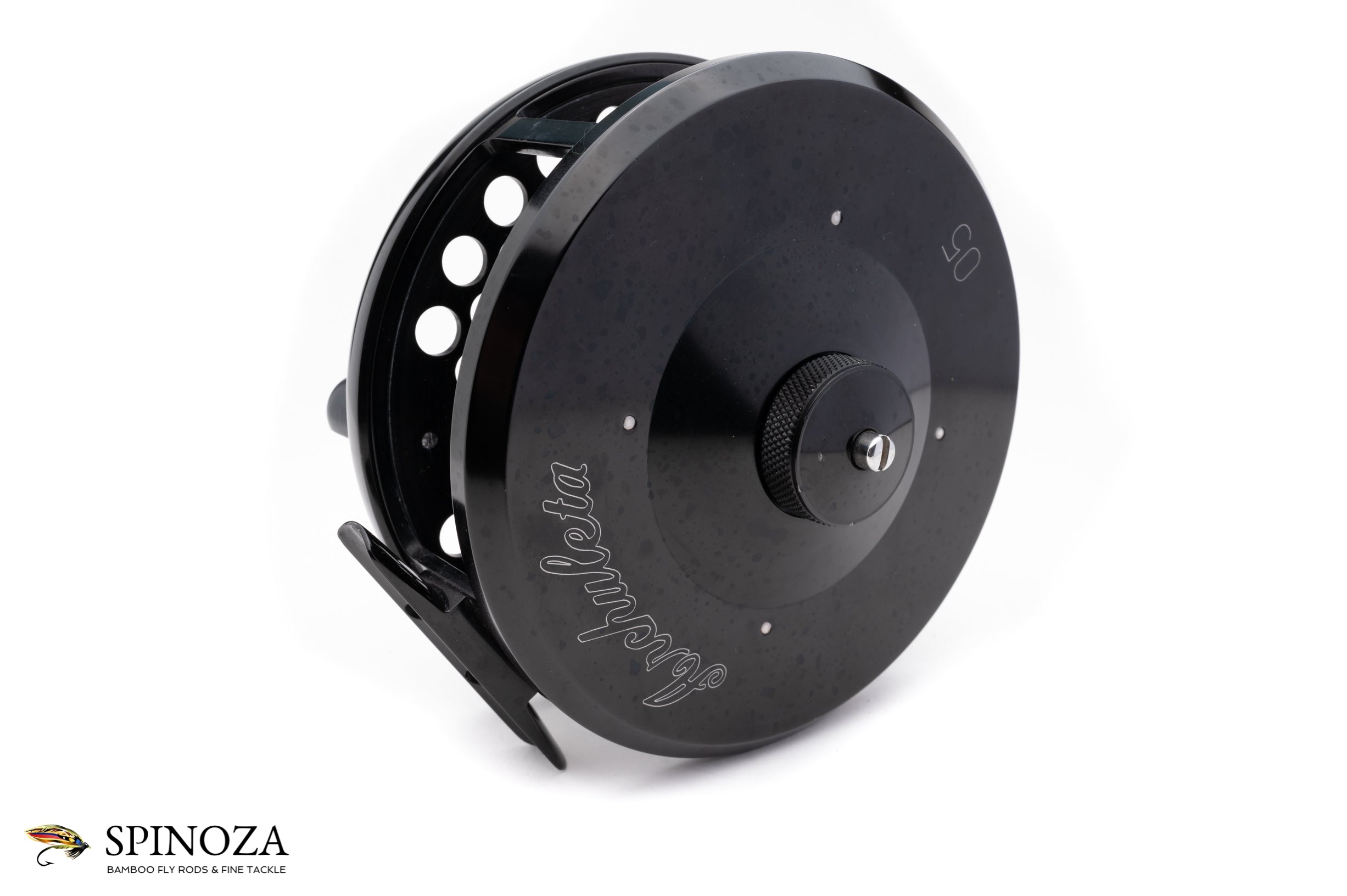 A rare Bill Archuletta fly reel, set up for LHW. 5" diameter with a 1 1/4" spool width. Black anodized throughout with the sole exception being a bright spindle cap holding the spool on. Heavily ported throughout, including the spool drum, with the sole exception being the rear faceplate. Good used condition with some modest wear marks on the frame and a little residue on the inside of the spool from old backing. Mechanically perfect and ready to go, with a nice click on the inbound while silent on the outbound. Dual handles on the spool. "Archuletta" is done in a flowing white script on the backplate as well as the number "05". I believe Bill does almost all of his reels on a custom basis so this was likely a custom order from one of his customers. No bag.