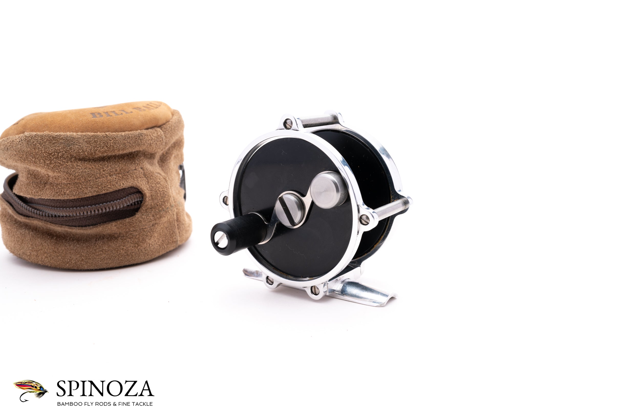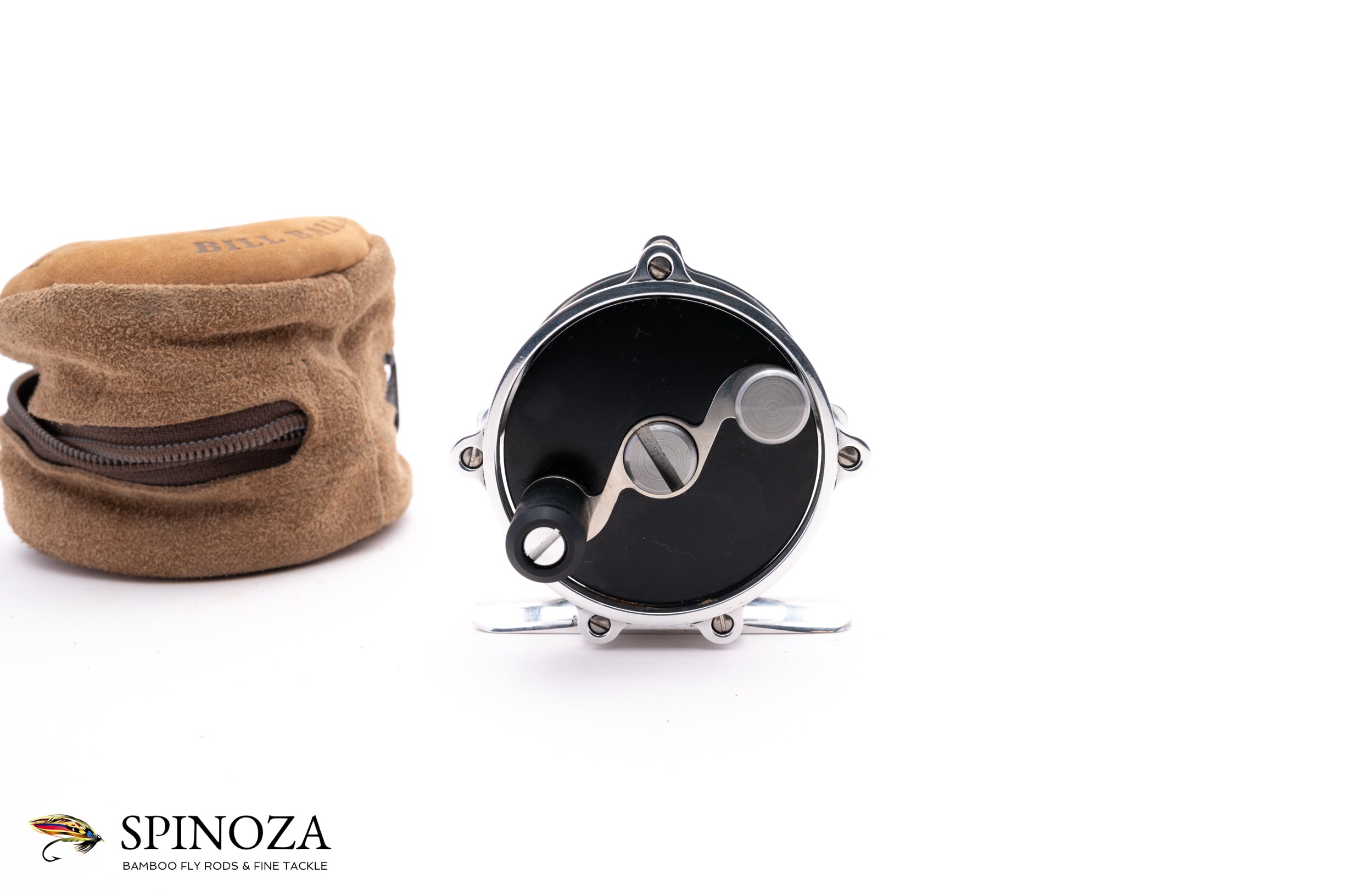 A Bill Ballan Midge Fly Reel, 2 1/2" diameter. Fairly neutral bias though with perhaps a slight favor to RHW. Near mint condition. The reel has some very minor cosmetic rubbing in a few places, though it may be from handling rather than fishing. It is very clean overall. Raised pillar design with an integrated s-handle. Black sideplates with a silver aluminum frame. 7/8" spool width. Designed for 3-weight or smaller rods. It comes in the original suede leather Ballan case with the logo embossed on one side.
