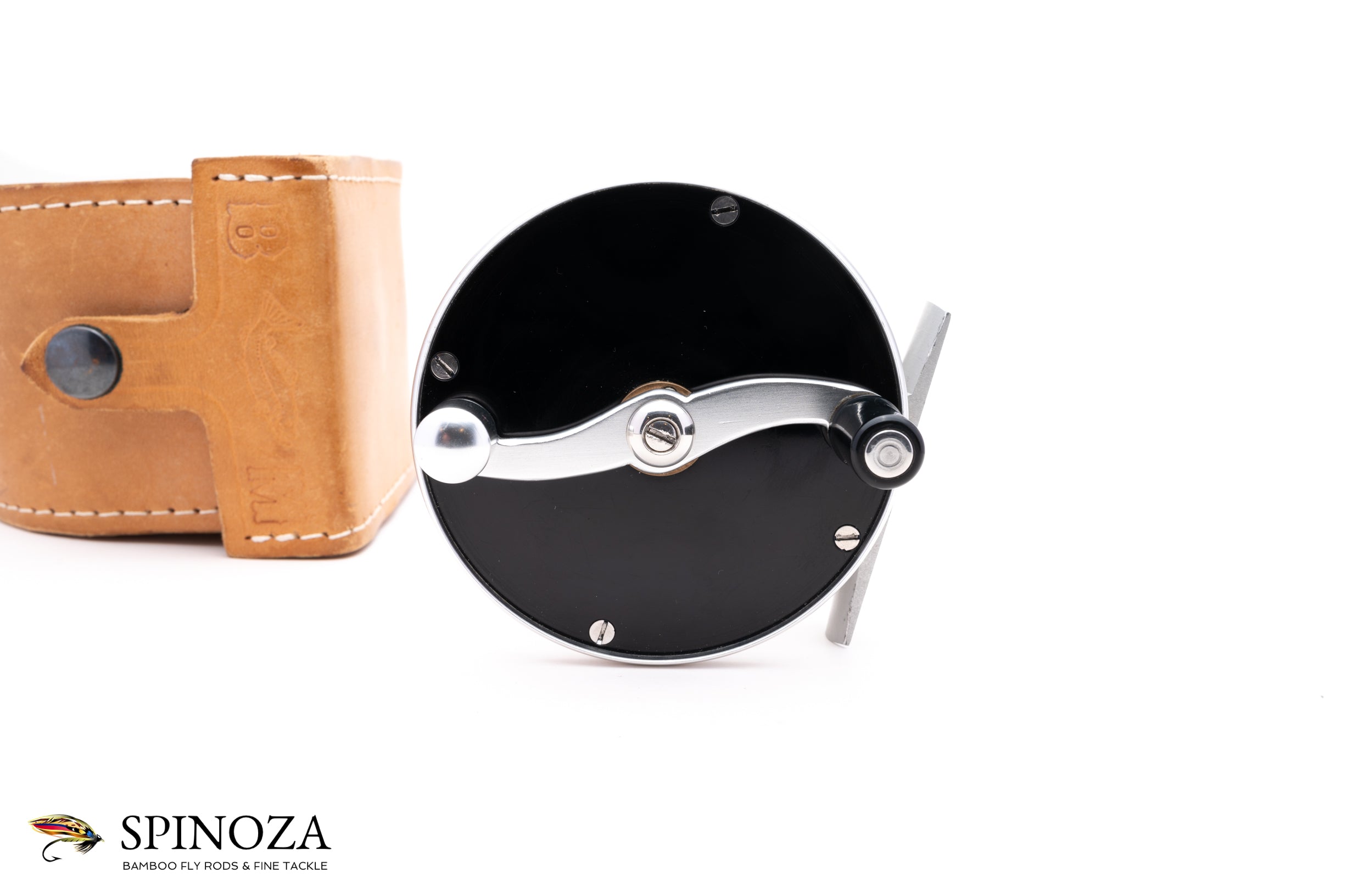 A nice Bo Mohlin Trout reel, approximately 3 1/4" diameter and set up for LHW. The reel weighs 6.4 ounces on my scale. Lightly used condition with a couple of nicks and light rim rash in a few spots, but the reel is pretty clean overall. Smooth black anodized aluminum sideplates and aluminum rings. The reel has a classic fixed click check, with a pleasing sound in both directions. This reel should hold 5 to 7 weight lines plus plenty of backing. The late Mr. Mohlin made very nice classic-styled reels at an affordable price. The reel comes in a leather block case with the initials "B" and "M" stamped into the lid edge along with a depiction of a trout.