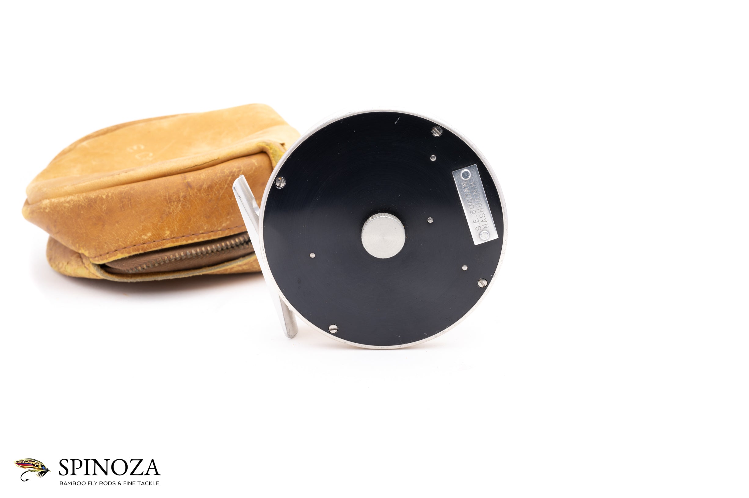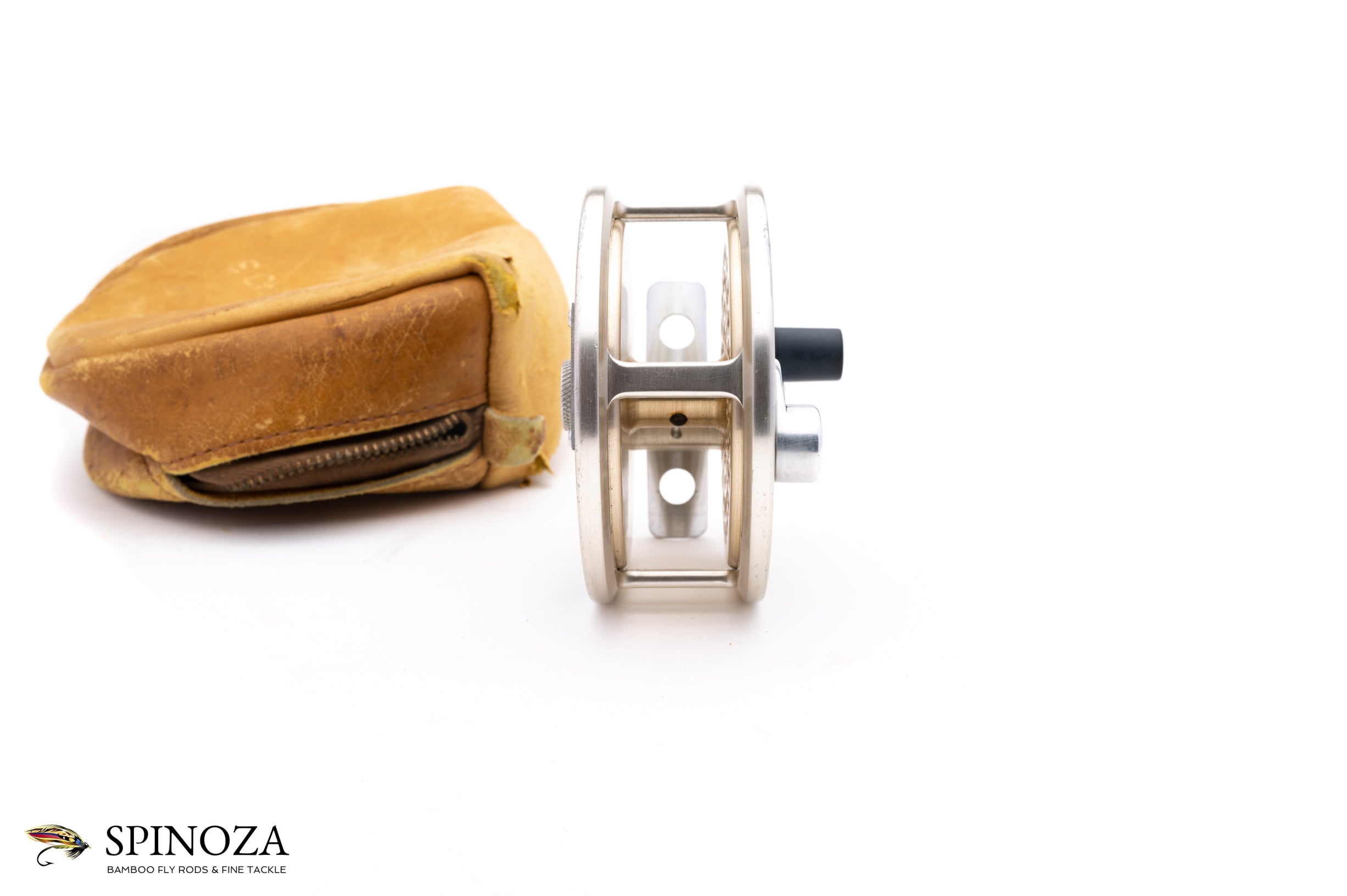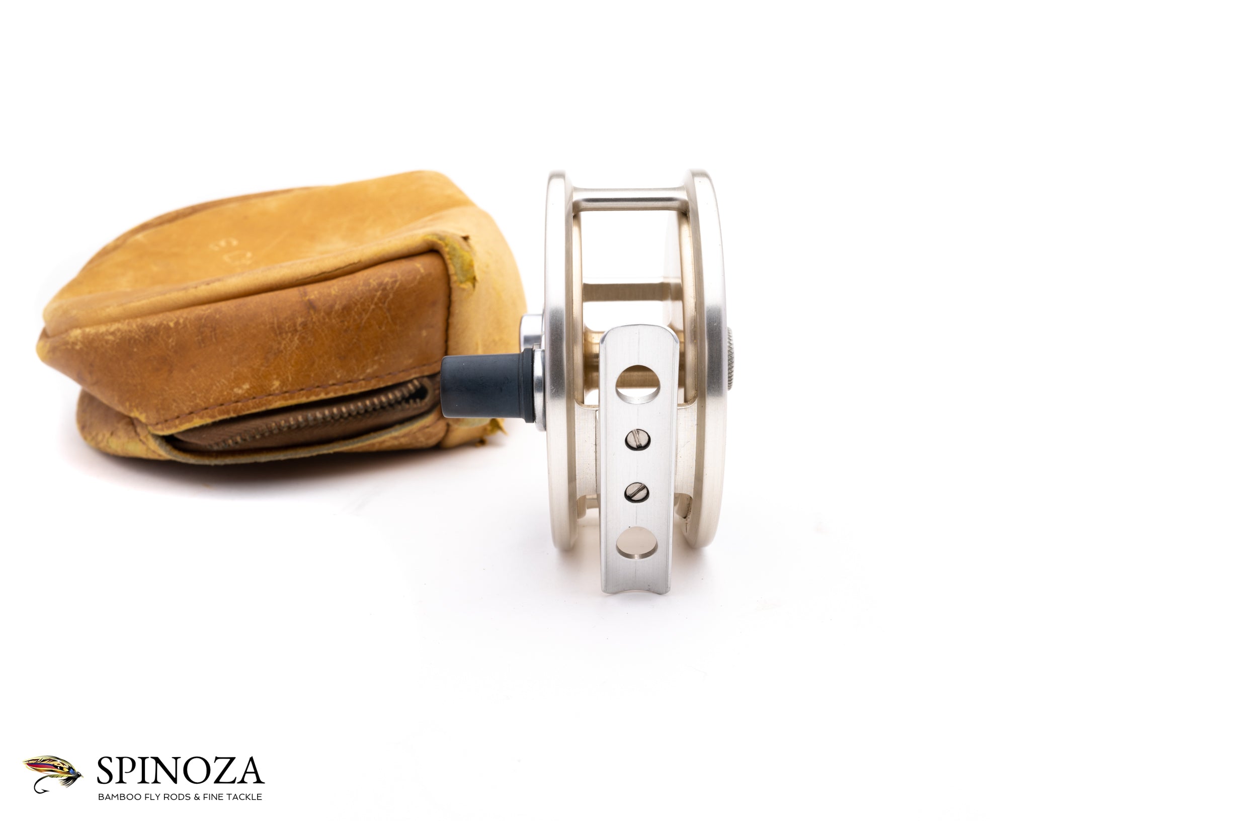 A nice Bogdan Large Trout reel, set up for LHW. 3 1/4" in diameter with a 31/32" spool width. 5.3 ounces in weight and with capacity to hold lines up to a #7 with 50 yards of 20# backing. Good used condition with some rim rash on the frame edges and a few small scratches on the outer part of the backplate but pretty good shape overall. Click and pawl fixed drag with a nice pleasing click. Aluminum silver frame, spool, foot, handle, oil port cover, and Bogdan nameplate. Black anodized aluminum sideplates. Comes in a non-original leather zipper pouch.
