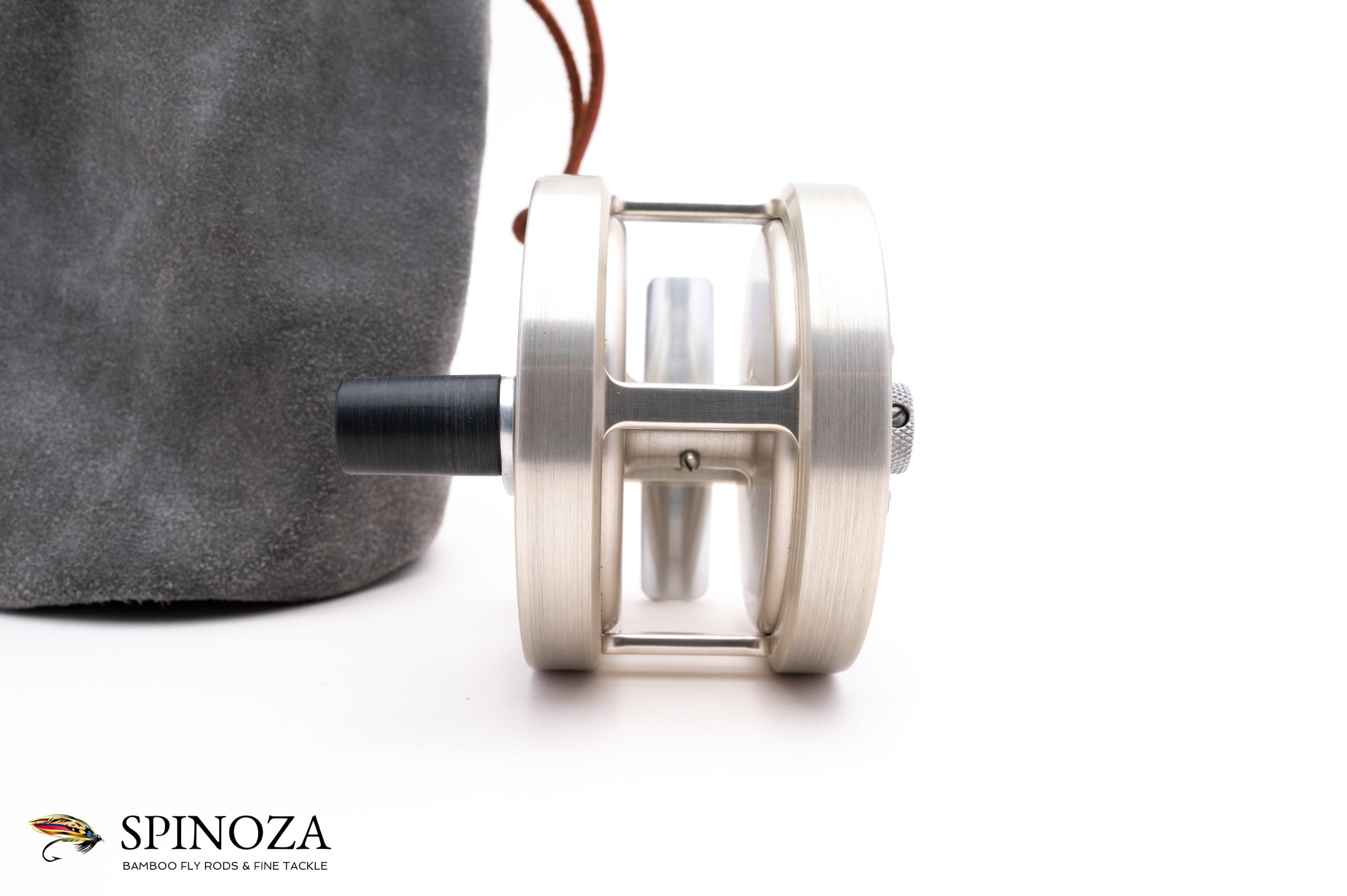 A Bogdan 00 salmon reel with a 3 1/4" diameter, set up for RHW, is available. This 00 model is one of Stan's lighter designs, specifically made to accommodate a #7 line for grilse or large sea trout. It weighs 10.1 ounces according to my scale and is in mint unused condition. The frame and spool are silver anodized, while the sideplates are black. The crank, foot, oil port cover, poacher's knob, and Bogdan nameplate are clear anodized. The backplate features the original owner's name professionally engraved in a block script, along with an engraved caricature of Al Ellis, a well-known figure in the Arizona fly fishing community. I have been informed that Al Ellis helped procure reels for friends and customers. The reel has a 2:1 multiplying retrieve and is equipped with the renowned Bogdan double brake drag. It comes with an original gray suede drawstring pouch, which I believe to be the original packaging. This reel is a prime example of one of Bogdan's finest reels for single-handed rods.